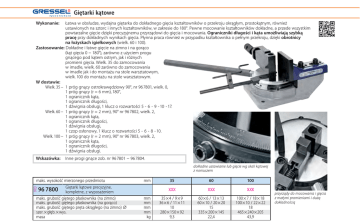 Giętarki kątowe Łatwa w obsłudze, wydajna giętarka do dokładnego gięcia kształtowników o przekroju okrągłym, prostokątnym, również ustawionych na sztorc i innych kształtowników, w zakresie do 180°. Pewne mocowanie kształtowników dokładne, a przede wszystkim powtarzalne gięcie dzięki precyzyjnemu przyrządowi do gięcia i mocowania. Ograniczniki długości i kąta umożliwiają szybką pracę przy dokładnych wynikach gięcia. Płynna praca również w przypadku kształtownika o pełnym przekroju, dzięki obrotnicy na łożyskach igiełkowych (wielk. 60 i 100). Zastosowanie: Dokładne i łatwe gięcie na zimno i na gorąco (kąt gięcia 0 − 180°), zarówno z użyciem progu gnącego pod kątem ostrym, jak i różnych promieni gięcia. Wielk. 35 do zamocowania w imadle, wielk. 60 zarówno do zamocowania w imadle jak i do montażu na stole warsztatowym, wielk. 100 do montażu na stole warsztatowym. W dostawie: Wielk. 35 – 1 próg gnący ostrokrawędziowy 90°, nr 967801, wielk. 0, 1 próg gnący (r = 6 mm), 180°, 1 ogranicznik kąta, 1 ogranicznik długości, 1 dźwignia obsługi, 1 klucz o rozwartości 5 - 6 - 9 - 10 - 17. Wielk. 60 – 1 próg gnący (r = 2 mm), 90° nr 967802, wielk. 2, 1 ogranicznik kąta, 1 ogranicznik długości, 1 dźwignia obsługi, 1 czop osłonowy, 1 klucz o rozwartości 5 - 6 - 8 - 10. Wielk. 100 – 1 próg gnący (r = 2 mm), 90° nr 967803, wielk. 2, 1 ogranicznik kąta, 1 ogranicznik długości, 1 dźwignia obsługi. Wykonanie: Wskazówka: Inne progi gnące zob. nr 967801 − 967804. dokładne ustawianie lub gięcie wg skali kątowej z noniuszem mm 97D maks. wysokość mierzonego przedmiotu kątowe precyzyjne, 96 7800 Giętarki kompletne, z wyposażeniem maks. grubość giętego płaskownika (na zimno) maks. grubość giętego płaskownika (na gorąco) maks. grubość giętego pręta okrągłego (na zimno) ⌀ szer.×głęb.×wys. masa mm mm mm mm kg 35 60 100 XXX XXX XXX 35×4 / 9×9 36×6 / 11×11 10 280×150×92 9,3 60×6 / 13×13 60×10 / 20×20 15 335×200×145 22,4 100×7 / 18×18 100×10 / 22×22 18 465×240×205 43,9 przyrządy do mocowania i gięcia z małymi promieniami i dużą dokładnością