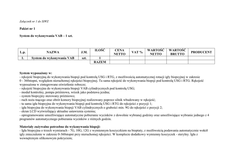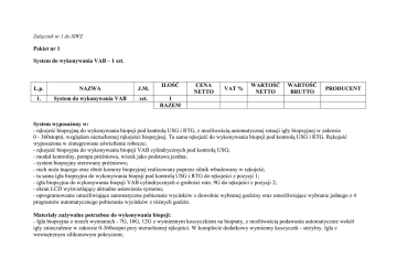 Załącznik nr 1 do SIWZ Pakiet nr 1 System do wykonywania VAB – 1 szt. L.p. NAZWA J.M. 1. System do wykonywania VAB szt. ILOŚĆ CENA NETTO VAT % WARTOŚĆ NETTO WARTOŚĆ BRUTTO PRODUCENT 1 RAZEM System wyposaŜony w: - rękojeść biopsyjną do wykonywania biopsji pod kontrolą USG i RTG, z moŜliwością automatycznej rotacji igły biopsyjnej w zakresie 0 - 360stopni, względem nieruchomej rękojeści biopsyjnej. Ta sama rękojeść do wykonywania biopsji pod kontrolą USG i RTG. Rękojeść wyposaŜona w zintegrowane oświetlenie robocze; - rękojeść biopsyjna do wykonywania biopsji VAB cylindrycznych pod kontrolą USG; - moduł kontrolny, pompa próŜniowa, wózek jako podstawa jezdna; - system biopsyjny sterowany próŜniowo; - ruch noŜa tnącego oraz obrót komory biopsyjnej realizowany poprzez silnik wbudowany w rękojeść; - ta sama igła biopsyjna do wykonywania biopsji pod kontrolą USG i RTG do rękojeści z pozycji 1; - igła biopsyjna do wykonywania biopsji VAB cylindrycznych o grubości min. 9G do rękojeści z pozycji 2; - ekran LCD wyświetlający aktualne ustawienia systemu; - oprogramowanie umoŜliwiające automatyczne pobieranie wycinków z dowolnie wybranej godziny oraz umoŜliwiające wybranie jednego z 4 programów automatycznego pobierania wycinków z róŜnych godzin. Materiały zuŜywalne potrzebne do wykonywania biopsji: - Igła biopsyjna o trzech wymiarach - 7G, 10G, 12G z wymiennym koszyczkiem na bioptaty, z moŜliwością podawania automatycznie wokół igły znieczulenie w zakresie 0-360stopni przy nieruchomej rękojeści. W komplecie dodatkowy wymienny koszyczek - sterylny. Igła z wewnętrznym silikonowym pokryciem; - igła do biopsji VAB-cylindrycznych wyposaŜona w centralnie umieszczony kanał ssący pozwalająca na pobranie wycinków ze środka bioptowanej zmiany, w postaci cylindrów o długości 20mm. WyposaŜona w obturator pozwalający na ponowne pobranie wycinka z tego samego miejsca z zaznaczoną podziałką głębokości; - kubełek próŜniowy; - zestaw drenów ssąco-płuczących; - znacznik tkankowy. Pakiet nr 2 Aparat do szybkiego przetaczania płynów – 3 szt. L.p. NAZWA J.M. 1. Aparat do szybkiego przetaczania płynów szt. ILOŚĆ CENA NETTO VAT % WARTOŚĆ NETTO WARTOŚĆ BRUTTO PRODUCENT 3 RAZEM Parametry: - Manometr wytwarzanego ciśnienia w rękawie. - Pompka ręczna do worka powietrznego z zaworem spustowym. - Zakres pomiarów: 0- 600mmHg - Zakres ciśnienia roboczego: 0-300mmHg. - Dokładność: +/- 6mm Hg - Podziałka skali: 10mmHg. - Rozmiary mankietów do worków – 500ml. i 1000ml. - Jedna część rękawa wykonana z materiału umoŜliwiającego obserwację płynu infuzyjnego. - MoŜliwość zawieszania płynu infuzyjnego. - MoŜliwość zawieszania płynu na statywie. - MoŜliwość wymiany worka powietrznego. - MoŜliwość czyszczenia termicznego mankietu aparatu (min. 60 st C). - MoŜliwość dezynfekcji manometru aparatu. Autoryzowany serwis gwarancyjny i pogwarancyjny na terenie Polski.( Podać adres.) Serwis gwarancyjny min. 24 miesięc miesi ce .W okresie gwarancji 3 naprawy powodują wymianę podzespołu na nowy. Serwis pogwarancyjny - podać koszt 1-roboczogodziny wraz z dojazdem serwisu pogwarancyjnego Pakiet nr 3 Stanowisko do reanimacji noworodka – 1 szt. L.p. NAZWA J.M. 1. Stanowisko do reanimacji noworodka szt. ILOŚĆ CENA NETTO VAT % WARTOŚĆ NETTO 1 RAZEM Parametry: - zamocowana do stanowiska butla z tlenem i spręŜonym powietrzem - Ŝelowy i antyodleŜynowy materacyk, - aparat do resuscytacji manualnej, - półka na kardiomonitor, - moŜliwość regulacji temperatury od 30 do 38,5 stopni C, - urządzenie grzewcze pod Ŝelowym podkładem - ogrzewacz promiennikowy na podczerwień - odległość promiennika od materacyka do 68 cm, - duŜy zakres regulacji wysokości, - ustawienie łóŜeczka w róŜnych pozycjach, - ścianki z moŜliwością opuszczania i podnoszenia jedną ręką, - kółka samonastawne z moŜliwością blokady, - stolik umoŜliwiający połoŜnie pacjenta z wagą do 10 kg, - zasilanie prądem zmiennym 230 +/- 20 V AC 50/60 Hz - moŜliwość przesuwania / obracania ogrzewacza promiennikowego w przypadku zdjęcia RTG WARTOŚĆ BRUTTO PRODUCENT Wymiary : - moduł podnośnika elektrycznego: 174 do 189 cm, - moduł ustawionej wysokości: 174, 180, 189 Szerokość : - 77 cm bez półek Głębokość: - 111 do 120 cm ZaleŜne od wysokości i zamontowanych akcesoriów Pakiet nr 4 ŁóŜka dla dzieci przedszkolnych – 12 szt. L.p. NAZWA J.M. 1. ŁóŜka dla dzieci przedszkolnych szt. ILOŚĆ CENA NETTO VAT % WARTOŚĆ NETTO WARTOŚĆ BRUTTO 12 RAZEM Parametry: - wykonane ze stali węglowej pokryte lakierem poliestrowo-epoksydowym w kolorze białym - wyposaŜone w krąŜki odbojowe oraz cztery kółka jezdne z indywidualną blokadą średnica 15 cm - leŜe wypełnione siatką metalową dodatkowo wzmocnione płaskownikami oraz ruchomym wezgłowiem i od strony nóg - wysokość od podłogi 57 cm, długość 150 cm, szerokość 75 cm - wysokość barierki zabezpieczającej 40 cm - barierki boczne (zabezpieczające) opuszczane z blokadami skokowymi - materac dopasowany do łóŜka z pokrowcem z tkaniny zmywalnej paro przepuszczalnej - wymiary materaca długość 147 cm, szerokość 72 cm, wysokość 15 cm. PRODUCENT