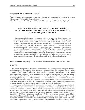 Aktualne Problemy Biomechaniki, nr 10/2016 63 Justyna SMÓŁKA1, Marcin BASIAGA2 1 SKN Inżynierii Biomateriałów „Synergia”, Katedra Biomateriałów i Inżynierii Wyrobów Medycznych, Politechnika Śląska, Zabrze 2 Katedra Biomateriałów i Inżynierii Wyrobów Materiałowych, Politechnika Śląska, Zabrze WPŁYW PROCESU STERYLIZACJI NA WŁASNOŚCI ELEKTROCHEMICZNE STALI 316 LVM Z WARSTWĄ TiO2 NANIESIONĄ METODĄ ALD Streszczenie: Celem pracy była ocena wpływu procesu sterylizacji parowej na własności fizykochemiczne umocnionej stali 316 LVM pokrytej warstwą TiO2 metodą ALD z różną liczbą cykli nanoszenia (500, 1250, 2500). W celu oceny zjawisk zachodzących na powierzchni badanej stali przeprowadzono badania odporności na korozję wżerową oraz badanie z wykorzystaniem elektrochemicznej spektroskopii impedancyjnej. Badania realizowano w roztworze Ringera w temperaturze 37 ± 1oC. W przeprowadzonych badaniach korozyjnych wyznaczono krzywe polaryzacji anodowej, które każdorazowo charakteryzują się obecnością pętli histerezy świadczącej o zainicjowaniu korozji wżerowej w badanym materiale. Z kolei badanie EIS wykazały, że wzrost liczby cykli nanoszenia warstwy wpływa niekorzystnie na jej własności barierowe. Słowa kluczowe: sterylizacja, ALD, własności elektrochemiczne, TiO2, stal 316 LVM 1. WSTĘP Co raz częstsza potrzeba stosowania różnorodnych implantów podczas zabiegów chirurgii rekonstrukcyjnej, zabiegowej czy protetyki, spowodowana jest między innymi przez obniżający się wiek pacjentów użytkujących implanty, wzrastającą grupę osób z uszkodzeniami narządu ruchu wynikającymi z urazów, przeciążeń czy też wypadków komunikacyjnych. Materiał przeznaczony na implanty powinien charakteryzować się biokompatybilnością, odpowiednimi własnościami wytrzymałościowymi i fizykochemicznymi, a także nie powinien powodować alergii, odczynów czy chronicznych reakcji [1]. Dlatego, też w dalszym ciągu pracuje się nad doborem odpowiedniego materiału i rodzaju obróbki, aby spełnić większość wymagań stawianych implantom. Nieustanna potrzeba doskonalenia powierzchni implantów powoduje, że przeprowadza się wiele modyfikacji powierzchni. Za ich przyczyną możliwe jest przedłużenie żywotności i trwałości implantu, a także ochrona przed agresywnym środowiskiem tkankowym, czy korozją wżerową. Istnieje wiele metod modyfikacji powierzchni biomateriałów metalowych. Do najczęściej stosowanych zalicza się pasywację anodową, metodę sol-gel, physical vapor deposition (PVD)czy utlenianie anodowe. Wyżej wymienione metody modyfikacji powierzchni biomateriałów metalowych poprzez naniesienie warstw tlenkowych powodują korzystną zmianę ich własności fizykochemicznych. Jedyną wadą tych metod jest brak możliwości zapewnienia stałej grubości warstwy na geometrii o zminiaturyzowanej postaci 64 J. Smółka, M. Basiaga implantu. Dlatego też do tego typu zastosowań wydaje się być uzasadnione wykorzystanie metody ALD (Atomic Layer Deposition), która pozwala na niezmienność cech geometrycznych powierzchni na które nakładana jest warstwa. Metoda ta posiada także inne zalety, a mianowicie: powtarzalność procesu, możliwość osadzania warstw bardzo cienkich rzędu kilku nanometrów oraz możliwość osadzania warstw w niskich temperaturach [1, 7]. Podstawowym warunkiem sukcesu, przeprowadzania procesów sekwencyjnego osadzania warstw atomowych, jest odpowiedni dobór prekursorów. Jednym z najczęściej stosowanych tego typu materiałów jest dwutlenek tytanu (TiO2) [1]. Wcześniejsze badania autorów pracy wykazały poprawę własności fizykochemicznych próbek z naniesiona warstwa TiO2 metodą ALD w porównaniu do próbek bez warstwy (podłoże) [8]. Jednakże dane literaturowe wskazują na szereg nie zdefiniowanych zjawisk towarzyszących wytwarzaniu warstw TiO2 metodą ALD [5,7] na powierzchniach materiałów metalowych. Wciąż nierozwiązanym problemem pozostaje wpływ sterylizacji medycznej na własności elektrochemiczne naniesionej warstwy. Z tego też powodu w niniejszej pracy przeprowadzono analizę wpływu procesu sterylizacji parowej na własności elektrochemiczne stali 316 LVM z naniesioną warstwą TiO2 metodą ALD. 2. MATERIAŁ I METODYKA BADAŃ Do badań wykorzystano umocnioną stal 316 LVM w postaci pręta o ϕ=14mm. Próbki w postaci krążków o grubości g=3mm, w celu uzyskania jednolitej chropowatości (Ra ≤ 0,16 μm) poddano procesowi szlifowania na automacie Struers LaboPol–25 z wykorzystaniem papierów ściernych o gradacji 500. Następnie przeprowadzono polerowanie mechaniczne. Zabieg wykonano z wykorzystaniem tarcz polerskich przy użyciu urządzenia do polerowania Struers Tegramin–30. W dalszej kolejności wypolerowane próbki poddano pasywacji chemicznej polegającej na zanurzeniu próbek w 45% roztworze kwasu HNO3 w temperaturze T=60oC w czasie t=60minut. Ostatnim etapem przygotowywania próbek było naniesienie warstwy TiO2 metodą ALD z wykorzystaniem urządzenia PicoSun. Do nanoszenia warstwy TiO2 użyto prekursorów w postaci TiCl4 i H2O. Proces nanoszenia prowadzono przy zmiennej liczbie cykli 500 ÷ 2500 w stałej temperaturze 200°C. W końcowym etapie tak przygotowane próbki poddano procesowi sterylizacji parowej pod ciśnieniem w temperaturze T=135°C i ciśnieniu p=2,1 bar w autoklawie BAISIC (10 cykli). 2.1 Badanie odporności na korozję wżerową Badanie odporności na korozję wżerową przeprowadzono z wykorzystaniem metody potencjodynamicznej rejestracji krzywej polaryzacji na stanowisku pomiarowym zbudowanym z potencjostatu PGP 201 firmy Voltalab wraz z zestawem elektrod: elektroda odniesienia NEK – nasycona elektroda kalomelowa, elektroda pomocnicza - platynowa, elektroda badana w postaci próbki ze stali 316 LVM. Badanie korozyjne rozpoczęto od wyznaczenia potencjału otwarcia Eocp w warunkach bezprądowych. W dalszej kolejności rejestrowano krz