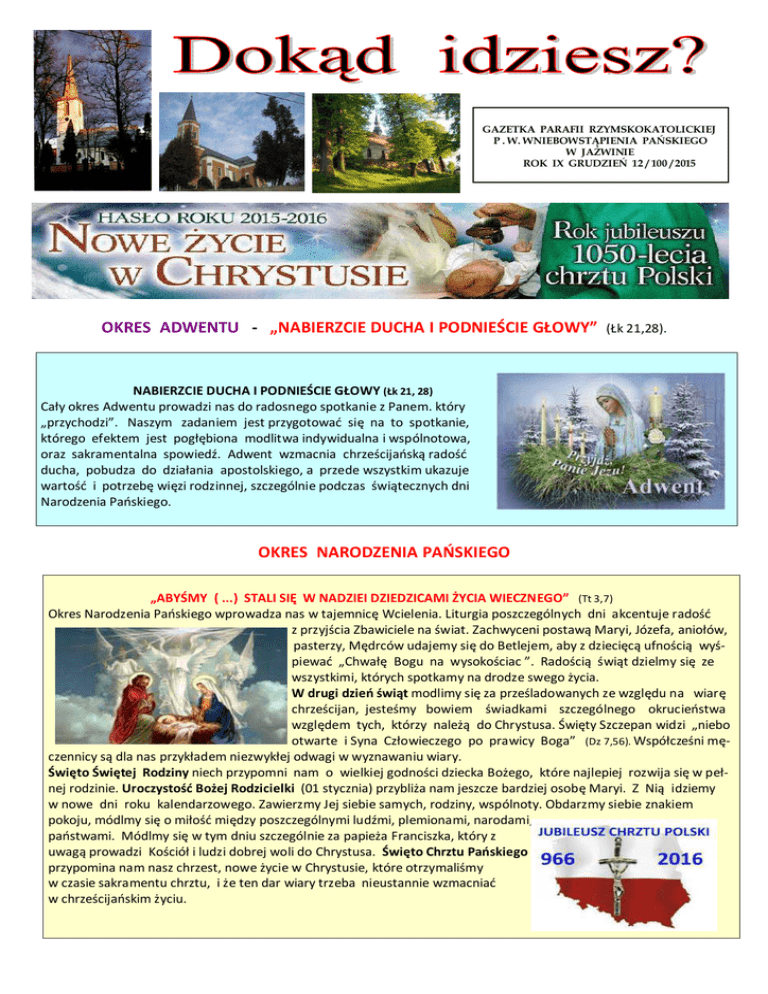 GAZETKA PARAFII RZYMSKOKATOLICKIEJ P . W. WNIEBOWSTĄPIENIA PAŃSKIEGO W JAśWINIE ROK IX GRUDZIEŃ 12 / 100 / 2015 OKRES ADWENTU - „NABIERZCIE DUCHA I PODNIEŚCIE GŁOWY” (Łk 21,28). NABIERZCIE DUCHA I PODNIEŚCIE GŁOWY (Łk 21, 28) Cały okres Adwentu prowadzi nas do radosnego spotkanie z Panem. który „przychodzi”. Naszym zadaniem jest przygotować się na to spotkanie, którego efektem jest pogłębiona modlitwa indywidualna i wspólnotowa, oraz sakramentalna spowiedź. Adwent wzmacnia chrześcijańską radość ducha, pobudza do działania apostolskiego, a przede wszystkim ukazuje wartość i potrzebę więzi rodzinnej, szczególnie podczas świątecznych dni Narodzenia Pańskiego. OKRES NARODZENIA PAŃSKIEGO „ABYŚMY ( ...) STALI SIĘ W NADZIEI DZIEDZICAMI ŻYCIA WIECZNEGO” (Tt 3,7) Okres Narodzenia Pańskiego wprowadza nas w tajemnicę Wcielenia. Liturgia poszczególnych dni akcentuje radość z przyjścia Zbawiciele na świat. Zachwyceni postawą Maryi, Józefa, aniołów, pasterzy, Mędrców udajemy się do Betlejem, aby z dziecięcą ufnością wyśpiewać „Chwałę Bogu na wysokościac ”. Radością świąt dzielmy się ze wszystkimi, których spotkamy na drodze swego życia. W drugi dzień świąt modlimy się za prześladowanych ze względu na wiarę chrześcijan, jesteśmy bowiem świadkami szczególnego okrucieństwa względem tych, którzy należą do Chrystusa. Święty Szczepan widzi „niebo otwarte i Syna Człowieczego po prawicy Boga” (Dz 7,56). Współcześni męczennicy są dla nas przykładem niezwykłej odwagi w wyznawaniu wiary. Święto Świętej Rodziny niech przypomni nam o wielkiej godności dziecka Bożego, które najlepiej rozwija się w pełnej rodzinie. Uroczystość Bożej Rodzicielki (01 stycznia) przybliża nam jeszcze bardziej osobę Maryi. Z Nią idziemy w nowe dni roku kalendarzowego. Zawierzmy Jej siebie samych, rodziny, wspólnoty. Obdarzmy siebie znakiem pokoju, módlmy się o miłość między poszczególnymi ludźmi, plemionami, narodami, państwami. Módlmy się w tym dniu szczególnie za papieża Franciszka, który z uwagą prowadzi Kościół i ludzi dobrej woli do Chrystusa. Święto Chrztu Pańskiego to dzień, który przypomina nam nasz chrzest, nowe życie w Chrystusie, które otrzymaliśmy w czasie sakramentu chrztu, i że ten dar wiary trzeba nieustannie wzmacniać w chrześcijańskim życiu. „ Syn BoŜy stał się człowiekiem, abyśmy my mogli stać się dziećmi BoŜymi”. KaŜdy z nas powinien udać się do szopki i złoŜyć Jezusowi swoje dary. Jezus czeka na nie. Do kaŜdego z nas powie: Przyszedłem do ciebie, aby dodać ci sił i odwagi; aby ci wszystko przebaczyć. Bądź dobrym człowiekiem! Jezus czeka na nas, na spotkanie z nami. Takiego spotkania Ŝyczę na te święta. Niech Ten, który przychodzi zabierze wszystko, co jest naszym niepokojem, co lękiem napawa. Niech Ten, który przychodzi zabierze wszystko, co nie jest jeszcze odbiciem Jego Miłości. Niech Ten, który przychodzi napełni nas swoim Pokojem, Dobrocią i Bezpieczeństwem, by nasza Wiara stała się prosta, odwaŜna, zdecydowana – jak wiara św. Piotra, a zarazem inteligentna, głęboka, nie bojąca się konfrontacji z coraz to trudniejszymi wyzwaniami współczesności – jak wiara św. Pawła . Potrzebujemy takiej Wiary, „która moŜe być dla nas fundamentem, na którym moŜna oprzeć całe Ŝycie. Tego Ŝyczę w te święta, które przypominają prawdę, Ŝe Bóg stał się człowiekiem, abyśmy my mogli stać się dziećmi BoŜymi. Ks. Stanisław 02 – 06. 12. 2015 to dni obecności Figury Matki Bożej Fatimskiej w naszej parafii i dni maryjnych rekolekcji. Prowadził je O. Piotr franciszkanin z Zielonej Góry. Były to dni refleksji nad fatimskim apelem, który Maryja wypowiedziała do ubogich pastuszków w Fatimie w 1917 r. Jak ciągle aktualne są te słowa: Nawróćcie się, czyńcie pokutę i módlcie się. W Jaźwinie uroczystość peregrynacyjna rozpoczęła się od powitania Figury Fatimskiej o godz. 17.30 . W blasku świec wniesiono ją do kościoła. Tu została uroczyście powitana przez ks. Proboszcza, rodziców, młodzież i dzieci rozpoczęła się uroczysta Eucharystia pod przewodnictwem Księdza Biskupa Ignacego Deca. Godz. 21. 00 - to wieczorny Apel Fatimski z procesją światła. Sobota była dniem odnowienia przyrzeczeń ślubnych dla małżonków. Przeżyli wzruszające chwile .W niedzielę po Mszy św. o 8.00 błogosławieństwo otrzymały dzieci i matki w błogosławionym stanie. W piątek 4.12. o godz. 14.30 Matka Boża Fatimska w swym znaku powędrowała do Stoszowa. Tam była Koronka do Miłosierdzia Bożego, Różaniec i Msza św., by o 17.15 udać się do Uciechowa. Parafia Rymskokatolicka p.w. Wniebowstąpienia Pańskiego w Jaźwinie. MSZE ŚW. W NIEDZIELE I ŚWIĘTA: Jaźwina g. 8. 00 i 12. 15 Uciechów g. 9. 30 Stoszów g. 11. 00 DUSZPASTERSTWO CHORYCH: Chorych odwiedzę w Jaźwinie w środa 16.12.2015 od. g. 10. 30; w Uciechowie w czwartek 17.12.2015 od. g. 10. 30 MOśLIWOŚĆ PRZYSTĄPIENIA DO SPOWIEDZI w sobotę 19.12. 2015 Jaźwina 17.00 – 18.00 Uciechów 17.00 – 18.00 Stoszów 16. 00 – 16. 30 BOśE NARODZENIE 25.12.2014 Msza Pasterska: Jaźwina 22 . 00 Uciechów 24. 00 Msza w dzień: Uciechów 9.30, Stoszów 11.00 Jaźwina 12.15 ŚW. SZCZEPANA 26.12. 2014 Jaźwina 8. 00 i 12. 15; Uciechów 9.30; Stoszów 11. 00 CHRZTY - w grudniu w Boże Narodzenie w Jaźwinie o godz. 12.15 oraz - w drugie niedziele kaŜdego miesiąca - chrzest naleŜy zgłosić dwa tygodnie przed tą uroczystością. Wymagane dokumenty: - świadectwo urodzenia dziecka z USC; -zaświadczenie rodziców chrzestnych, Ŝe są praktykującymi katolikami. Po zaświadczenie zgłaszamy się do księdza w miejscu aktualnego zamieszkania . świadectwo ślubu kościelnego jeŜeli małŜeństwo zostało zawarte poza naszą parafią. Chrzestni jeśli nie są z naszej parafii powinni dostarczyć zaświadczenie od swego Księdza 