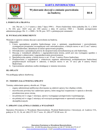 KARTA INFORMACYJNA Wydawanie decyzji o zmianie pozwolenia na budowę BI-8 Powiat Wysokomazowiecki I. PODSTAWA PRAWNA Art. 36a ust. 1, 3 i 5 ustawy z dnia 7 lipca 1994 r. - Prawo budowlane /tekst jednolity Dz. U. z 2010 r. Nr 243, poz. 1623/ oraz art. 104 ustawy z dnia 14 czerwca 1960 r. - Kodeks postępowania administracyjnego /Dz. U. z 2000 r. Nr 98, poz. 1071 z późniejszymi zmianami/. II. WYMAGANE DOKUMENTY Wniosek w sprawie zmiany decyzji o pozwoleniu na budowę. Załączniki: 1. Cztery egzemplarze projektu budowlanego wraz z opiniami, uzgodnieniami i pozwoleniami, wymaganymi przepisami szczególnymi oraz zaświadczeniem, o którym mowa w art.12 ust.7 ustawy Prawo budowlane, aktualnym na dzień opracowania projektu, 2. Oświadczenie o posiadanym prawie do dysponowania nieruchomością na cele budowlane, 3. Decyzję o warunkach zabudowy i zagospodarowania terenu, jeżeli jest ona wymagana zgodnie z przepisami o planowaniu i zagospodarowaniu przestrzennym 4. Specjalistyczną opinię, o której mowa w art. 33 ust. 3 ustawy Prawo budowlane 5. Postanowienie o uzgodnieniu z właściwym organem administracji architektoniczno budowlanej projektowanych rozwiązań w zakresie, o którym mowa w art. 33 ust.2 pkt 4 ustawy Prawo Budowlane. 6. Upoważnienie udzielone osobie działającej w imieniu inwestora. III. OPŁATY Nie podlegają opłacie skarbowej. IV. TERMIN ZAŁATWIENIA SPRAWY Terminy załatwiania sprawy określa art. 35 kpa: organy administracji publicznej obowiązane są załatwić sprawy bez zbędnej zwłoki, niezwłocznie powinny być załatwiane sprawy, które mogą być rozpatrzone w oparciu o dowody przedstawione przez stronę, nie później niż w ciągu 1 miesiąca, sprawy wymagające postępowania wyjaśniającego, nie później niż w ciągu 2 miesięcy od wszczęcia postępowania w sprawach szczególnie skomplikowanych. V. SPRAWY ZAŁATWIA I UDZIELA WYJAŚNIEŃ Starostwo Powiatowe w Wysokiem Mazowieckiem, Wydział Budownictwa i Inwestycji, ul. Ludowa 15A, pokój nr 32, 33, 34, tel. (86) 275 24 17 wew. 41, (86) 477 02 00 wew. 41 Starostwo Powiatowe w Wysokiem Mazowieckiem ul. Ludowa 15A, 18-200 Wysokie Mazowieckie; tel. 86 477 02 00; 86 275 24 17 www.wysokomazowiecki.pl, e-mail: [email protected]. KARTA INFORMACYJNA Wydawanie decyzji o zmianie pozwolenia na budowę BI-8 Powiat Wysokomazowiecki Niezbędne dokumenty należy złożyć w Kancelarii Ogólnej (parter – pokój nr 6) Starostwa Powiatowego w Wysokiem Mazowieckiem, ul. Ludowa 15A, ( pn. - 800– 1600 - pt. 730– 1530). VI. TRYB ODWOŁAWCZY Odwołanie wnosi się do Wojewody Podlaskiego za pośrednictwem Starosty Wysokomazowieckiego w terminie 14 dni od dnia doręczenia decyzji stronie. Opłata skarbowa: Nie podlega opłacie skarbowej. VII. UWAGI W przypadku braku kompletu wymaganych dokumentów wnioskodawca zostanie wezwany przez organ do ich uzupełnienia w określonym terminie, a po jego bezskutecznym upływie otrzyma decyzję o odmowie zatwierdzenia projektu zamiennego i udzielenia pozwolenia na zmianę decyzji o pozwoleniu na budowę. Nieistotne odstąpienie od zatwierdzonego projektu budowlanego lub innych warunków pozwolenia na budowę nie wymaga uzyskania decyzji o zmianie pozwolenia na budowę i jest dopuszczalne, o ile nie dotyczy: 1) zakresu objętego projektem zagospodarowania działki lub terenu, 2) charakterystycznych parametrów obiektu budowlanego: kubatury, powierzchni zabudowy, wysokości, długości, szerokości i liczby kondygnacji, 3) zapewnienia warunków niezbędnych do korzystania z tego obiektu przez osoby niepełnosprawne, 4) zmiany zamierzonego sposobu użytkowania obiektu budowlanego lub jego części, 5) ustaleń miejscowego planu zagospodarowania przestrzennego lub decyzji o warunkach za budowy i zagospodarowania terenu oraz nie wymaga uzyskania opinii, uzgodnień, pozwoleń i innych dokumentów, wymaganych przepisami szczególnymi. Starostwo Powiatowe w Wysokiem Mazowieckiem ul. Ludowa 15A, 18-200 Wysokie Mazowieckie; tel. 86 477 02 00; 86 275 24 17 www.wysokomazowiecki.pl, e-mail: [email protected].