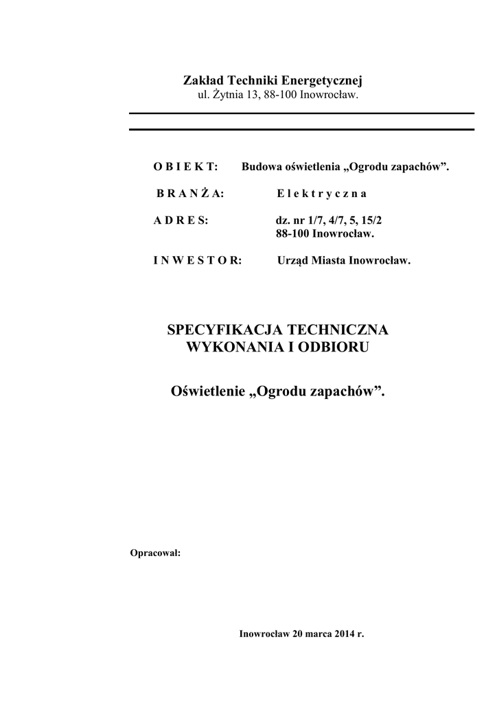 Zakład Techniki Energetycznej ul. Żytnia 13, 88-100 Inowrocław. O B I E K T: Budowa oświetlenia „Ogrodu zapachów”. B R A N Ż A: Elektryczna A D R E S: dz. nr 1/7, 4/7, 5, 15/2 88-100 Inowrocław. I N W E S T O R: Urząd Miasta Inowrocław. SPECYFIKACJA TECHNICZNA WYKONANIA I ODBIORU Oświetlenie „Ogrodu zapachów”. Opracował: Inowrocław 20 marca 2014 r. 2 SPIS TREŚCI 1. WSTĘP ..................................................................................................... 2 2. MATERIAŁY........................................................................................... 3 3. SPRZĘT .................................................................................................... 4 4. TRANSPORT ........................................................................................... 4 5. WYKONANIE ROBÓT .......................................................................... 6 6. KONTROLA JAKOŚCI ROBÓT .......................................................... 7 7. OBMIAR ROBÓT .................................................................................. 8 8. ODBIÓR ROBÓT ................................................................................... 9 9. PODSTAWA PŁATNOŚCI ................................................................... 9 10. PRZEPISY ZWIĄZANE .................................................................... 10 NAJWAŻNIEJSZE OZNACZENIA I SKRÓTY OST SST ITB RZE CPV - Ogólna specyfikacja techniczna - Szczegółowa specyfikacja techniczna - Instytut Techniki Budowlanej -Rejonowy Zakład Energetyczny - Wspólny Słownik Zamówień 1. WSTĘP 1.1. Przedmiot SST Przedmiotem niniejszej szczegółowej specyfikacji technicznej (SST) są wymagania dotyczące wykonania i odbioru oświetlenia „Ogrodu zapachów” w paku solankowym w Inowrocławiu. 2 3 1.2. Zakres stosowania SST Szczegółowa specyfikacja techniczna (SST) stanowi obowiązującą podstawę stosowanej jako dokument przetargowy i kontraktowy przy zlecaniu i realizacji robót. 1.3. Zakres robót objętych SST Ustalenia zawarte w niniejszej specyfikacji dotyczą zasad prowadzenia robót związanych z budową oświetlenia na dz. nr 1/7, 4/7, 5 i 15/2 w Inowrocławiu. 1.4. Określenia podstawowe 1.4.1. Słup oświetleniowy - konstrukcja wsporcza osadzona na fundamencie żelbetowej, służąca do zamocowania oprawy oświetleniowe. 1.4.2. Oprawa oświetleniowa - urządzenie służące do rozdziału, filtracji i przekształcania strumienia świetlnego wysyłanego przez źródło światła, zawierające wszystkie niezbędne detale do przymocowania i połączenia z instalacją elektryczną. 1.4.3. Kabel - przewód wielożyłowy izolowany, przystosowany do przewodzenia prądu elektrycznego, mogący pracować pod i nad ziemią. 1.4.4. Ustój - rodzaj fundamentu dla słupów oświetleniowych. - konstrukcja żelbetowa zagłębiona w ziemi, służąca do utrzymania masztu lub szafy oświetleniowej w pozycji pracy. 1.4.5. Fundament 1.4.6. Szafka oświetleniowa - urządzenie rozdzielczo-sterownicze bezpośrednio zasilające instalacje oświetleniowe. 1.4.7. Dodatkowa ochrona przeciwporażeniowa - ochrona części przewodzących dostępnych w wypadku pojawienia się na nich napięcia w warunkach zakłóceniowych. 1.5.Nazwy i kody robót. CPV.45231400-9 - roboty w zakresie energetycznych linii kablowych NN CPV 45316110-9 – instalowanie drogowego sprzętu oświetleniowego. 1.6. Ogólne wymagania dotyczące robót Wykonawca robót przed przystąpieniem do wykonania powinien przesłać do aprobaty Zmawiającego bądź Nadzoru Inwestorskiego, Program Zapewnienia Jakości. 2. MATERIAŁY 2.1. Ogólne wymagania dotyczące materiałów Wszystkie stosowane przez wykonawcę materiały dla których PN i BN przewidują posiadanie zaświadczenia o jakości lub atestu, powinny być zaopatrzone przez producenta w taki dokument. Inne materiały powinny być wyposażone w takie dokumenty na życzenie Nadzoru Inwestorskiego. 2.2. Materiały stosowane przy układaniu kabli. 2.2.1.Piasek Piasek stosowany przy układaniu kabli powinien być co najmniej gatunku „3”, odpowiadającego wymaganiom BN-87/6774-04 [24]. 2.2.2.Folia Folia służąca do osłony kabla przed uszkodzeniami mechanicznymi, powinna być folią kalandrowaną z uplastycznionego PCW o grubości od 0,4 do 0,6 mm, gatunku I, odpowiadającą wymaganiom BN-68/6353-03 [21]. 3 4 2.3. Elementy gotowe 2.3.1.Fundamenty prefabrykowane. Pod słupy oświetleniowe stalowe i szafy oświetleniowe zaleca się stosowanie fundamentów prefabrykowanych według ustaleń dokumentacji projektowej. Ogólne wymagania dotyczące fundamentów konstrukcji określone są w PN-80/B-03322 [1]. W zależności od konkretnych warunków lokalizacyjnych i rodzaju wód gruntowych, należy wykonać zabezpieczenie antykorozyjne według SST, zgodnie z „Instrukcją zabezpieczeń przed korozją konstrukcji betonowych” [35]. Składowanie prefabrykatów powinno odbywać się na wyrównanym, utwardzonym i odwodnionym podłożu, na przekładkach z drewna sosnowego. 2.3.2.Przepusty kablowe. Przepusty kablowe powinny być wykonane z materiałów niepalnych, z tworzyw sztucznych lub stali, wytrzymałych mechanicznie, chemicznie i odpornych na działanie łuku elektryczne- go. Rury używane do wykonania przepustów powinny być dostatecznie wytrzymałe na działające na nie obciążenia. Wnętrza ścianek powinny być gładkie lub powleczone warstwą wygładzającą ich powierzchnie dla ułatwienia przesuwania się kabli. Zaleca się stosowanie na przepusty kablowe rur z polietylenu wysokiej gęstości „AROT” o średnicy wewnętrznej nie mniejszej niż 75 mm. Rury powinny odpowiadać wymaganiom normy PN-80/C-89205 [9]. Rury na przepusty kablowe należy przechowywać na utwardzonym placu, w nienasłonecznionych miejscach zabezpieczonych przed ich uszkodzeniem. 2.3.3. Kable. Kable używane do oświetlenia dróg powinny spełniać wymagania PN-93/E-90401 [17]. Zaleca