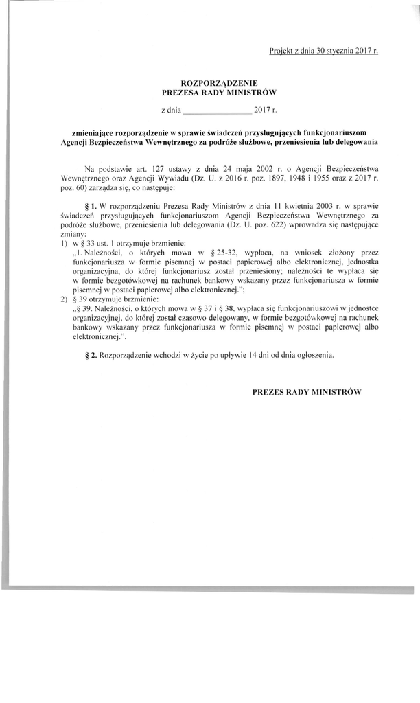 Projekt z dnia 30 stycznia 2017 r. ROZPORZĄDZENIE PREZESA RADY MINISTRÓW z dnia 2017 r. zmieniające rozporządzenie w sprawie świadczeń przysługujących funkcjonariuszom Agencji Bezpieczeństwa Wewnętrznego za podróże służbowe, przeniesienia lub delegowania N a podstawie art. 127 ustawy z dnia 24 maja 2002 r. o Agencji Bezpieczeństwa Wewnętrznego oraz Agencji Wywiadu (Dz. U . z 2016 r. poz. 1897, 1948 i 1955 oraz z 2017 r. poz. 60) zarządza się, co następuje: § 1. W rozporządzeniu Prezesa Rady Ministrów z dnia 11 kwietnia 2003 r. w sprawie świadczeń przysługujących funkcjonariuszom Agencji Bezpieczeństwa Wewnętrznego za podróże służbowe, przeniesienia lub delegowania (Dz. U . poz. 622) wprowadza się następujące zmiany: 1) w § 33 ust. 1 otrzymuje brzmienie: „1. Należności, o których mowa w § 25-32, wypłaca, na wniosek złożony przez funkcjonariusza w formie pisemnej w postaci papierowej albo elektronicznej, jednostka organizacyjna, do której funkcjonariusz został przeniesiony; należności te wypłaca się w formie bezgotówkowej na rachunek bankowy wskazany przez funkcjonariusza w formie pisemnej w postaci papierowej albo elektronicznej."; 2) § 39 otrzymuje brzmienie: „§ 39. Należności, o których mowa w § 37 i § 38, wypłaca się funkcjonariuszowi w jednostce organizacyjnej, do której został czasowo delegowany, w formie bezgotówkowej na rachunek bankowy wskazany przez funkcjonariusza w formie pisemnej w postaci papierowej albo elektronicznej.". § 2. Rozporządzenie wchodzi w życie po upływie 14 dni od dnia ogłoszenia. PREZES R A D Y M I N I S T R Ó W UZASADNIENIE Przedmiotowa nowelizacja rozporządzenia nadaje nowe brzmienie ust. 1 w § 33 oraz § 39 rozporządzenia Prezesa Rady Ministrów z dnia 11 kwietnia 2003 r. w sprawie świadczeń przysługujących funkcjonariuszom Agencji Bezpieczeństwa Wewnętrznego za podróże służbowe, przeniesienia lub delegowania (Dz. U . poz. 622). Konieczność zmiany brzmienia ww. przepisu przedmiotowego rozporządzenia wynika z wprowadzania w Agencji Bezpieczeństwa Wewnętrznego obrotu bezgotówkowego w zakresie wypłaty funkcjonariuszom wszelkich świadczeń pieniężnych. W nowym stanie prawnym wypłata świadczeń pieniężnych przysługujących funkcjonariuszowi Agencji Bezpieczeństwa Wewnętrznego za podróże służbowe, przeniesienia lub delegowania, będzie następowała w formie bezgotówkowej na rachunek bankowy wskazany przez funkcjonariusza w formie pisemnej w postaci papierowej albo elektronicznej. Dane statystyczne posiadane przez Agencję Bezpieczeństwa Wewnętrznego wskazują, iż tylko 1,5% funkcjonariuszy Agencji Bezpieczeństwa Wewnętrznego pobiera świadczenia pieniężne za podróże służbowe, przeniesienia lub delegowania w formie gotówkowej w kasie właściwej jednostki organizacyjnej Agencji Bezpieczeństwa Wewnętrznego. Pozostała część funkcjonariuszy Agencji Bezpieczeństwa Wewnętrznego otrzymuje świadczenia pieniężne za podróże służbowe, przeniesienia lub delegowania w formie przelewu na rachunek bankowy wskazany przez funkcjonariusza. Mając powyższe na uwadze należy stwierdzić, iż utrzymywanie w Agencji Bezpieczeństwa Wewnętrznego obrotu gotówkowego dla nielicznej grupy funkcjonariuszy jest działaniem nieekonomicznym oraz nieracjonalnym. Ponadto przyczynia się do generowania nieproporcjonalnie dużych nakładów pracy i czasu oraz kosztów związanych z zaangażowaniem funkcjonariuszy do obsługi tej formy płatności. Przedmiotowy przewidzianym w projekt rozporządzenia przepisach dotyczących nie podlega sposobu notyfikacji funkcjonowania zgodnie z trybem krajowego sytemu notyfikacji norm i aktów prawnych, ponieważ nie zawiera przepisów technicznych. W stosunku do przedmiotowego projektu rozporządzenia nie była dokonywana ocena OSR w trybie § 32 uchwały nr 190 Rady Ministrów z dnia 29 października 2013 r. Regulamin pracy Rady Ministrów (M.P. z 2016 r. poz. 1006 i 1204). Przedmiotowy projekt rozporządzenia nie był przedstawiany instytucjom i organom Unii Europejskiej lub Europejskiemu Bankowi Centralnemu, celem uzyskania opinii, dokonania konsultacji albo uzgodnienia, ponieważ przepisy przedmiotowego projektu rozporządzenia pozostają poza zakresem prawa Unii Europejskiej. Projekt rozporządzenia został udostępniony na stronie podmiotowej A B W w Biuletynie Informacji Publicznej, zgodnie z art. 5 ustawy z dnia 7 lipca 2005 r. o działalności lobbingowej w procesie stanowienia prawa (Dz. U . poz. 1414, z późn. zm.). Zgodnie z § 52 uchwały nr 190 Rady Ministrów z dnia 29 października 2013 r. Regulamin pracy Rady Ministrów (M.P. z 2016 r. poz. 1006 i 1204) projekt został udostępniony w Biuletynie Informacji Publicznej na stronie podmiotowej Rządowego Centrum Legislacji, w serwisie Rządowy Proces Legislacyjny. Przedmiot projektowanej regulacji pozostaje poza zakresem prawa Unii Europejskiej. Nazwa projektu Projekt rozporządzenia Prezesa Rady Ministrów zmieniającego rozporządzenie w sprawie świadczeń przysługujących funkcjonariuszom Agencji Bezpieczeństwa Wewnętrznego za podróże służbowe, przeniesienia lub delegowania Ministerstwo wiodące i ministerstwa współpracujące Kancelaria Prezesa Rady Ministrów; Szef Agencji Bezpieczeństwa Wewnętrznego Osoba odpow iedzialna za projekt w randze Ministra, Sekretarza Stanu lub Podsekretarza Stanu Szef A B W prof. dr hab. Piotr Pogonowski Data sporządzenia 30 stycznia 2017 r. Źródło: upoważnienie ustawowe art. 127 ustawy z dnia 24 maja 2002 r. o Agencji Bezpieczeństwa Wewnętrznego oraz Agencji Wywiadu (Dz. U . z 2016 r. poz. 1897, 1948 i 1955 oraz z 2017 r. poz. 60) Nr w wykazie prac: 104 Kontakt do opiekuna merytorycznego projektu Dyrektor Biura Prawnego A B W Teresa Rdzanowska tel. 22 58 57 233; e-mail b.prawne aabw.goy.pl 1. Jaki problem jest rozwiązywany? Projekt rozporządzenia Prezesa Rady Ministrów zmieniającego rozporządzenie w sprawie