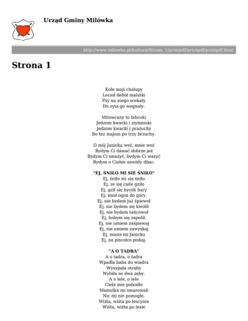 Urząd Gminy Milówka http://www.milowka.pl/kultura/Strona_1/printpdf/printpdf/printpdf.html Strona 1 Kole moji chałupy Lecioł deboł malutki Psy na niego scekały Do zyta go wegnały. Milowcany to bibcoki Jedzom kwacki i ziymnioki Jedzom kwacki i prażuchy Bo tez majom po trzy brzuchy. O mój Janicku weź, mnie weź Bydym Ci dawać dobrze jeś Bydym Ci smażyć, bydym Ci ważyć Bydym o Ciebie zawżdy dbac. "EJ, ŚNIŁO MI SIE ŚNIŁO" Ej, śniło mi się śniło Ej, ze się ciele gziło Ej, gził się bycek bury Ej, mioł ogon do góry. Ej, nie bydem już śpiewoł Ej, nie bydem się kwolił Ej, nie bydem tańcowoł Ej, bobym się zapolił. Ej, nie umiem zaśpiewaj Ej, nie umiem zawyskaj Ej, musis mi Janicku Ej, na piscołce piskaj. "A O TADRA" A o tadra, o tadra Wpadła baba do wiadra Wysypała otręby Wybiła se dwa zęby. A o lele, o lele Ciele mie pobodło Mamulka mi smarowali Nic mi nie pomogło. Wiśta, wiśta po lescynie Wiśta, wiśta po lesie Jak jo póde ku dziewcynie To mie konik poniesie. Kie weseli było To się aż kurziło Młodo ucieche miała Niechaj wiedzom młodzi Kie bywało w przodzi kiedy gajdy zagrały. Hanuśko, Hanuśko Mos pierzyne chuzom Wszyscy Ci wesela W mięsopusty wrózom. "HEJ, PÓJMY TAM" Hej, pójmy tam, pójmy tam Hej, ka sie woda sieje Hej, nojdziemy tam dziywce Hej, ka się rada śmieje. Hej chłopcy, chłopcy Hej, mocie piykne ocy Hej, gonicie za nami Hej, za dnia i po nocy "BALLADA O KROĆPOKU" Na minyły minyły starodawne casy Ka się cłowiek obejzoł były duze lasy A w tych lasach zbójowie pokryci se spoli I na spaniu na ludzi w nocy napodali Roz pamiyntom z wiecora kie my spać lygali Zbójnik wpod do chałpy i siekierom walił Pięć lot go sukali nale po próznicy A naśli go u baby we wsi w Kameśnicy Kie go wiedli po drabinie to mu na łeb załozyli line A potem go stużyli ze scebli i wziyni go debli