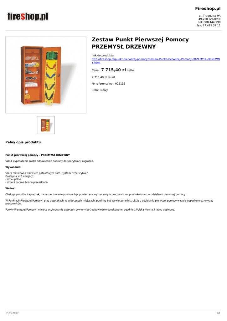 Fireshop.pl ul. Traugutta 9A 49-200 Grodków tel: 888 444 998 fax: 77 415 37 11 Zestaw Punkt Pierwszej Pomocy PRZEMYSŁ DRZEWNY link do produktu: http://fireshop.pl/punkt-pierwszej-pomocy/Zestaw-Punkt-Pierwszej-Pomocy-PRZEMYSL-DRZEWN Y.html Cena: 7 715,40 zł netto 7 715,40 zł za szt. Nr referencyjny: 022136 Stan: Nowy Pełny opis produktu Punkt pierwszej pomocy - PRZEMYSŁ DRZEWNY Skład wyposażenia został odpowiednio dobrany do specyfikacji zagrożeń. Wykonanie: Szafa metalowa z zamkiem patentowym Euro. System " zbij szybkę" . Dostepna w 2 wersjach: - drzwi pełne - drzwi i boczna ściana przeszklona Ważne! Obsługa punktów i apteczek, na każdej zmianie powinna być powierzana wyznaczonym pracownikom, przeszkolonym w udzielaniu pierwszej pomocy. W Punktach Pierwszej Pomocy i przy apteczkach, w widocznych miejscach, powinny być wywieszone instrukcje o udzielaniu pierwszej pomocy w razie wypadku oraz wykazy pracowników. Punkty Pierwszej Pomocy i miejsca usytuowania apteczek powinny być odpowiednio oznakowane, zgodnie z Polską Normą, i łatwo dostępne. 7-03-2017 1/1