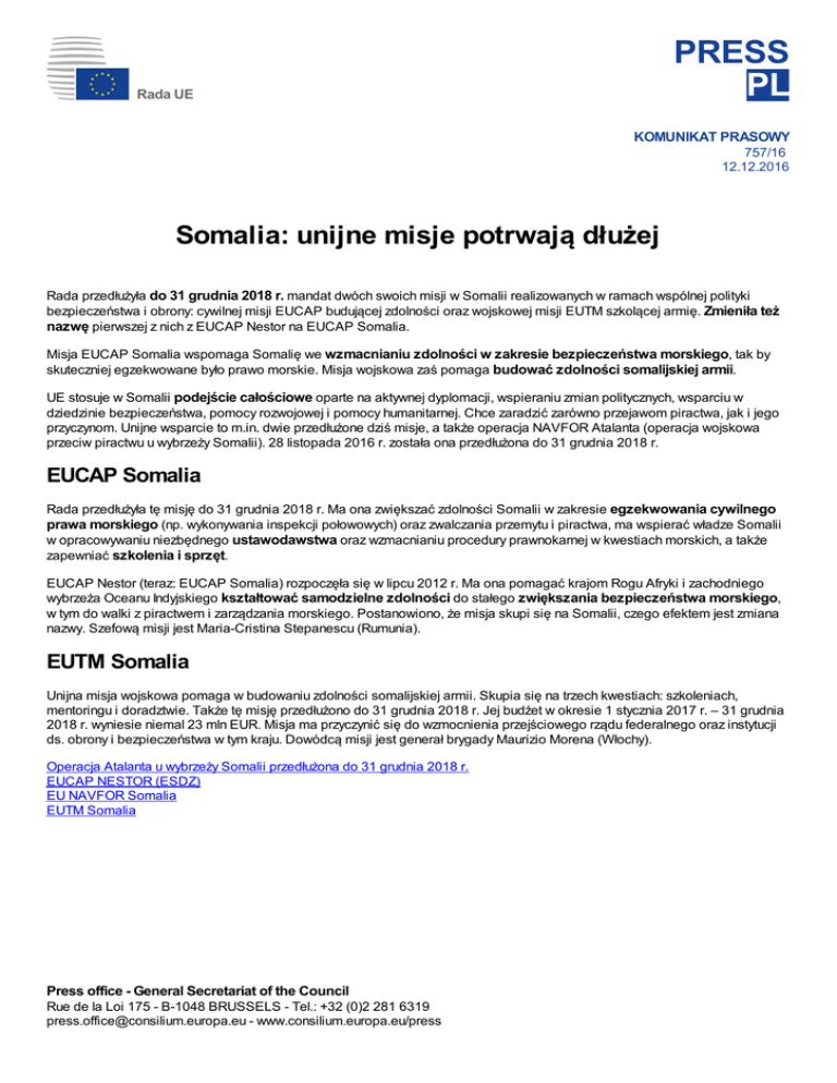 PRESS PL Rada UE KOMUNIKAT PRASOWY 757/16 12.12.2016 Somalia: unijne misje potrwają dłużej Rada przedłużyła do 31 grudnia 2018 r. mandat dwóch swoich misji w Somalii realizowanych w ramach wspólnej polityki bezpieczeństwa i obrony: cywilnej misji EUCAP budującej zdolności oraz wojskowej misji EUTM szkolącej armię. Zmieniła też nazwę pierwszej z nich z EUCAP Nestor na EUCAP Somalia. Misja EUCAP Somalia wspomaga Somalię we wzmacnianiu zdolności w zakresie bezpieczeństwa morskiego, tak by skuteczniej egzekwowane było prawo morskie. Misja wojskowa zaś pomaga budować zdolności somalijskiej armii. UE stosuje w Somalii podejście całościowe oparte na aktywnej dyplomacji, wspieraniu zmian politycznych, wsparciu w dziedzinie bezpieczeństwa, pomocy rozwojowej i pomocy humanitarnej. Chce zaradzić zarówno przejawom piractwa, jak i jego przyczynom. Unijne wsparcie to m.in. dwie przedłużone dziś misje, a także operacja NAVFOR Atalanta (operacja wojskowa przeciw piractwu u wybrzeży Somalii). 28 listopada 2016 r. została ona przedłużona do 31 grudnia 2018 r. EUCAP Somalia Rada przedłużyła tę misję do 31 grudnia 2018 r. Ma ona zwiększać zdolności Somalii w zakresie egzekwowania cywilnego prawa morskiego (np. wykonywania inspekcji połowowych) oraz zwalczania przemytu i piractwa, ma wspierać władze Somalii w opracowywaniu niezbędnego ustawodawstwa oraz wzmacnianiu procedury prawnokarnej w kwestiach morskich, a także zapewniać szkolenia i sprzęt. EUCAP Nestor (teraz: EUCAP Somalia) rozpoczęła się w lipcu 2012 r. Ma ona pomagać krajom Rogu Afryki i zachodniego wybrzeża Oceanu Indyjskiego kształtować samodzielne zdolności do stałego zwiększania bezpieczeństwa morskiego, w tym do walki z piractwem i zarządzania morskiego. Postanowiono, że misja skupi się na Somalii, czego efektem jest zmiana nazwy. Szefową misji jest Maria-Cristina Stepanescu (Rumunia). EUTM Somalia Unijna misja wojskowa pomaga w budowaniu zdolności somalijskiej armii. Skupia się na trzech kwestiach: szkoleniach, mentoringu i doradztwie. Także tę misję przedłużono do 31 grudnia 2018 r. Jej budżet w okresie 1 stycznia 2017 r. – 31 grudnia 2018 r. wyniesie niemal 23 mln EUR. Misja ma przyczynić się do wzmocnienia przejściowego rządu federalnego oraz instytucji ds. obrony i bezpieczeństwa w tym kraju. Dowódcą misji jest generał brygady Maurizio Morena (Włochy). Operacja Atalanta u wybrzeży Somalii przedłużona do 31 grudnia 2018 r. EUCAP NESTOR (ESDZ) EU NAVFOR Somalia EUTM Somalia Press office - General Secretariat of the Council Rue de la Loi 175 - B-1048 BRUSSELS - Tel.: +32 (0)2 281 6319 [email protected] - www.consilium.europa.eu/press