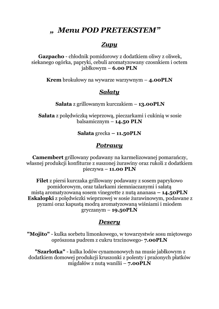 „ Menu POD PRETEKSTEM” Zupy Gazpacho - chłodnik pomidorowy z dodatkiem oliwy z oliwek, siekanego ogórka, papryki, cebuli aromatyzowany czosnkiem i octem jabłkowym – 6.00 PLN Krem brokułowy na wywarze warzywnym – 4.00PLN Sałaty Sałata z grillowanym kurczakiem – 13.00PLN Sałata z polędwiczką wieprzową, pieczarkami i cukinią w sosie balsamicznym – 14.50 PLN Sałata grecka – 11.50PLN Potrawy Camembert grillowany podawany na karmelizowanej pomarańczy, własnej produkcji konfiturze z suszonej żurawiny oraz rukoli z dodatkiem pieczywa – 11.00 PLN Filet z piersi kurczaka grillowany podawany z sosem paprykowo pomidorowym, oraz talarkami ziemniaczanymi i sałatą mistą aromatyzowaną sosem vinegrette z nutą ananasa – 14.50PLN Eskalopki z polędwiczki wieprzowej w sosie żurawinowym, podawane z pyzami oraz kapustą modrą aromatyzowaną wiśniami i miodem gryczanym – 19.50PLN Desery "Mojito" - kulka sorbetu limonkowego, w towarzystwie sosu miętowego oprószona pudrem z cukru trzcinowego- 7.00PLN "Szarlotka" - kulka lodów cynamonowych na musie jabłkowym z dodatkiem domowej produkcji kruszonki z polenty i prażonych płatków migdałów z nutą wanilii – 7.00PLN
