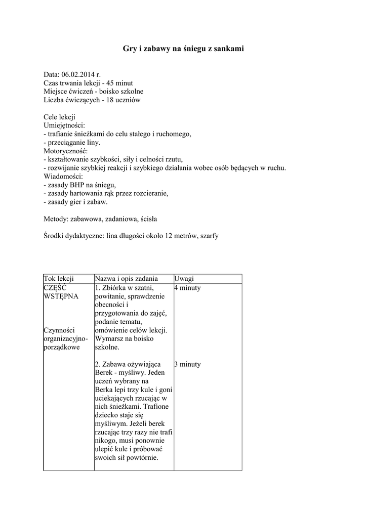Gry i zabawy na śniegu z sankami Data: 06.02.2014 r. Czas trwania lekcji - 45 minut Miejsce ćwiczeń - boisko szkolne Liczba ćwiczących - 18 uczniów Cele lekcji Umiejętności: - trafianie śnieżkami do celu stałego i ruchomego, - przeciąganie liny. Motoryczność: - kształtowanie szybkości, siły i celności rzutu, - rozwijanie szybkiej reakcji i szybkiego działania wobec osób będących w ruchu. Wiadomości: - zasady BHP na śniegu, - zasady hartowania rąk przez rozcieranie, - zasady gier i zabaw. Metody: zabawowa, zadaniowa, ścisła Środki dydaktyczne: lina długości około 12 metrów, szarfy Tok lekcji CZĘŚĆ WSTĘPNA Nazwa i opis zadania Uwagi 1. Zbiórka w szatni, 4 minuty powitanie, sprawdzenie obecności i przygotowania do zajęć, podanie tematu, Czynności omówienie celów lekcji. organizacyjno- Wymarsz na boisko porządkowe szkolne. 2. Zabawa ożywiająca 3 minuty Berek - myśliwy. Jeden uczeń wybrany na Berka lepi trzy kule i goni uciekających rzucając w nich śnieżkami. Trafione dziecko staje się myśliwym. Jeżeli berek rzucając trzy razy nie trafi nikogo, musi ponownie ulepić kule i próbować swoich sił powtórnie. Rozgrzewka ćwiczenia ramion, tułowia, nóg CZĘŚĆ GŁÓWNA 1. Zabawa bieżna 2. Zabawa rzutna 3. Ćwiczenia 4 minuty ogólnorozwojowe: - rozcieranie dłoni i palców- bez rękawic, - jw., ale ze śniegiem, - w małym rozkroku kolana proste, lepienie 6 śnieżek, - podrzut śnieżek w górę unieść kolano prawe, lewe do poziomu, wyłapać śnieżkę na kolano, - podrzuconą śnieżkę kopiemy nogą prawą, lewą do góry, - podskoki pajaca odbicie w postawie, odbicie w rozkroku, ramiona w bok. "Ucieczka". Dzieci stoją ustawione w 4 razy dwóch szeregach zwrócone twarzą do siebie w odległości około 3-5 kroków. Na sygnał jeden z szeregów odwraca się i ucieka do linii mety. Dzieci z drugiego szeregu starają się złapać uciekających przed metą. Na sygnał wszyscy wracają na swoje miejsce. Za każdego złapanego stronie przeciwnej przyznaje się punkt. Potem szeregi zamieniają się miejscami i zabawę powtarzamy. 3 razy "Kule śnieżne" - podział na dwa zespoły. Każdy zespół lepi małego bałwanka. Ćwiczący z zespołu lepią po trzy kule śnieżne. Z odległości 5-10 metrów celują w swojego bałwana. Wygrywa zespół, który uzyskał więcej trafień. 3. Zabawa z mocowaniem 2 razy "Przeciąganie liny". Podział klasy na dwa 8osobowe zespoły. Prostopadle do wyznaczonej linii (mety) układamy linę, tak aby jej zaznaczony środek był na linii mety. Wzdłuż liny ustawiają się 8-osobowe zespoły. Zespoły chwytają linę, tak aby pierwszy z zespołu opierał nogę wykroczną na linii dodatkowej od mety (2m). Na sygnał prowadzącego jednocześnie zespoły przeciągają linę na swoją stronę. Jeśli pierwszy z zespołu przekroczy linię mety to zespół przegrywa walkę. 2 razy 4. Zabawa skoczna "Przeskakiwanie rowu". 5. Zabawa rzutna Dwa zespoły ustawiają się na linii startu. W odległości 5m układamy rów z szarf o szerokości dostosowanej do możliwości dzieci. Na sygnał pierwsi z rzędów wybiegają z linii startu, przeskakują rów i ustawiają się po drugiej stronie. Na następny sygnał startują następni itd. Wygrywa zespół, który wykonał zadanie 2 razy każdy zespół prawidłowo (przeskok (6 razy) przez rów nie dotykając szarf). "Polowanie" CZĘŚĆ KOŃCOWA 1. Zabawa uspokajająca Uczniów dzielimy na trzy zespoły. Dwa zespoły ustawiają naprzeciw siebie, na liniach (odległość linii około 10m). Każdy uczeń lepi po trzy śnieżki. Trzeci zespół na sygnał przebiega korytarzem (między liniami) na drugą stronę. Dzieci z ulepionymi śnieżkami starają się upolować przebiegające dzieci. Liczymy trafienia (ujemne punkty) dla przebiegającego zespołu. Później następuje zmiana przebiegających. Wygrywa zespół, który ma mniej upolowanych dzieci. "Skąd słychać gwizdek" Dzieci zamykają oczy. Prowadzący cicho 4-6 razy gwiżdże, a dzieci obracają się w kierunku sygnału. Prowadzący zmienia miejsce i powtarza sygnał. Zebranie pomocy i 2. Zakończenie przejście do szkoły. lekcji Oczyszczenie ubrania i obuwia. W szatni (korytarz) omówienie zabaw na śniegu. 4 minuty na terenie płaskim 1.Wzajemne wożenie się. 2.Wyścig ze zmianą ciągnącego na półmetku. 3.Sztafeta w formie wyścigu rzędów. 4.Wyścigi "kwadryg"- jedno dziecko ciągnie sanki, drugie stoi na końcach płóz i trzyma się paska sanek. 5."Oblężenie twierdzy"- jedna grupa ustawia krąg ze stojących sanek i broni się rzucając śnieżkami do grupy nacierającej. 6.Bieg slalomem między sankami. 7.Przeskoki przez sanki obunóż, jednonóż, zawrotne. 8.Rzuty śnieżkami do przebiegających, między postawionymi w formie zasłon sankami, kolegów.