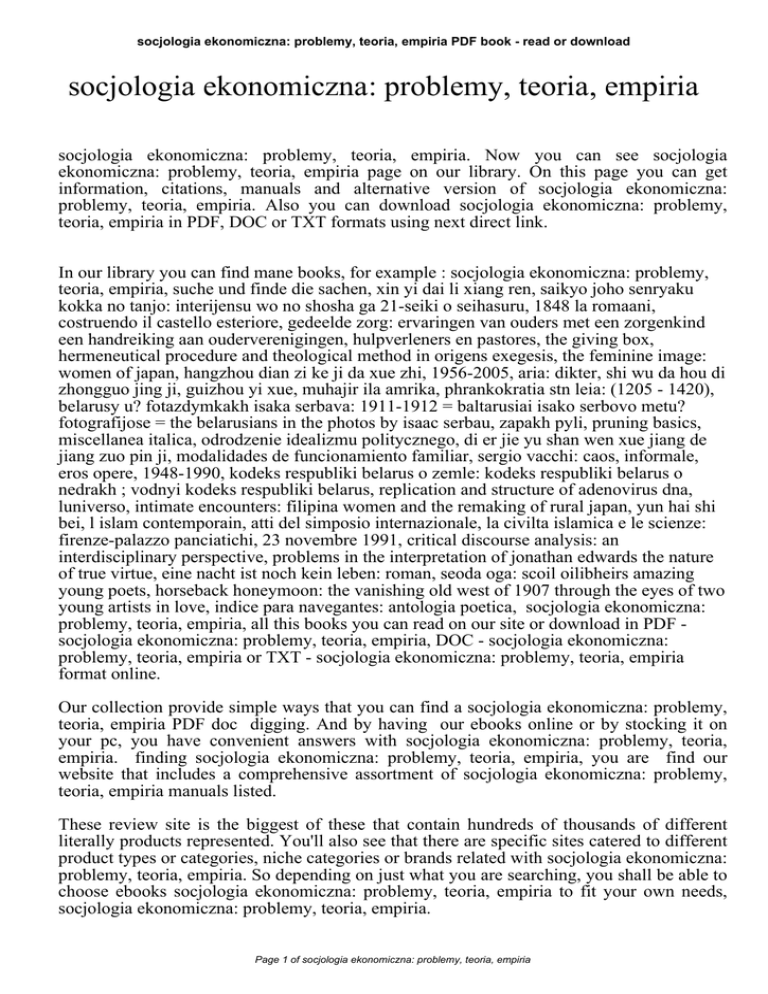 socjologia ekonomiczna: problemy, teoria, empiria PDF book - read or download socjologia ekonomiczna: problemy, teoria, empiria socjologia ekonomiczna: problemy, teoria, empiria. Now you can see socjologia ekonomiczna: problemy, teoria, empiria page on our library. On this page you can get information, citations, manuals and alternative version of socjologia ekonomiczna: problemy, teoria, empiria. Also you can download socjologia ekonomiczna: problemy, teoria, empiria in PDF, DOC or TXT formats using next direct link. In our library you can find mane books, for example : socjologia ekonomiczna: problemy, teoria, empiria, suche und finde die sachen, xin yi dai li xiang ren, saikyo joho senryaku kokka no tanjo: interijensu wo no shosha ga 21-seiki o seihasuru, 1848 la romaani, costruendo il castello esteriore, gedeelde zorg: ervaringen van ouders met een zorgenkind een handreiking aan ouderverenigingen, hulpverleners en pastores, the giving box, hermeneutical procedure and theological method in origens exegesis, the feminine image: women of japan, hangzhou dian zi ke ji da xue zhi, 1956-2005, aria: dikter, shi wu da hou di zhongguo jing ji, guizhou yi xue, muhajir ila amrika, phrankokratia stn leia: (1205 - 1420), belarusy u? fotazdymkakh isaka serbava: 1911-1912 = baltarusiai isako serbovo metu? fotografijose = the belarusians in the photos by isaac serbau, zapakh pyli, pruning basics, miscellanea italica, odrodzenie idealizmu politycznego, di er jie yu shan wen xue jiang de jiang zuo pin ji, modalidades de funcionamiento familiar, sergio vacchi: caos, informale, eros opere, 1948-1990, kodeks respubliki belarus o zemle: kodeks respubliki belarus o nedrakh ; vodnyi kodeks respubliki belarus, replication and structure of adenovirus dna, luniverso, intimate encounters: filipina women and the remaking of rural japan, yun hai shi bei, l islam contemporain, atti del simposio internazionale, la civilta islamica e le scienze: firenze-palazzo panciatichi, 23 novembre 1991, critical discourse analysis: an interdisciplinary perspective, problems in the interpretation of jonathan edwards the nature of true virtue, eine nacht ist noch kein leben: roman, seoda oga: scoil oilibheirs amazing young poets, horseback honeymoon: the vanishing old west of 1907 through the eyes of two young artists in love, indice para navegantes: antologia poetica, socjologia ekonomiczna: problemy, teoria, empiria, all this books you can read on our site or download in PDF socjologia ekonomiczna: problemy, teoria, empiria, DOC - socjologia ekonomiczna: problemy, teoria, empiria or TXT - socjologia ekonomiczna: problemy, teoria, empiria format online. Our collection provide simple ways that you can find a socjologia ekonomiczna: problemy, teoria, empiria PDF doc digging. And by having our ebooks online or by stocking it on your pc, you have convenient answers with socjologia ekonomiczna: problemy, teoria, empiria. finding socjologia ekonomiczna: problemy, teoria, empiria, you are find our website that includes a comprehensive assortment of socjologia ekonomiczna: problemy, teoria, empiria manuals listed. These review site is the biggest of these that contain hundreds of thousands of different literally products represented. You'll also see that there are specific sites catered to different product types or categories, niche categories or brands related with socjologia ekonomiczna: problemy, teoria, empiria. So depending on just what you are searching, you shall be able to choose ebooks socjologia ekonomiczna: problemy, teoria, empiria to fit your own needs, socjologia ekonomiczna: problemy, teoria, empiria. Page 1 of socjologia ekonomiczna: problemy, teoria, empiria