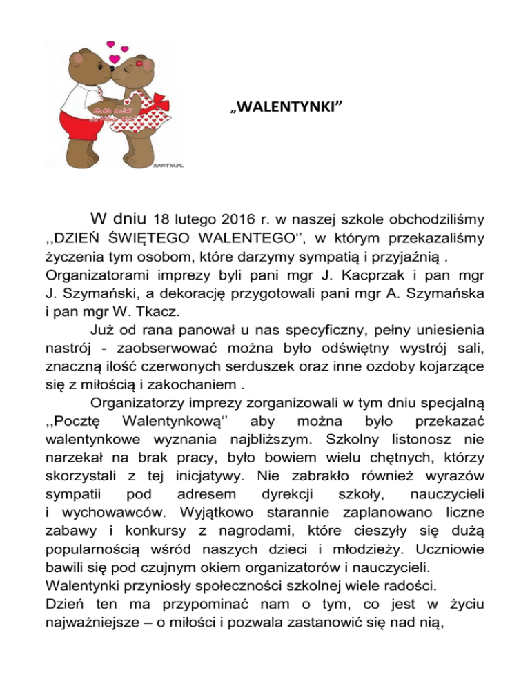 SPRAWOZDANIE Z PRZEBIEGU IMPREZY OGÓLNOSZKOLNEJ „WALENTYNKI” W dniu 18 lutego 2016 r. w naszej szkole obchodziliśmy ,,DZIEŃ ŚWIĘTEGO WALENTEGO‘’, w którym przekazaliśmy życzenia tym osobom, które darzymy sympatią i przyjaźnią . Organizatorami imprezy byli pani mgr J. Kacprzak i pan mgr J. Szymański, a dekorację przygotowali pani mgr A. Szymańska i pan mgr W. Tkacz. Już od rana panował u nas specyficzny, pełny uniesienia nastrój - zaobserwować można było odświętny wystrój sali, znaczną ilość czerwonych serduszek oraz inne ozdoby kojarzące się z miłością i zakochaniem . Organizatorzy imprezy zorganizowali w tym dniu specjalną ,,Pocztę Walentynkową‘’ aby można było przekazać walentynkowe wyznania najbliższym. Szkolny listonosz nie narzekał na brak pracy, było bowiem wielu chętnych, którzy skorzystali z tej inicjatywy. Nie zabrakło również wyrazów sympatii pod adresem dyrekcji szkoły, nauczycieli i wychowawców. Wyjątkowo starannie zaplanowano liczne zabawy i konkursy z nagrodami, które cieszyły się dużą popularnością wśród naszych dzieci i młodzieży. Uczniowie bawili się pod czujnym okiem organizatorów i nauczycieli. Walentynki przyniosły społeczności szkolnej wiele radości. Dzień ten ma przypominać nam o tym, co jest w życiu najważniejsze – o miłości i pozwala zastanowić się nad nią, a w plastikowym, symbolicznym serduszku dostrzec coś więcej niż tylko przedmiot. Świętowanie walentynkowe ma już wielu zwolenników pośród nas, bo uczy okazywania uczuć, a tym samym niesie radość i zadowolenie. GALERIA ZDJĘĆ Opracował: mgr J. Szymański
