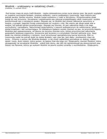 Wodnik - uratowany w ostatniej chwili.. (niedziela, 13 czerwiec 2010) - Pod koniec maja do azylu trafił Wodnik - ciężko doświadczony przez życie starszy pies. Na pozór wygląda on zupełnie zwyczajnie – średniej wielkości, czarny podopalany czworonóg. Jego historia jest jednak bardzo, bardzo smutna. Wodnik został wyłowiony z rzeki w Strzybnicy. Przypuszczalnie psiak został do niej wrzucony. Szczekanie i popiskiwanie psa usłyszał przejeżdżający obok rowerzysta i szybko poinformował nas o cierpiącym psiaku. Okazało się, że Wodnik jest prawie całkowicie zanurzony w wodzie, a grząski, bagnisty brzeg uniemożliwiał mu wyjście z niej. Nie wiemy jak długo psiak stał w wodzie, był jednak bardzo przemarznięty. Okazało się również, że jest całkowicie ślepy a do tego wychudzony i zaniedbany. Natychmiast pojechaliśmy z naszym podopiecznym do weterynarza, gdzie dostał kroplówki i leki wzmacniające. Po dokładnym badaniu wyszło również na jaw, że przyczyną ślepoty Wodnika jest zaawansowana, od dawna nie leczona choroba oczu, której przyczyną jest zaburzenie gospodarki lipidowej organizmu. Konieczne jest leczenie a w przyszłości również operacja oczu. Nasz psiak ma również problemy z nerkami, musi otrzymywać specjalistyczną karmę leczniczą. Póki co czworonóg nadal nie potrafi dojść do siebie – cały czas śpi, jest słaby i pozbawiony chęci do życia... Prosimy o pomoc dla Wodnika – w tej chwili najbardziej potrzebuje on dobrej, ciepłej opieki i dużo, dużo miłości, która sprawi, że będzie miał dla kogo żyć. Dziękujemy również Osobom, które zareagowały na szczekanie Wodnika - wokół były domy, ale nikt nie zainteresował się skowyczeniem psa. Gdyby nie Panowie, którzy go wyłowili Wodnik na pewno szybko umarłby z wychłodzenia.. Dziękujemy. http://connectit.pl/~orion - Powered by Mambo Generated: 7 March, 2017, 06:39