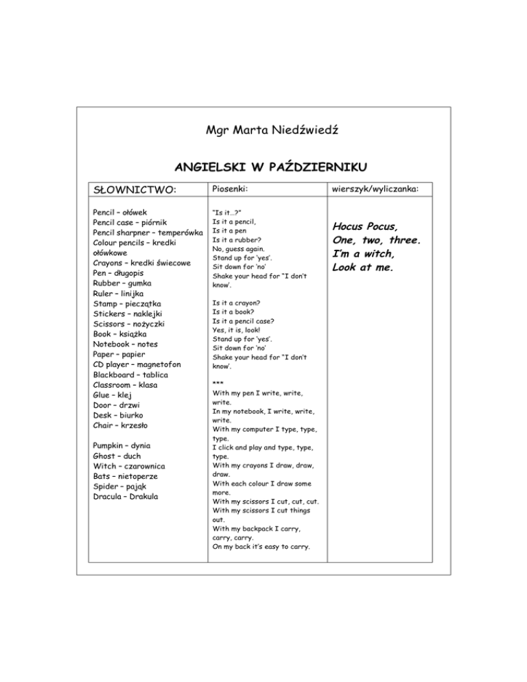 Mgr Marta Niedźwiedź ANGIELSKI W PAŹDZIERNIKU SŁOWNICTWO: Piosenki: wierszyk/wyliczanka: Pencil – ołówek Pencil case – piórnik Pencil sharpner – temperówka Colour pencils – kredki ołówkowe Crayons – kredki świecowe Pen – długopis Rubber – gumka Ruler – linijka Stamp – pieczątka Stickers – naklejki Scissors – nożyczki Book – książka Notebook – notes Paper – papier CD player – magnetofon Blackboard – tablica Classroom – klasa Glue – klej Door – drzwi Desk – biurko Chair – krzesło “Is it…?” Is it a pencil, Is it a pen Is it a rubber? No, guess again. Stand up for ‘yes’. Sit down for ‘no’ Shake your head for “I don’t know’. Hocus Pocus, One, two, three. I’m a witch, Look at me. Pumpkin – dynia Ghost – duch Witch – czarownica Bats – nietoperze Spider – pająk Dracula – Drakula Is it a crayon? Is it a book? Is it a pencil case? Yes, it is, look! Stand up for ‘yes’. Sit down for ‘no’ Shake your head for “I don’t know’. *** With my pen I write, write, write. In my notebook, I write, write, write. With my computer I type, type, type. I click and play and type, type, type. With my crayons I draw, draw, draw. With each colour I draw some more. With my scissors I cut, cut, cut. With my scissors I cut things out. With my backpack I carry, carry, carry. On my back it’s easy to carry.