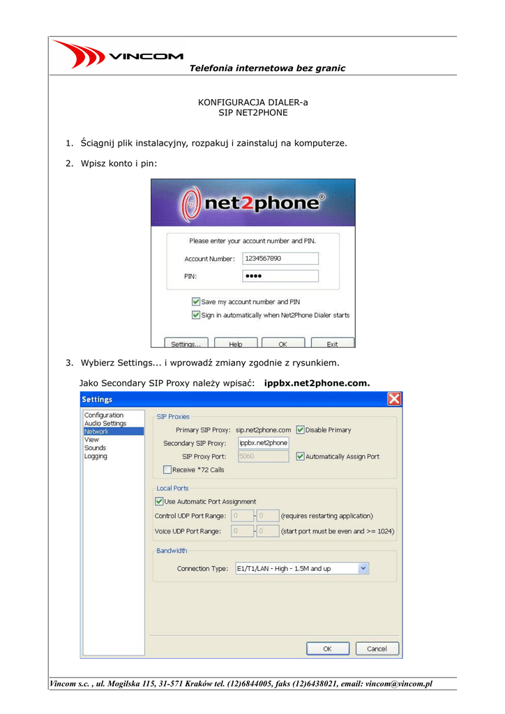 Telefonia internetowa bez granic KONFIGURACJA DIALER-a SIP NET2PHONE 1. Ściągnij plik instalacyjny, rozpakuj i zainstaluj na komputerze. 2. Wpisz konto i pin: 3. Wybierz Settings... i wprowadź zmiany zgodnie z rysunkiem. Jako Secondary SIP Proxy należy wpisać: ippbx.net2phone.com. Vincom s.c. , ul. Mogilska 115, 31-571 Kraków tel. (12)6844005, faks (12)6438021, email: [email protected] Telefonia internetowa bez granic 4. Zatwierdź zmiany. 5. Podłącz słuchawki i mikrofon lub inne urządzenia multimedialne zapewniające komunikację głosową. 6. Wybieranie numeru. Pierwsze okienko musi być puste. W drugim należy wpisywać numer jak w TP SA – nr krajowy 0_kod-miasta_numer nr zagraniczny 00_kod-państwa_numer. 7. Zarządzanie kontem. Na stronie www.myaccountcenter.net znajduje się biling oraz różne opcje, które można ustawiać zgodnie z własnymi wymaganiami i potrzebami. Vincom s.c. , ul. Mogilska 115, 31-571 Kraków tel. (12)6844005, faks (12)6438021, email: [email protected]