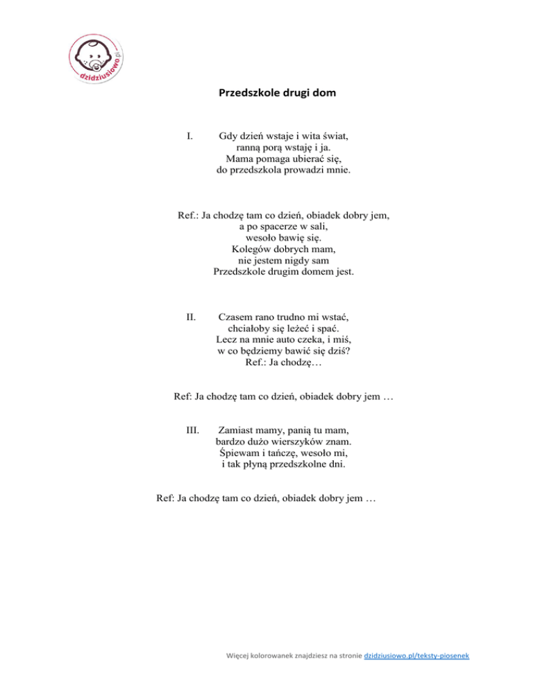 Przedszkole drugi dom I. Gdy dzień wstaje i wita świat, ranną porą wstaję i ja. Mama pomaga ubierać się, do przedszkola prowadzi mnie. Ref.: Ja chodzę tam co dzień, obiadek dobry jem, a po spacerze w sali, wesoło bawię się. Kolegów dobrych mam, nie jestem nigdy sam Przedszkole drugim domem jest. II. Czasem rano trudno mi wstać, chciałoby się leżeć i spać. Lecz na mnie auto czeka, i miś, w co będziemy bawić się dziś? Ref.: Ja chodzę… Ref: Ja chodzę tam co dzień, obiadek dobry jem … III. Zamiast mamy, panią tu mam, bardzo dużo wierszyków znam. Śpiewam i tańczę, wesoło mi, i tak płyną przedszkolne dni. Ref: Ja chodzę tam co dzień, obiadek dobry jem … Więcej kolorowanek znajdziesz na stronie dzidziusiowo.pl/teksty-piosenek