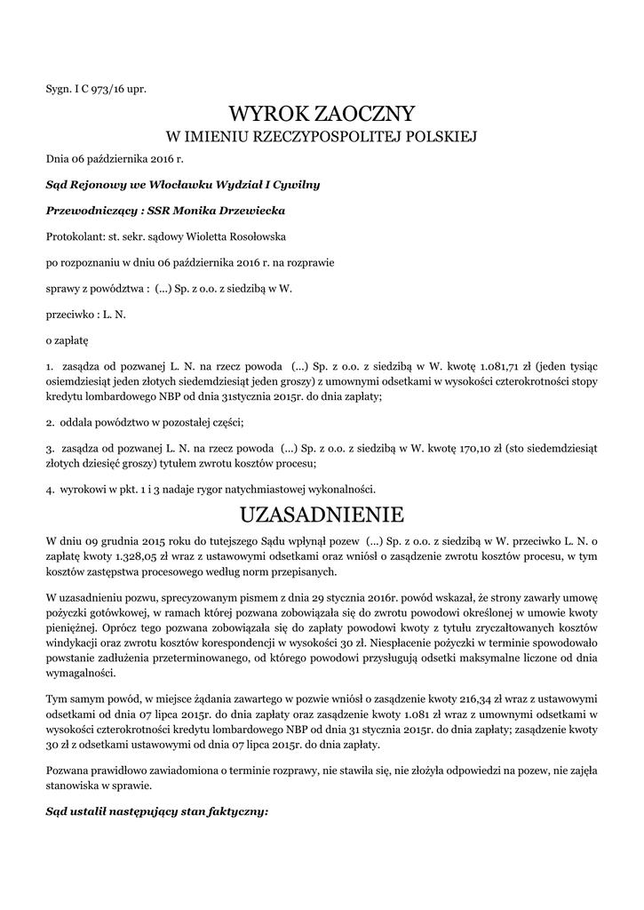 Sygn. I C 973/16 upr. WYROK ZAOCZNY W IMIENIU RZECZYPOSPOLITEJ POLSKIEJ Dnia 06 października 2016 r. Sąd Rejonowy we Włocławku Wydział I Cywilny Przewodniczący : SSR Monika Drzewiecka Protokolant: st. sekr. sądowy Wioletta Rosołowska po rozpoznaniu w dniu 06 października 2016 r. na rozprawie sprawy z powództwa : (...) Sp. z o.o. z siedzibą w W. przeciwko : L. N. o zapłatę 1. zasądza od pozwanej L. N. na rzecz powoda (...) Sp. z o.o. z siedzibą w W. kwotę 1.081,71 zł (jeden tysiąc osiemdziesiąt jeden złotych siedemdziesiąt jeden groszy) z umownymi odsetkami w wysokości czterokrotności stopy kredytu lombardowego NBP od dnia 31stycznia 2015r. do dnia zapłaty; 2. oddala powództwo w pozostałej części; 3. zasądza od pozwanej L. N. na rzecz powoda (...) Sp. z o.o. z siedzibą w W. kwotę 170,10 zł (sto siedemdziesiąt złotych dziesięć groszy) tytułem zwrotu kosztów procesu; 4. wyrokowi w pkt. 1 i 3 nadaje rygor natychmiastowej wykonalności. UZASADNIENIE W dniu 09 grudnia 2015 roku do tutejszego Sądu wpłynął pozew (...) Sp. z o.o. z siedzibą w W. przeciwko L. N. o zapłatę kwoty 1.328,05 zł wraz z ustawowymi odsetkami oraz wniósł o zasądzenie zwrotu kosztów procesu, w tym kosztów zastępstwa procesowego według norm przepisanych. W uzasadnieniu pozwu, sprecyzowanym pismem z dnia 29 stycznia 2016r. powód wskazał, że strony zawarły umowę pożyczki gotówkowej, w ramach której pozwana zobowiązała się do zwrotu powodowi określonej w umowie kwoty pieniężnej. Oprócz tego pozwana zobowiązała się do zapłaty powodowi kwoty z tytułu zryczałtowanych kosztów windykacji oraz zwrotu kosztów korespondencji w wysokości 30 zł. Niespłacenie pożyczki w terminie spowodowało powstanie zadłużenia przeterminowanego, od którego powodowi przysługują odsetki maksymalne liczone od dnia wymagalności. Tym samym powód, w miejsce żądania zawartego w pozwie wniósł o zasądzenie kwoty 216,34 zł wraz z ustawowymi odsetkami od dnia 07 lipca 2015r. do dnia zapłaty oraz zasądzenie kwoty 1.081 zł wraz z umownymi odsetkami w wysokości czterokrotności kredytu lombardowego NBP od dnia 31 stycznia 2015r. do dnia zapłaty; zasądzenie kwoty 30 zł z odsetkami ustawowymi od dnia 07 lipca 2015r. do dnia zapłaty. Pozwana prawidłowo zawiadomiona o terminie rozprawy, nie stawiła się, nie złożyła odpowiedzi na pozew, nie zajęła stanowiska w sprawie. Sąd ustalił następujący stan faktyczny: W dniu 11 grudnia 2014r. powód (...) Sp. z o.o. z siedzibą w W. udzielił pozwanej L. N. pożyczki gotówkowej w kwocie 1.071 zł, na okres 1 miesiąca, którą pozwana zobowiązała się zwrócić do dnia 11 stycznia 2015r. Z udzielonej pożyczki, pożyczkodawca potrącił koszty udzielenia pożyczki: kwotę 371 zł tytułem opłaty przygotowawczej oraz kwotę 10,71 zł tytułem odsetek umownych, naliczonych za cały okres kredytowania. Pożyczkobiorca otrzymała do wypłaty pożyczkę w kwocie 700 zł. W umowie zastrzeżono także, że niespłacenie pożyczki w ustalonym terminie powoduje powstanie zadłużenia przeterminowanego, od którego pobierane są odsetki karne według zmiennej stopy procentowej, określonej jako czterokrotność stopy kredytu lombardowego NBP. W przypadku zadłużenia w spłacie należności wynikających z umowy o pożyczkę gotówkową, pożyczkodawca może prowadzić działania windykacyjne – jako działania własne lub zlecone zewnętrznej firmie windykacyjnej. Opłaty obciążające pożyczkobiorcę w związku z windykacją należności nie mogą w miesiącu przekroczyć 200 zł; w przypadku działań prowadzonych przez zewnętrzną firmę windykacyjną opłaty nie mogą przekroczyć 20 % kwoty wymagalnej należności. W umowie zastrzeżono także, że pożyczkodawca może pobierać opłaty według zasad i stawek określonych w umowie oraz Tabeli Opłat i Prowizji w zakresie udzielania pożyczek gotówkowych. Pożyczkobiorca ma także prawo, w ramach monitorowania spłaty pożyczki najwcześniej na 5 dni, przed terminem spłaty na telefoniczny lub sms-owy kontakt z Pożyczkobiorcą, w tym tytułu opłaty za opóźnienie w spłacie: a) za wysłanie wezwania do zapłaty, upomnienia lub prośby o dopłatę listem zwykłym zastrzeżono opłatę w wysokości 20 zł, b) za wysłanie wezwania do zapłaty, upomnienia lub prośby o dopłatę listem poleconym zastrzeżono opłatę w wysokości 30 zł, c) za telefoniczne wezwanie do zapłaty zastrzeżono opłatę w wysokości 20 zł, d) za wezwanie zapłaty przy wykorzystaniu SMS zastrzeżono opłatę w kwocie 5 zł, e) za wezwanie do zapłaty przy wykorzystaniu poczty elektronicznej zastrzeżono opłatę w kwocie 5 zł, f) za koszty windykacji obejmujące m.in. działania firmy windykacyjnej zastrzeżono opłatę w kwocie nie więcej niż 20% kwoty wymaganej należności. Dowód: okoliczności bezsporne, umowa pożyczki– k.11-12; potwierdzenie realizacji przelewu – k. 15; Pozwana nie dokonała terminowej spłaty pożyczki. Pismem z dnia 05 lutego 2015 roku powód wezwał pozwaną do natychmiastowej zapłaty zadłużenia w wysokości 1.081,71 zł oraz opłaty dodatkowej w kwocie 30 zł, łącznie 1.111,71 zł, w terminie 7 dni, od daty odebrania wezwania, pod rygorem przekazania sprawy, do zewnętrznej firmy windykacyjnej. W dniu 19 czerwca 2015 roku powód skierował do pozwanej wezwanie do zapłaty zadłużenia w wysokości 1.328,05 zł i odsetek umownych za opóźnienie w kwocie 50,20 zł, w terminie 3 dni od daty nadania niniejszego pisma. Mimo wezwania do zapłaty, do dnia wyrokowania pozwana nie zapłaciła powodowi kwoty dochodzonej pozwem Dowód: okoliczności bezsporne; wezwania do zapłaty z dnia 05.02.2015r. wraz z potwierdzeniem odbioru – k. 15v – 17v; wezwanie do zapłaty z dnia 19.06.2015r. – k. 18 Sąd zważył, co następuje: Zgodnie z art. 339 § 1 k.p.c. jeżeli pozwany nie stawił się na posiedzenie wyznaczone na rozprawę albo mimo stawienia się nie 