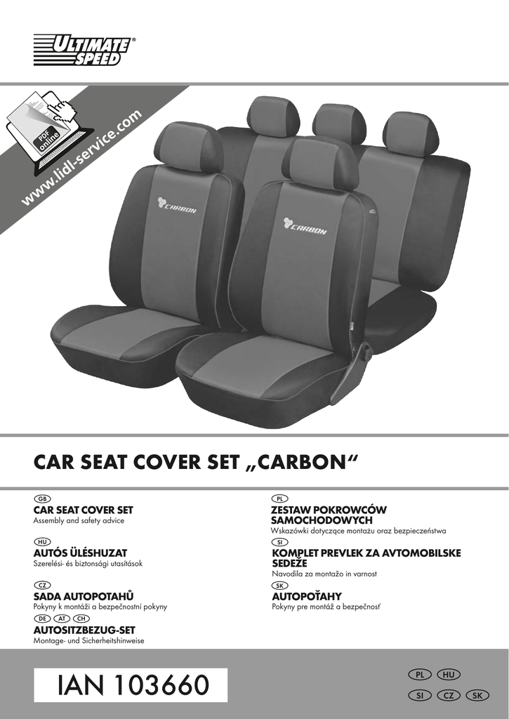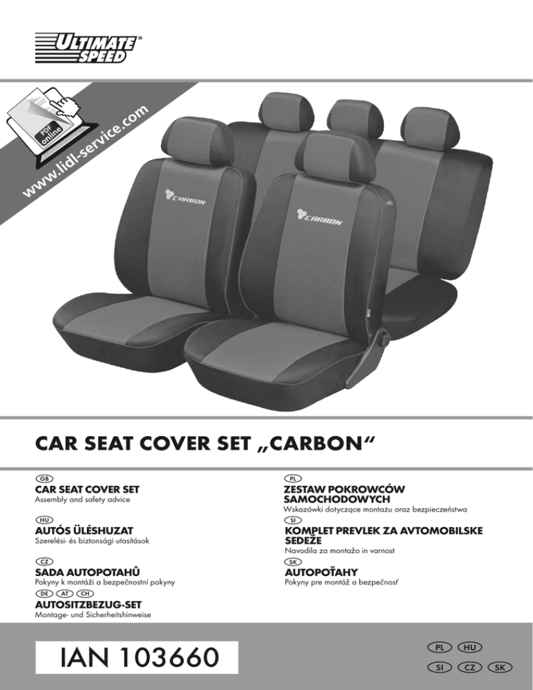 CAR SEAT COVER SET „CARBON“ GB CAR SEAT COVER SET Assembly and safety advice HU AUTÓS ÜLÉSHUZAT Szerelési- és biztonsági utasítások CZ SADA AUTOPOTAHŮ Pokyny k montáži a bezpečnostní pokyny DE AT PL ZESTAW POKROWCÓW SAMOCHODOWYCH Wskazówki dotyczące montażu oraz bezpieczeństwa SI KOMPLET PREVLEK ZA AVTOMOBILSKE SEDEŽE Navodila za montažo in varnost SK AUTOPOŤAHY Pokyny pre montáž a bezpečnosť CH AUTOSITZBEZUG-SET Montage- und Sicherheitshinweise IAN 103660 PL HU SI CZ SK GB Before reading, unfold both pages containing illustrations and familiarise yourself with all functions of the product. PL Przed przeczytaniem należy rozłożyć obie strony z ilustracjami, a następnie zapoznać się z wszystkimi funkcjami produktu. HU Az elolvasás előtt nyissa fel az ábrákat tartalmazó mindkét oldalt és végezetül ismerje meg a termék mindegyik funkcióját. SI Pred branjem odprite obe strani s slikami in se nato seznanite z vsemi funkcijami izdelka. CZ Před čtením si otevřete obě strany s obrázky a potom se seznamte se všemi funkcemi výrobku. SK Pred čítaním si otvorte obidve strany s obrázkami a následne sa oboznámte so všetkými funkciami výrobku. DE AT CH Klappen Sie vor dem Lesen die beiden Seiten mit den Abbildungen aus und machen Sie sich anschließend mit allen Funktionen des Produkts vertraut. GB PL HU SI CZ Assembly and safety advice Wskazówki dotyczące montażu oraz bezpieczeństwa Szerelési- és biztonsági utasítások Navodila za montažo in varnost Pokyny k montáži a bezpečnostní pokyny Page 5 Strona 7 Oldal 9 Stran 11 Strana 13 SK Pokyny pre montáž a bezpečnosť Strana 15 DE/AT/CH Montage- und Sicherheitshinweise Seite 17 1 2 3 4 5 6 7 8 9 10 11 12 13 14 15 16 17 18 19 20 21 22 23 24 25 26 28 27 29 30 33 34 31 32 35 36 38 39 40 41 42 43 44 45 37 Car seat cover set WARNING! DANGER OF SUFFOCATION! Keep the packaging out of reach of small children. Introduction We congratulate you on your purchase. You have chosen a high quality product. The instructions for use are to be considered as part of this product. Before using the product, please familiarise yourself with all the safety information and instructions for use. Only use the product as instructed and only for the stated areas of use. If you pass the product on to anyone else, please ensure that you also pass on all the documentation with it. Installation is permissible only in cars that are indicated in the list of types on the packaging or in the enclosed, detailed list of types. Correct assignment of the seat (driver and front passenger seat). The covers are assigned by the marking „airbag“ attached to the seat cover. This marking must be attached to the outer side of the backrest (see fig. 1.0). Intended use Set of car seat covers for the driver‘s seat, passenger‘s seat and the back seats of cars (according to the enclosed type list). Scope of delivery Fig. 1.0 Headrest inserts, adjustment levers / wheels for release of backrests or armrests may not be covered with the seat cover. Allowances must be made for appropriate inserts. Please observe the instructions given in section “Installation”. Displaced seat covers must be repositioned. If this is no longer possible due to a advanced state of wear and tear, the cover must be removed or replaced. Manipulation of the opening of the seat covers is not permissible (no covering, sewing up or repairs by yourself). 2 x covers for front seats (in 1 or 2 parts according to design) 2 - 5 x covers for headrests (according to design) This protective cover has been tested by TÜV Rhineland Group. CAUTION! If the seat covers are installed incorrectly, the proper extension and inflation of the seat air bag cannot be guaranteed in the case of a collision. Installation 1 x cover for rear backrest (in 1 to 5 parts according to design) 1 x cover for back seat (not sepa rable) You need a pair of pointed scissors. Installation of seat covers Important: Please read the information below before installing the seat covers! Metal hooks (located in the headrest covers) List of types Safety instructions Correct installation res. fastening of the seat covers to the vehicle is essential to guarantee the safety of the user. Please pay attention to the following information when installing the seat covers: Fig. 1: Fig. 2: Fig. 3: Fig. 4: Fig. 5: Fig. 6: Fig. 7: Fig. 8+9: Fig. 10: Remove headrests (in some car models the headrests must be dismantled in a garage). Cover the backrest by pulling the cover downwards. Pay attention to the correct assignment of the side airbag label (right / left seat)! The side airbag label must be located at the outside (door side) of the respective seat. Pull the strap through between the seat and the backrest. Then close the fastener. Cover the seat from the front to the back. Fasten the metal hooks to the rubber loops. Pull the rear rubber loops between the seat and backrest (as you did with the strap of the backrest cover). Fasten the metal hooks under the seat according to the car model (e.g. to the existing metal rods - ATTENTION Do not fasten to airbag cables!) Or fasten all rubber loops together. ATTENTION! Openings for backrest releases, adjustment levers, side levers etc. (as described under fig. 11–21) must be cut out. GB 5 Instructions for care and disposal If your seat is equipped with armrests, proceed as described under fig. 11. Otherwise go to fig. 15. Fig. 11: Fig 12: Fig. 13: Fig. 14: Pull the cover down as far as the armrest. The cover must be tightly fitting on top. Cut the cover in the position of the armrest. The cut-out may not be too large. Push up the armrest and pull it through the cut-out opening of the cover. Pull the strap through between the seat and the backrest and close with the fastener. If your seat is equipped with side levers, proceed as described under fig. 15. Otherwise go to fig. 19. Fig. 15: Fig. 16: Fig. 17+18: Cover the seat as described under section 2. The cove