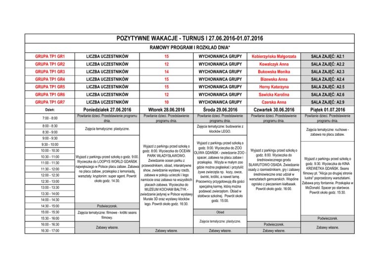 POZYTYWNE WAKACJE - TURNUS I 27.06.2016-01.07.2016 RAMOWY PROGRAM I ROZKŁAD DNIA* GRUPA TP1 GR1 LICZBA UCZESTNIKÓW 15 WYCHOWAWCA GRUPY Kobierzyńska Małgorzata SALA ZAJĘĆ: A2.1 GRUPA TP1 GR2 LICZBA UCZESTNIKÓW 12 WYCHOWAWCA GRUPY Kowalczyk Anna SALA ZAJĘĆ: A2.2 GRUPA TP1 GR3 LICZBA UCZESTNIKÓW 14 WYCHOWAWCA GRUPY Bukowska Monika SALA ZAJĘĆ: A2.3 GRUPA TP1 GR4 LICZBA UCZESTNIKÓW 15 WYCHOWAWCA GRUPY Bizewska Anna SALA ZAJĘĆ: A2.4 GRUPA TP1 GR5 LICZBA UCZESTNIKÓW 15 WYCHOWAWCA GRUPY Horny Katarzyna SALA ZAJĘĆ: A2.5 GRUPA TP1 GR6 LICZBA UCZESTNIKÓW 12 WYCHOWAWCA GRUPY Sawicka Karolina SALA ZAJĘĆ: A2.6 GRUPA TP1 GR7 LICZBA UCZESTNIKÓW 10 WYCHOWAWCA GRUPY Czerska Anna SALA ZAJĘĆ: A2.9 Dzień: Poniedziałek 27.06.2016 Wtorek 28.06.2016 Środa 29.06.2016 Czwartek 30.06.2016 Piątek 01.07.2016 7:00 - 8:00 Powitanie dzieci. Przedstawienie programu dnia. Powitanie dzieci. Przedstawienie programu dnia. Powitanie dzieci. Przedstawienie programu dnia. Powitanie dzieci. Przedstawienie programu dnia. Powitanie dzieci. Przedstawienie programu dnia. 8:00 - 8:30 8:30 - 9:00 Zajęcia tematyczne: budowanie z klocków LEGO. Zajęcia tematyczne: plastyczne. Zajęcia tematyczne: ruchowe zabawa na placu zabaw. 9:00 - 9:30 9:30 - 10:00 10:00 - 10:30 10:30 - 11:00 11:00 - 11:30 11:30 - 12:00 12:00 - 12:30 12:30 - 13:00 13:00 - 13:30 13:30 - 14:00 14:00 - 14:30 14:30 - 15:00 15:00 - 15:30 15:30 - 16:00 16:00 - 16:30 16:30 - 17:00 Wyjazd z parkingu przed szkołą o Wyjazd z parkingu przed szkołą o godz. 9:00. Wycieczka do ZOO godz. 8:00. Wycieczka do OCEAN OLIWA GDAŃSK - zwiedzanie ZOO - Wyjazd z parkingu przed szkołą o godz. 8:00. Wycieczka do PARK WŁADYSŁAWOWO. Wyjazd z parkingu przed szkołą o godz. 9:00. spacer, zabawa na placu zabaw i Wyjazd z parkingu przed szkołą o średniowiecznego grodu Zwiedzanie ocean parku z Wycieczka do LOOPYS WORLD GDAŃSK przekąska. Wizyta w małym zoo godz. 9:30. Wycieczka do KINA SŁAWUTOWO OSADA. Zwiedzanie przewodnikiem, obiad, interaktywne największego w Polsce placu zabaw. Zabawa gdzie można pogłaskać i przytulić KREWETKA GDAŃSK. Seans osady z rzemieślnikiem, gry i zabawy show, zwiedzanie wystawy rzeźb, na placu zabaw, przekąska z lemoniadą, żywe zwierzęta np. kozy, owce, filmowy pt. "Alicja po drugiej stronie średniowieczne oraz udział w zabawa w pokoju ucieczki i lego warsztaty: kryptonim: super agent. Powrót świnki, króliki, a nawet lamę. lustra" poprzedzony warsztatami. warsztatach garncarskich. Wspólne namiocie oraz zabawa na wszystkich około godz. 14:30. Pracownicy przygotowują dla gości Zabawa przy fontannie. Przekąska w ognisko z pieczeniem kiełbasek. placach zabawa. Wycieczka do specjalną karmę, którą można McDonald. Spacer po starówce. Powrót około godz. 16:00. MUZEUM KOCHAM BAŁTYK podawać zwierzętom. Obiad w Powrót około godz. 15:30. zwiedzanie jedynej w Polsce wystawy stołówce szkolnej. Powrót około Murale 3D oraz wystawy klocków godz. 15:00. lego. Powrót około godz. 16:30. Podwieczorek. Obiad Zajęcia tematyczne: filmowe - krótki seans filmowy. Zabawy własne. Zajęcia tematyczne: plastyczne. Zabawy własne. Zabawy własne. Podwieczorek. Podwieczorek. Zabawy własne. Zabawy własne.