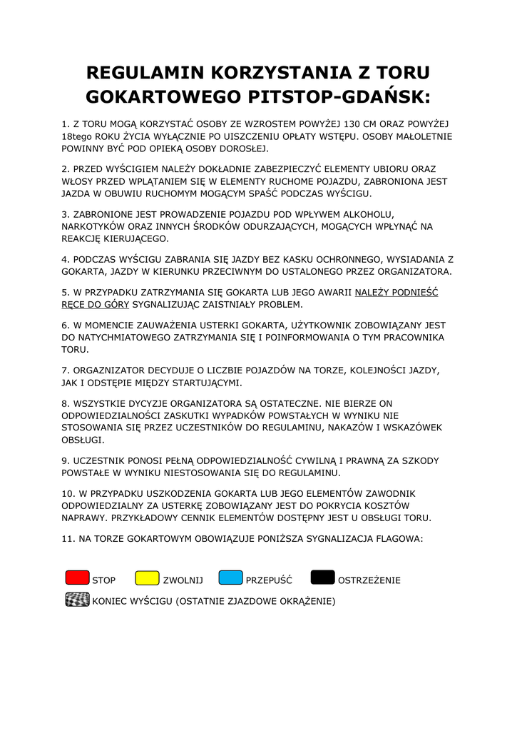 REGULAMIN KORZYSTANIA Z TORU GOKARTOWEGO PITSTOP-GDAŃSK: 1. Z TORU MOGĄ KORZYSTAĆ OSOBY ZE WZROSTEM POWYŻEJ 130 CM ORAZ POWYŻEJ 18tego ROKU ŻYCIA WYŁĄCZNIE PO UISZCZENIU OPŁATY WSTĘPU. OSOBY MAŁOLETNIE POWINNY BYĆ POD OPIEKĄ OSOBY DOROSŁEJ. 2. PRZED WYŚCIGIEM NALEŻY DOKŁADNIE ZABEZPIECZYĆ ELEMENTY UBIORU ORAZ WŁOSY PRZED WPLĄTANIEM SIĘ W ELEMENTY RUCHOME POJAZDU, ZABRONIONA JEST JAZDA W OBUWIU RUCHOMYM MOGĄCYM SPAŚĆ PODCZAS WYŚCIGU. 3. ZABRONIONE JEST PROWADZENIE POJAZDU POD WPŁYWEM ALKOHOLU, NARKOTYKÓW ORAZ INNYCH ŚRODKÓW ODURZAJĄCYCH, MOGĄCYCH WPŁYNĄĆ NA REAKCJĘ KIERUJĄCEGO. 4. PODCZAS WYŚCIGU ZABRANIA SIĘ JAZDY BEZ KASKU OCHRONNEGO, WYSIADANIA Z GOKARTA, JAZDY W KIERUNKU PRZECIWNYM DO USTALONEGO PRZEZ ORGANIZATORA. 5. W PRZYPADKU ZATRZYMANIA SIĘ GOKARTA LUB JEGO AWARII NALEŻY PODNIEŚĆ RĘCE DO GÓRY SYGNALIZUJĄC ZAISTNIAŁY PROBLEM. 6. W MOMENCIE ZAUWAŻENIA USTERKI GOKARTA, UŻYTKOWNIK ZOBOWIĄZANY JEST DO NATYCHMIATOWEGO ZATRZYMANIA SIĘ I POINFORMOWANIA O TYM PRACOWNIKA TORU. 7. ORGAZNIZATOR DECYDUJE O LICZBIE POJAZDÓW NA TORZE, KOLEJNOŚCI JAZDY, JAK I ODSTĘPIE MIĘDZY STARTUJĄCYMI. 8. WSZYSTKIE DYCYZJE ORGANIZATORA SĄ OSTATECZNE. NIE BIERZE ON ODPOWIEDZIALNOŚCI ZASKUTKI WYPADKÓW POWSTAŁYCH W WYNIKU NIE STOSOWANIA SIĘ PRZEZ UCZESTNIKÓW DO REGULAMINU, NAKAZÓW I WSKAZÓWEK OBSŁUGI. 9. UCZESTNIK PONOSI PEŁNĄ ODPOWIEDZIALNOŚĆ CYWILNĄ I PRAWNĄ ZA SZKODY POWSTAŁE W WYNIKU NIESTOSOWANIA SIĘ DO REGULAMINU. 10. W PRZYPADKU USZKODZENIA GOKARTA LUB JEGO ELEMENTÓW ZAWODNIK ODPOWIEDZIALNY ZA USTERKĘ ZOBOWIĄZANY JEST DO POKRYCIA KOSZTÓW NAPRAWY. PRZYKŁADOWY CENNIK ELEMENTÓW DOSTĘPNY JEST U OBSŁUGI TORU. 11. NA TORZE GOKARTOWYM OBOWIĄZUJE PONIŻSZA SYGNALIZACJA FLAGOWA: STOP ZWOLNIJ PRZEPUŚĆ KONIEC WYŚCIGU (OSTATNIE ZJAZDOWE OKRĄŻENIE) OSTRZEŻENIE ZASADY BEZPIECZNEJ JAZDY: 1. ZAKAZ WYSIADANIA Z GOKARTÓW PODCZAS TRWANIA WYŚCIGÓW, AŻ DO MOMENTU EWIDENTNEJ KOMENDY OBSŁUGI. 2. PIERWSZE OKRĄZENIE JEST ZAWSZE OKRĄŻENIEM ZAPOZNAWCZYM Z TOREM I ZE SPRZĘTEM – NALEŻY JE PRZEJECHAĆ SPOKOJNIE. 3. OSTATNI ODCINEK, PO ODMACHANIU FLAGĄ SZACHOWNICĄ, JEST ODCINKIEM ZJAZDOWYM, NALEŻY ZREDUKOWAĆ PRĘDKOŚĆ UWAŻAJĄC NA OBECNOŚĆ OBSŁUGI NA TORZE. 4. ZAKAZANIE JEST WCISKANIE DWÓCH PEDAŁÓW (GAZU ORAZ HAMULCA) JEDNOCZEŚNIE, A TAKŻE NACISKANIE HAMULCA BEZ PUSZCZENIA PEDAŁU GAZU – ZA NIEPRZESTRZEGANIE TEJ ZASADY SĘDZIA MOŻĘ USUNĄĆ ZAWODNIKA Z TORU. 5. ZAKAZANY JEST KONTAKT Z INNYMI GOKARTAMI, W SZCZEGÓLNOŚCI UDERZANIE WOLNIEJSZYCH POJAZDW W TYŁ, SPYCHANIE POJAZDU JADĄCEGO OBOK, ZAJEŻDZANIE DROGI. PIERSZEŃSTWO W SZYKANIE I ZWĘŻENIACH MA GOKART JADĄCY Z PRZODU. 6. OSOBY NIEPEWNE SWOICH UMIEJĘTNOŚCI, POCZĄTKUJĄCE, JADĄCE WOLNIEJ, ZOBOWIĄZANE SĄ DO JAZDY PRAWĄ STRONĄ TORU. 7. NIE WSKAZANE JEST HAMOWANIE NA ZAKRĘCIE, WCHODZĄC W ZAKRĘT NALEŻY ZREDUKOWAĆ PRĘDKOŚĆ W BEZPIECZNEJ ODLEGŁOŚCI. 8. NIE WSKAZANE JEST RUSZANIE GOKARTEM NA SKRĘCONYCH KOŁACH. 9. ZAKAZANE JEST PSEUDO ROZGRZEWANIE OPON PRZEZ ENERGICZNE SKRĘCANIE GOKARTEM OD LEWEJ DO PRAWEJ. ZA NIEPRZESTRZEGANIE ZASAD BEZPIECZNEJ JAZDY UCZESTNIK WYŚCIGU MOŻE ZOSTAĆ OBCIĄŻONY NASTĘPUJĄCYMI KARAMI: - ODEBRANIE PUNKTÓW PROMOCYJNYCH - ODEBRANIE RABATÓW - ZAKOŃCZENIE WYŚCIGÓW PRZED CZASEM BEZ PRAWA DO ODSZKODOWANIA, ZWROTU PIENIĘDZY - OBCIĄŻENIE KOSZTAMI NAPRAWY GOKARTA
