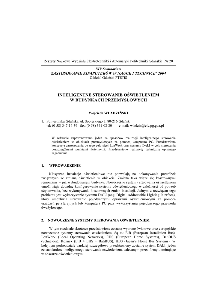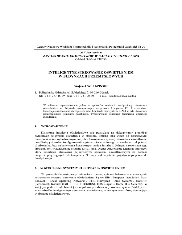 Zeszyty Naukowe Wydziału Elektrotechniki i Automatyki Politechniki Gdańskiej Nr 20 XIV Seminarium ZASTOSOWANIE KOMPUTERÓW W NAUCE I TECHNICE’ 2004 Oddział Gdański PTETiS INTELIGENTNE STEROWANIE OŚWIETLENIEM W BUDYNKACH PRZEMYSŁOWYCH Wojciech WŁADZIŃSKI 1. Politechnika Gdańska, ul. Sobieskiego 7, 80-216 Gdańsk tel: (0-58) 347-16-39 fax: (0-58) 341-08-80 e-mail: [email protected] W referacie zaprezentowano jeden ze sposobów realizacji inteligentnego sterowania oświetleniem w obiektach przemysłowych za pomocą komputera PC. Przedstawiono koncepcję zastosowania do tego celu sieci LonWork oraz systemu DALI w celu sterowania poszczególnymi punktami świetlnymi. Przedstawiono realizację techniczną opisanego zagadnienia. 1. WPROWADZENIE Klasyczne instalacje oświetleniowe nie pozwalają na dokonywanie przeróbek związanych ze zmianą oświetlenia w obiekcie. Zmiana taka wiąŜe się kosztownymi remontami w juŜ wybudowanym budynku. Nowoczesne systemy sterowania oświetleniem umoŜliwiają dowolne konfigurowanie systemu oświetleniowego w zaleŜności od potrzeb uŜytkownika, bez wykonywania kosztownych zmian instalacji. Jednym z rozwiązań tego problemu jest wykorzystanie systemu DALI (ang. Digital Addressable Lighting Interface), który umoŜliwia sterowanie pojedynczymi oprawami oświetleniowymi za pomocą urządzeń peryferyjnych lub komputera PC przy wykorzystaniu pojedynczego przewodu dwuŜyłowego. 2. NOWOCZESNE SYSTEMY STEROWANIA OŚWIETLENIEM W tym rozdziale skrótowo przedstawione zostaną wybrane światowe oraz europejskie nowoczesne systemy sterowania oświetleniem. Są to: EiB (Eurepean Installation Bus), LonWork (Local Operating Networks), EHS (European Home Systems), BatiBUS (Schneider), Konnex (EiB + EHS + BatiBUS), HBS (Japan’s Home Bus Systems). W kolejnym podrozdziale bardziej szczegółowo przedstawiony zostanie system DALI, jeden ze standardów inteligentnego sterowania oświetleniem, zalecanym przez firmy dominujące w obszarze oświetleniowym. - 212 2.1. Systemy sterowania oświetleniem Najbardziej popularnym systemem sterowania jest układ EiB (rys. 1). Opiera się on na strukturze drzewa. Najmniejszą jednostką jest linia (do niej podłączonych moŜe być max. 64 urządzeń), poszczególne linie (max. 12) łączą się z linią obszarową za pomocą elementów sprzęgających (sprzęgła liniowe - SL). Następnie poprzez sprzęgła obszarowe (SO) moŜna połączyć 15 obszarów, tworząc w ten sposób jeden system. Systemy moŜna łączyć z innymi strukturami tworząc układ o znacznej liczbie elementów. do następnej struktury SO SL SL SL SL 1 SO 2 SO 3 SO SL SL SL SL 1 1 1 1 2 2 2 2 3 3 3 3 64 12 15 3 2 64 64 64 64 1 2 3 12 1 Rys. 1 Struktura systemu EiB Innym układem sterowania, wywodzącym się z obszaru amerykańskiego jest system LonWork firmy Echelon. Tworzy go zbiór połączonych w sieć inteligentnych urządzeń noszących nazwę węzłów sieci, między którymi wyznaczono połączenia logiczne. Rolę węzła moŜe spełniać urządzenie fizyczne, jak przełącznik, czujnik pomiarowy, urządzenie wykonawcze lub urządzenie wykorzystywane do komunikacji z człowiekiem.Kolejnym systemem komunikacyjnym jest układ EHS. Prace nad systemem rozpoczęło kilka firm europejskich w 1990. JednakŜe produkty zgodne ze standardem EHS nie pojawiły się na rynku. Niemniej jednak system „Power-Line” na bazie standardu EHS odniósł na rynku znaczny sukces ze względu na prosty protokół komunikacyjny. System BatiBUS pochodzi głównie z obszaru Włoch i Francji. Liderem technologicznym jest firma francuska Groupe Schneider. Zakres ich działalności to oświetlenie, ogrzewanie, sterowanie energią, systemy dostępowe, inŜynieria systemów oraz oprogramowanie nadzorujące. System Konnex powstał w Europie ze względu na konkurencyjny amerykański system LON. Europejscy producenci w roku 1999 załoŜyli nową organizację Konnex. Miała ona za zadanie opracowanie nowego jednolitego standardu magistrali. Standard ten miał jednoczyć najlepsze cechy trzech systemów (BatiBUS, EiB, EHS), tak by zapewnić poprawną współpracę z produktami innych producentów. Ostatnim prezentowanym systemem jest układ HBS, który opracowany został w Japoni juŜ w roku 1988. Jako medium transmisyjne wykorzystywano 2-4 par przewodów, przewód koncentryczny lub linię zasilającą. - 213 2.2. System DALI W 2000 r. na międzynarodowych targach we Frankfurcie zaprezentowano po raz pierwszy produkty systemu DALI (Digital Addressable Lighting Interface), jako alternatywę systemu sterowania analogowego 1-10V. System jest wspólną inicjatywą takich czołowych producentów jak: Philips, Helvar, Osram i Tridonic [1]. W tradycyjnym systemie analogowym funkcje włączania i regulacji są oddzielne. Przez to wymagają one prowadzenia osobnych przewodów. Ponadto w celu utworzenia np. z sześciu opraw dwóch grup po trzy oprawy działające niezaleŜnie naleŜy zastosować dwa oddzielne obwody z osobnymi sterownikami. W systemie DALI funkcje włączania i regulacji są zintegrowane, a dzięki moŜliwości adresowania funkcji kaŜdego pojedynczego statecznika w oprawie, taki sam jak w przypadku układu analogowego, układ sześciu opraw moŜna rozwiązać w duŜo prostszy sposób. Otwarta konstrukcja systemu DALI pozwala na nieograniczoną współpracę ze sobą komponentów róŜnych producentów. a) b) DALI Statecznik DALI 230V Rys. 2 System DALI: a) linia zasilająca statecznik, b) podłączenie do statecznika Na rysunku 2b przedstawiono sposób podłączenia linii zasilającej i sterującej do statecznika DALI. Obydwie linie mogą być umieszczone w jednym przewodzie pięcioŜyłowym (rys. 2a). W zaleŜności od przekroju przewodu sterującego DALI ostatnie sterowane urządzenie nie moŜe być w odległości większej niŜ 300 m (dla przewodu 2x1,5 mm2) od urządzenia sterującego [2]. System DALI posiada takŜe pewne ograniczenia. Maksymalna liczba stateczników a