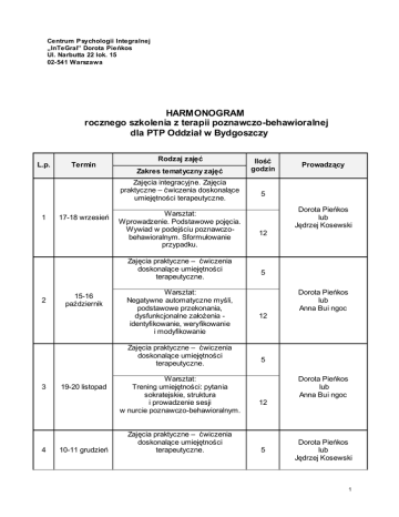 Centrum P sychologii Integralnej „InTeGral” Dorota Pieńkos Ul. Narbutta 22 lok. 15 02-541 Warszawa HARMONOGRAM rocznego szkolenia z terapii poznawczo-behawioralnej dla PTP Oddział w Bydgoszczy L.p. Termin Rodzaj zajęć Zakres tematyczny zajęć Zajęcia integracyjne. Zajęcia praktyczne – ćwiczenia doskonalące umiejętności terapeutyczne. 1 17-18 wrzesień Warsztat: Wprowadzenie. Podstawowe pojęcia. Wywiad w podejściu poznawczobehawioralnym. Sformułowanie przypadku. Zajęcia praktyczne – ćwiczenia doskonalące umiejętności terapeutyczne. 2 15-16 październik Warsztat: Negatywne automatyczne myśli, podstawowe przekonania, dysfunkcjonalne założenia identyfikowanie, weryfikowanie i modyfikowanie Zajęcia praktyczne – ćwiczenia doskonalące umiejętności terapeutyczne. 3 4 19-20 listopad 10-11 grudzień Warsztat: Trening umiejętności: pytania sokratejskie, struktura i prowadzenie sesji w nurcie poznawczo-behawioralnym. Zajęcia praktyczne – ćwiczenia doskonalące umiejętności terapeutyczne. Ilość godzin Prowadzący 5 Dorota Pieńkos lub Jędrzej Kosewski 12 5 Dorota Pieńkos lub Anna Bui ngoc 12 5 Dorota Pieńkos lub Anna Bui ngoc 12 5 Dorota Pieńkos lub Jędrzej Kosewski 1 Warsztat: Eksperyment behawioralny. Zajęcia praktyczne – ćwiczenia doskonalące umiejętności terapeutyczne. 5 6 14-15 styczeń 18-19 luty Warsztat: Zaburzenia lękowe. Lęk uogólniony. Ataki paniki. Fobia społeczna. OCD. Zajęcia praktyczne – ćwiczenia doskonalące umiejętności terapeutyczne. Warsztat: Stres, ASD i PTSD. Zajęcia praktyczne – ćwiczenia doskonalące umiejętności terapeutyczne. 7 17-18 marzec Warsztat: Depresja. Ocena ryzyka i postępowanie w sytuacji zagrożenia samobójstwem. Zajęcia praktyczne – ćwiczenia doskonalące umiejętności terapeutyczne. 8 14-15 kwiecień Warsztat: Pokonywanie niskiej samooceny. Radzenie sobie ze złością. Zajęcia praktyczne – ćwiczenia doskonalące umiejętności terapeutyczne. 9 10 11 12-13 maj 16-17 czerwiec 15-16 wrzesień Warsztat: Zaburzenia odżywiania: kompulsyjne jedzenie, bulimia, anoreksja. Zajęcia praktyczne – ćwiczenia doskonalące umiejętności terapeutyczne. Warsztat: Terapia zaburzeń osobowości. Zajęcia praktyczne – ćwiczenia doskonalące umiejętności terapeutyczne. Warsztat: Czynniki zmiany w pracy klinicznej 12 5 Dorota Pieńkos lub Jędrzej Kosewski 12 5 Dorota Pieńkos lub Anna Bui ngoc 12 5 Jędrzej Kosewski lub Dorota Pieńkos 12 5 Jędrzej Kosewski lub Anna Bui ngoc 12 5 Dorota Pieńkos lub Anna Bui ngoc 12 5 12 5 Jędrzej Kosewski lub Anna Bui ngoc Dorota Pieńkos lub Anna Bui ngoc 12 2 (relacja terapeutyczna, psychoedukacja, motywacja). Kodeks etyczny. Zajęcia praktyczne – ćwiczenia doskonalące umiejętności terapeutyczne. 12 13-14 październik Warsztat: Podsumowanie zdobytej wiedzy i umiejętności. Standardy kształcenia w psychoterapii. 5 Dorota Pieńkos lub Anna Bui ngoc 12 Kierownik Szkolenia /-/ mgr Dorota Pieńkos 3