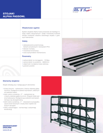 Stojaki ALPHA PASSONI. Wiadomości ogólne System stojaków Alpha można stosować do każdego rodzaju baterii stacjonarnych. Dzięki modułowej budowie istnieje możliwość złożenia dowolnego stojaka z gotowych elementów. Zalety • zabezpieczenie przed korozją farbami proszkowymi i tworzywem PCV, • łatwość montażu, • modułowa konstrukcja, • duża wytrzymałość mechaniczna. Parametry • wytrzymałość na rozciąganie – 10 Mpa, • wytrzymałość na przebicie – 600kV/cm • odporność na stężony kwas siarkowy • grubość powłoki: Elementy stojaków Stojaki składają się z następujących elementów: • ściany boczne – wytwarzane z blachy stalowej giętej na zimno. Dostępne w czterech wymiarach, zależnych od wielkości baterii. • belki nośne o przekroju ,,C” – wytwarzane są z blachy stalowej giętej na zimno. Długość belek jest znormalizowana. Dostępne są w czterech rozmiarach, różniące się obciążalnością. • belki nośne o przekroju ,,h” – stosowane w przypadku użycia ścian bocznych o dużej ilości rzędów lub dużych obciążeń. • listwy usztywniające – wzmacniają i usztywniają konstrukcję Stojaki ALPHA PASSONI. Ściany boczne Montaż stojaków Wszystkie połączenia między elementami zrealizowano za pomocą śrub co zapewnia szybki montaż oraz trwałość i stabilność konstrukcji Stojaki ALPHA PASSONI. Belki nośne typ „C“ Belki nośne typ „h“ Produkcja Instalacje Remonty i modernizacja Przeglądy utylizacja serwis ETC plus sp. z o.o. ul. Drukarska 14 27-400 Ostrowiec Świętokrzyski tel. +48 41 26 36 811 fax:+48 41 26 54 443 e-mail:[email protected]