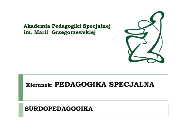 Akademia Pedagogiki Specjalnej im. Marii Grzegorzewskiej Kierunek: PEDAGOGIKA SPECJALNA SURDOPEDAGOGIKA SURDOPEDAGOGIKA SYLWETKA ABSOLWENTA Absolwent surdopedagogiki uzyskuje wiedzę i umiejętności w zakresie: dydaktyki wczesnoszkolnej, dydaktyki pracy w internacie dla dzieci z uszkodzonym słuchem oraz organizacji czasu wolnego, stosowania specjalnych metod korekcyjno-kompensacyjnych przeznaczonych dla dzieci z wadą słuchu, surdologopedii, audiologii, technicznych środków korekcyjnych i psychologii dziecka z wadą słuchu. Nabyte umiejętności potrafi zastosować w procesach edukacji, wychowania i rehabilitacji. Posługuje się alternatywnymi metodami komunikowania się z dzieckiem z wadą słuchu. Absolwent surdopedagogiki potrafi przeciwdziałać marginalizacji, a także dostrzega potrzeby i możliwości osób z wadą słuchu. SURDOPEDAGOGIKA CHARAKTERYSTYKA PROGRAMU KSZTAŁCENIA Studia z zakresu surdopedagogiki obejmują szereg przedmiotów ogólnych stanowiących podstawę wiedzy teoretycznej z zakresu między innymi: - nauk medycznych, - filozofii, pedagogiki, - psychologii Przedmioty specjalistyczne związane z procesem kompensacji, korektury i usprawniania dzieci z uszkodzonym słuchem, tj.: - audiologię, - wczesną stymulację rozwoju dziecka z wadą słuchu, - surdologopedię, - System Językowo Migowy, Polski Język Migowy, - metodykę nauczania przedszkolnego i wczesnoszkolnego dzieci niesłyszących i słabo słyszących SURDOPEDAGOGIKA MOŻLIOWŚCI ZATRUDNIENIA ABSOLWENTA Absolwenci uzyskują kwalifikacje do pracy na stanowisku: 1) nauczyciela : - w przedszkolu (oddziałach) specjalnych dla dzieci głuchych i słabo słyszących - w szkołach podstawowych dla dzieci głuchych i słabo słyszących 2) nauczyciela wspierającego w: - w przedszkolu (oddziale) integracyjnym - w szkołach integracyjnych 3) terapeuty – pedagoga specjalnego w: - w ośrodku wczesnej interwencji - poradniach rehabilitacyjnych, poradniach zdrowia psychicznego - poradniach psychologiczno – pedagogicznych SURDOPEDAGOGIKA DLACZEGO WARTO STUDIOWAĆ? Studiowanie na specjalności surdopedagogika: daje możliwość rozwoju własnych zainteresowań poznanie świata osób z wadą słuchu poznanie metod komunikacji z osobami z wadą słuchu (SJM, PJM), zdobycie nowych doświadczeń i umiejętności dzięki uczestnictwu w różnorodnych zajęciach specjalizacyjnych zdobycie praktycznego przygotowania do zawodu surdopedagoga aktywne uczestnictwo w działaniach na rzecz społeczności osób z wadą słuchu SURDOPEDAGOGIKA WYMAGANIA REKTUTACYJNE NA SPECJALNOŚĆ SURDOPEDAGOGIKA: egzamin: pisemny w formie testu – pytania otwarte (ok. 20 pytań) – tylko dla studiów stacjonarnych SURDOPEDAGOGIKA ZAKRES PROBLEMATYKI Surdopedagogika – definicja pojęcia Nauki współpracujące z surdopedagogiką Pierwsze szkoły dla głuchych w Europie Rozwój szkolnictwa dla głuchych w Polsce Klasyfikacje osób z wadą słuchu ze względu na stopień ubytku słuchu Klasyfikacje osób z wadą słuchu ze względu na czas wystąpienia wady słuchu Klasyfikacje osób z wadą słuchu ze względu na miejsce uszkodzenia narządu słuchu Przyczyny uszkodzenia narządu słuchu Definicja osoby z uszkodzonym narządem słuchu Definicje osób niesłyszących i słabo słyszących SURDOPEDAGOGIKA ZAKRES PROBLEMATYKI Pojęcie wczesnej diagnozy dziecka z wadą słuchu Pojecie wczesnej rehabilitacji (rewalidacji) dziecka z uszkodzonym narządem słuchu Etapy rozwoju mowy u dzieci z wadą słuchu Ćwiczenia przygotowujące dziecko z wadą słuchu do mówienia Rodzaje i zastosowanie środków elektroakustycznych w rewalidacji dziecka z wadą słuchu Problemy odczytywania mowy z ust Sposoby komunikowania się osób z wadą słuchu Rodzaje przedszkoli dla dzieci z wadą słuchu Rodzaje szkół dla dzieci i młodzieży z wadą słuchu Instytucje działające na rzecz osób z wadą słuchu SURDOPEDAGOGIKA LITERATURA 1) Buryn U., Hulboj T., Kowalska M., Podziemska T. (2001) Mój uczeń nie słyszy. Poradnik dla nauczycieli szkół ogólnodostępnych. Wyd. MEN, Warszawa 2) 3) Dykcik W. (2003) Pedagogika specjalna. Wyd. Naukowe UAM, Poznań Eckert U.(red.), (1998) Wybrane zagadnienia z surdopedagogiki. Wyd. Naukowe WSPS, Warszawa 4) Hoffmann B. (2001) Surdopedagogika w teorii i praktyce. Wyd. WSP TWP, Warszawa 5) Siedlecka H., Kulczycka E. (red.) (2000) Współczesne kierunki wczesnej diagnozy i wczesnej rewalidacji dziecka z wadą słuchu. Konferencja Naukowa Warszawa, 9 maja 2000. Wyd. APS, Warszawa 6) Szczepankowski B. (1999) Niesłłszący Wyrównywanie szans. WSiP, Warszawa – głusi – głuchoniemi. Nazwa specjalności Kierownik specjalności: dr hab..Małgorzata Kupisiewicz tel. +48 22 589 36 00 wew. 3529 e-mail: [email protected] Osoba odpowiedzialna za proces rekrutacji w roku akad. 2014/15: dr Katarzyna Wereszka tel. +48 22 589 36 00 wew. 3529 e-mail: [email protected]
