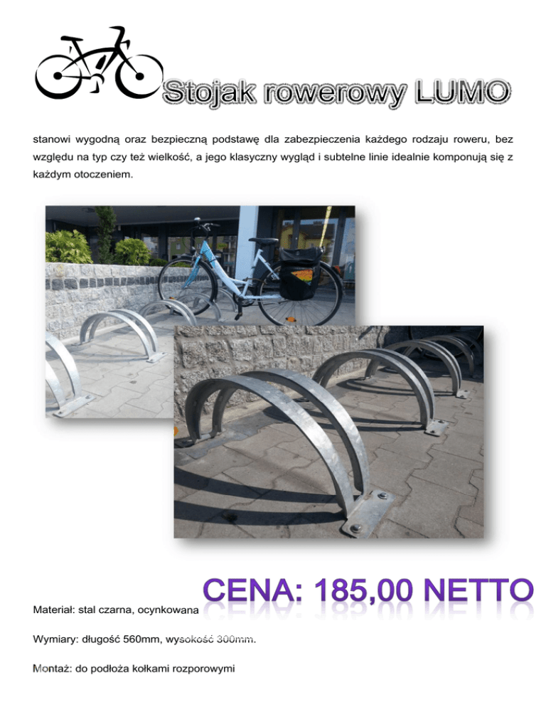stanowi wygodną oraz bezpieczną podstawę dla zabezpieczenia każdego rodzaju roweru, bez względu na typ czy też wielkość, a jego klasyczny wygląd i subtelne linie idealnie komponują się z każdym otoczeniem. Materiał: stal czarna, ocynkowana Wymiary: długość 560mm, wysokość 300mm. Montaż: do podłoża kołkami rozporowymi