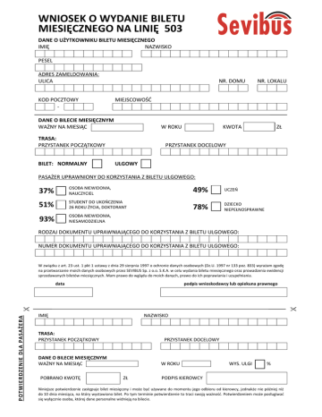 WNIOSEK O WYDANIE BILETU MIESIĘCZNEGO NA LINIĘ 503 DANE O UŻYTKOWNIKU BILETU MIESIĘCZNEGO IMIĘ NAZWISKO PESEL ADRES ZAMELDOWANIA: ULICA KOD POCZTOWY - NR. DOMU MIEJSCOWOŚĆ DANE O BILECIE MIESIĘCZNYM WAŻNY NA MIESIĄC W ROKU TRASA: PRZYSTANEK POCZĄTKOWY BILET: NORMALNY NR. LOKALU KWOTA ZŁ PRZYSTANEK DOCELOWY ULGOWY PASAŻER UPRAWNIONY DO KORZYSTANIA Z BILETU ULGOWEGO: 37% OSOBA NIEWIDOMA, NAUCZYCIEL 51% STUDENT DO UKOŃCZENIA 26 ROKU ŻYCIA, DOKTORANT 93% OSOBA NIEWIDOMA, NIESAMODZIELNA 49% UCZEŃ 78% DZIECKO NIEPEŁNOSPRAWNE RODZAJ DOKUMENTU UPRAWNIAJĄCEGO DO KORZYSTANIA Z BILETU ULGOWEGO: NUMER DOKUMENTU UPRAWNIAJĄCEGO DO KORZYSTANIA Z BILETU ULGOWEGO: W związku z art. 23 ust. 1 pkt 1 ustawy z dnia 29 sierpnia 1997 o ochronie danych osobowych (Dz.U. 1997 nr 133 poz. 833) wyrażam zgodę na przetwarzanie moich danych osobowych przez SEVIBUS Sp. z o.o. S.K.A. w celu wydania biletu miesięcznego oraz prowadzenia ewidencji sprzedawanych biletów miesięcznych. Mam prawo do wglądu do moich danych, prawo do ich poprawiania i uzupełniania. data podpis wnioskodawcy lub opiekuna prawnego POTWIERDZENIE DLA PASAŻERA IMIĘ NAZWISKO TRASA: PRZYSTANEK POCZĄTKOWY PRZYSTANEK DOCELOWY DANE O BILECIE MIESIĘCZNYM WAŻNY NA MIESIĄC POBRANO KWOTĘ W ROKU ZŁ WYS. ULGI % PODPIS KIEROWCY Niniejsze potwierdzenie zastępuje bilet miesięczny i może być używane do momentu jego odbioru od kierowcy, jednakże nie później niż do 10 dnia miesiąca, na który wystawiono bilet. Po tym terminie potwierdzenie to traci swoją ważność. Potwierdzeniem może posługiwać się wyłącznie osoba, której dane personalne widnieją na bilecie.