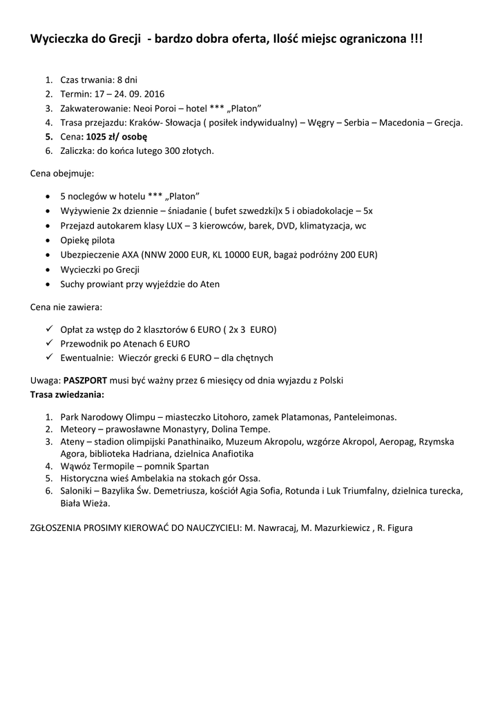 Wycieczka do Grecji - bardzo dobra oferta, Ilość miejsc ograniczona !!! 1. 2. 3. 4. 5. 6. Czas trwania: 8 dni Termin: 17 – 24. 09. 2016 Zakwaterowanie: Neoi Poroi – hotel *** „Platon” Trasa przejazdu: Kraków- Słowacja ( posiłek indywidualny) – Węgry – Serbia – Macedonia – Grecja. Cena: 1025 zł/ osobę Zaliczka: do końca lutego 300 złotych. Cena obejmuje: 5 noclegów w hotelu *** „Platon” Wyżywienie 2x dziennie – śniadanie ( bufet szwedzki)x 5 i obiadokolacje – 5x Przejazd autokarem klasy LUX – 3 kierowców, barek, DVD, klimatyzacja, wc Opiekę pilota Ubezpieczenie AXA (NNW 2000 EUR, KL 10000 EUR, bagaż podróżny 200 EUR) Wycieczki po Grecji Suchy prowiant przy wyjeździe do Aten Cena nie zawiera: Opłat za wstęp do 2 klasztorów 6 EURO ( 2x 3 EURO) Przewodnik po Atenach 6 EURO Ewentualnie: Wieczór grecki 6 EURO – dla chętnych Uwaga: PASZPORT musi być ważny przez 6 miesięcy od dnia wyjazdu z Polski Trasa zwiedzania: 1. Park Narodowy Olimpu – miasteczko Litohoro, zamek Platamonas, Panteleimonas. 2. Meteory – prawosławne Monastyry, Dolina Tempe. 3. Ateny – stadion olimpijski Panathinaiko, Muzeum Akropolu, wzgórze Akropol, Aeropag, Rzymska Agora, biblioteka Hadriana, dzielnica Anafiotika 4. Wąwóz Termopile – pomnik Spartan 5. Historyczna wieś Ambelakia na stokach gór Ossa. 6. Saloniki – Bazylika Św. Demetriusza, kościół Agia Sofia, Rotunda i Luk Triumfalny, dzielnica turecka, Biała Wieża. ZGŁOSZENIA PROSIMY KIEROWAĆ DO NAUCZYCIELI: M. Nawracaj, M. Mazurkiewicz , R. Figura
