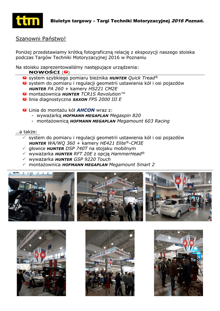 Biuletyn targowy – Targi Techniki Motoryzacyjnej 2016 Poznań. Szanowni Państwo! Poniżej przedstawiamy krótką fotograficzną relację z ekspozycji naszego stoiska podczas Targów Techniki Motoryzacyjnej 2016 w Poznaniu Na stoisku zaprezentowaliśmy następujące urządzenia: NOWOŚCI () system szybkiego pomiaru bieżnika HUNTER Quick Tread® system do pomiaru i regulacji geometrii ustawienia kół i osi pojazdów HUNTER PA 260 + kamery HS221 CM2E montażownica HUNTER TCR1S Revolution™ linia diagnostyczna SAXON FPS 2000 III E Linia do montażu kół AHCON wraz z: - wyważarką HOFMANN MEGAPLAN Megaspin 820 - montażownicą HOFMANN MEGAPLAN Megamount 603 Racing …a także: system do pomiaru i regulacji geometrii ustawienia kół i osi pojazdów HUNTER WA/WQ 360 + kamery HE421 Elite®-CM3E głowice HUNTER DSP 740T na stojaku mobilnym wyważarka HUNTER RFT 20E z opcją HammerHead® wyważarka HUNTER GSP 9220 Touch montażownica HOFMANN MEGAPLAN Megamount Smart 2 Biuletyn targowy – Targi Techniki Motoryzacyjnej 2016 Poznań.