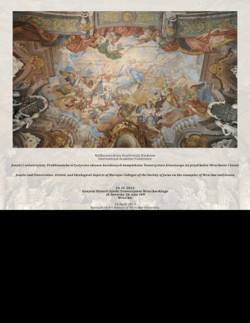 Międzynarodowa Konferencja Naukowa International Academic Conference Jezuici i uniwersytety. Problematyka artystyczno-ideowa barokowych kompleksów Towarzystwa Jezusowego na przykładzie Wrocławia i Genui Jesuits and Universities. Artistic and Ideological Aspects of Baroque Colleges of the Society of Jesus on the examples of Wrocław and Genoa 24. IV. 2013 Instytut Historii Sztuki Uniwersytetu Wrocławskiego ul. Szewska 36, sala 309 Wrocław 24 April 2013 Institute of Art History of Wrocław University 36 Szewska Street, Room 309 Wrocław Program konferencji / Programme of the conference 9.00 – 9.20 - otwarcie konferencji przez Prorektora Uniwersytetu Wrocławskiego Prof. dra hab. Adama Jezierskiego, Dziekana Wydziału Nauk Historycznych i Pedagogicznych UWr Prof. dr hab. Elżbietę Kościk i Dyrektora Instytutu Historii Sztuki UWr Dra hab. Romualda Kaczmarka / opening of the conference by the Vice-Rector of Wrocław University Professor Adam Jezierski, the Dean of the Faculty of Historical and Pedagogical Sciences of Wrocław University Professor Eliżbieta Kościk and the Director of the Institute of Art History of Wrocław University Professor Romuald Kaczmarek Blok I / Part I Prowadzący obrady / Moderator: Prof. dr hab. Jan Wrabec (Uniwersytet Wrocławski) 9.30 - 9.50 – Gruppo di lavoro genovese (Università degli Studi di Genova), La Sala del Collegio dei Gesuiti a Genova / The Hall of the Jesuit College in Genoa 9.50 - 10.10 – Prof. Lauro Magnani (Università degli Studi di Genova), La presenza a Genova di Giuseppe Castiglione prima della missione in Cina: la sede gesuitica genovese come luogo di formazione e di sperimentazione di strategie di comunicazione artistica / The Presence of Giuseppe Castiglione in Genoa before his Mission in China: The Jesuit Seat in Genoa as a Place of Forming and Testing of Strategies for Artistic Communication. 10.10 - 10.30 - Dott. Giacomo Montanari (Università degli Studi di Genova), La Libraria del Collegio o “Sala Terza” / The Library or the“Sala Terza” of the Jesuit College in Genoa 10. 30 – 10.50 - Prof. Laura Stagno (Università degli Studi di Genova, Palazzo Principe), Le iconografie di Sant'Anna Mater Virginis nella committenza dell'ordine gesuita: il caso genovese / The Iconography of Saint Anne Mater Virginis in the Commissions of the Jesuit Order: the Case of Genoa 10.50 – 11.10 – dyskusja / discussion 11.10 - 11.30 – przerwa na kawę / coffee break 11.50 – 12.10 – Dr Dariusz Galewski (Akademia Muzyczna we Wrocławiu), Architektura kolegiów jezuickich w prowincji czeskiej ze szczególnym uwzględnieniem Śląska / The Architecture of Jesuit Colleges in the Bohemian Province with regard to Silesia 12.10 – 12.30 – Dr Małgorzata Wyrzykowska (Uniwersytet Wrocławski) Wybrane zagadnienia dotyczące architektury gmachu głównego Uniwersytetu Wrocławskiego / Selected Problems related to the Architecture of the Main Building of Wrocław University 12.30 – 13.00 – Mgr Rafał Karlik, Dr hab. Andrzej Kozieł, prof. UWr, Dr Agnieszka Seidel-Grzesińska, (Uniwersytet Wrocławski), Aula Leopoldyńska Uniwersytetu Wrocławskiego jako świątynia Mądrości Bożej. Uwagi o programie ideowym i jego źródłach / The Aula Leopoldina of Wrocław University as the Temple of Divine Wisdom. Remarks on the Iconographical Programme and on its Sources 13.00 – 13.20 – Mgr Romuald Nowak (Muzeum Narodowe we Wrocławiu) Personifikacje Cnót Kardynalnych z portalu Uniwersytetu Wrocławskiego / The Personifications of the Cardinal Virtues in the Portal of Wrocław University 13.20 – 13.40 – dyskusja / discussion 13. 40 – 14.20 - zwiedzanie Auli Leopoldina Uniwersytetu Wrocławskiego/ Sightseeing of the Aula Lepoldina of Wrocław University 14.30-15.40 –obiad/ dinner Blok III/ Part III Prowadzący obrady / Moderator : Prof. dr hab. Andrzej Baranowski (Instytut Sztuki Polskiej Akademii Nauk, Warszawa) 15.40 – 16.00 – Prof. Regina Poso (Università degli Studi di Lecce) Chiesa del Gesù di Lecce / The Church del Gesù in Lecce 16.00 – 16.20 - Dr Arkadiusz Wojtyła (Uniwersytet Wrocławski) „Die Kirche auf der Burg“. Uwagi o architekturze kościoła Najświętszego Imienia Jezus we Wrocławiu oraz o okolicznościach jego fundacji / „Die Kirche auf der Burg“. Remarks on the Architecture of the Church of the Most Holy Name of Jesus in Wrocław and on the Circumstances of its Foundation 16.20 – 16.40 - Mgr Anna Jezierska (Uniwersytet Wrocławski) Rola retoryki w kształtowaniu barokowego wnętrza kościoła Najświętszego Imienia Jezus we Wrocławiu i gmachu Leopoldiny / The Role of Rhetoric in the shaping of the Baroque Interior of the Church of the Most Holy Name of Jesus and the Leopoldina Building. 16.40 - 17.00 – dyskusja / discussion Blok II/ Part II Prowadzący obrady / Moderator: Dr Elżbieta Kołaczkiewicz (Uniwersytet Wrocławski) 11.30 – 11.50 - Prof. dr hab. Andrzej Baranowski (Instytut Sztuki Polskiej Akademii Nauk, Warszawa), Dynastyczne tło akademii jezuickich w Europie Środkowej / The Dynastic Background of the Jesuit Academies in the Central Europe 17.20 – 18.00 – zwiedzanie kościoła Najświętszego Imienia Jezus we Wrocławiu / Sightseeing of the Church of the Most Holy Name of Jesus in Wrocław 19.00 – kolacja / supper
