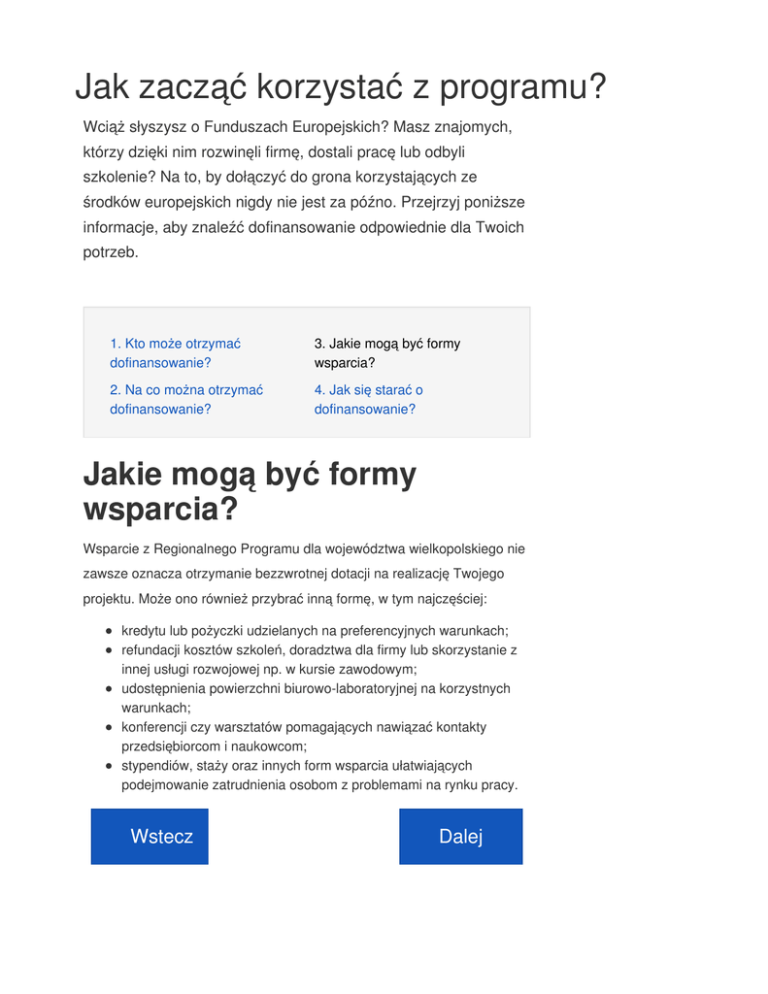 Jak zacząć korzystać z programu? Wciąż słyszysz o Funduszach Europejskich? Masz znajomych, którzy dzięki nim rozwinęli firmę, dostali pracę lub odbyli szkolenie? Na to, by dołączyć do grona korzystających ze środków europejskich nigdy nie jest za późno. Przejrzyj poniższe informacje, aby znaleźć dofinansowanie odpowiednie dla Twoich potrzeb. 1. Kto może otrzymać dofinansowanie? 3. Jakie mogą być formy wsparcia? 2. Na co można otrzymać dofinansowanie? 4. Jak się starać o dofinansowanie? Jakie mogą być formy wsparcia? Wsparcie z Regionalnego Programu dla województwa wielkopolskiego nie zawsze oznacza otrzymanie bezzwrotnej dotacji na realizację Twojego projektu. Może ono również przybrać inną formę, w tym najczęściej: kredytu lub pożyczki udzielanych na preferencyjnych warunkach; refundacji kosztów szkoleń, doradztwa dla firmy lub skorzystanie z innej usługi rozwojowej np. w kursie zawodowym; udostępnienia powierzchni biurowo-laboratoryjnej na korzystnych warunkach; konferencji czy warsztatów pomagających nawiązać kontakty przedsiębiorcom i naukowcom; stypendiów, staży oraz innych form wsparcia ułatwiających podejmowanie zatrudnienia osobom z problemami na rynku pracy. Wstecz Dalej