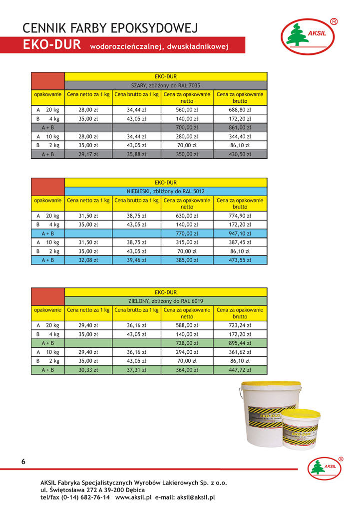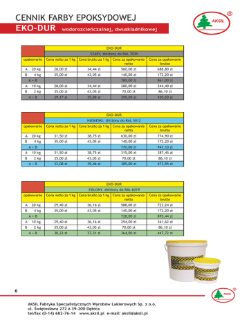 CENNIK FARBY EPOKSYDOWEJ EKO-DUR wodorozcieńczalnej, dwuskładnikowej EKO-DUR SZARY, zbliżony do RAL 7035 opakowanie Cena netto za 1 kg Cena brutto za 1 kg Cena za opakowanie netto Cena za opakowanie brutto A 20 kg 28,00 zł 34,44 zł 560,00 zł 688,80 zł B 4 kg 35,00 zł 43,05 zł 140,00 zł 172,20 zł 700,00 zł 861,00 zł A+B A 10 kg 28,00 zł 34,44 zł 280,00 zł 344,40 zł B 2 kg 35,00 zł 43,05 zł 70,00 zł 86,10 zł 29,17 zł 35,88 zł 350,00 zł 430,50 zł A+B EKO-DUR NIEBIESKI, zbliżony do RAL 5012 opakowanie A B Cena netto za 1 kg Cena brutto za 1 kg Cena za opakowanie netto 20 kg 31,50 zł 38,75 zł 630,00 zł 774,90 zł 4 kg 35,00 zł 43,05 zł 140,00 zł 172,20 zł 770,00 zł 947,10 zł 315,00 zł 387,45 zł A+B A B Cena za opakowanie brutto 10 kg 31,50 zł 38,75 zł 2 kg 35,00 zł 43,05 zł 70,00 zł 86,10 zł 32,08 zł 39,46 zł 385,00 zł 473,55 zł A+B EKO-DUR ZIELONY, zbliżony do RAL 6019 opakowanie Cena netto za 1 kg Cena brutto za 1 kg Cena za opakowanie netto Cena za opakowanie brutto A 20 kg 29,40 zł 36,16 zł 588,00 zł 723,24 zł B 4 kg 35,00 zł 43,05 zł 140,00 zł 172,20 zł 728,00 zł 895,44 zł A A+B 10 kg 29,40 zł 36,16 zł 294,00 zł 361,62 zł B 2 kg 35,00 zł 43,05 zł 70,00 zł 86,10 zł 30,33 zł 37,31 zł 364,00 zł 447,72 zł A+B 6 AKSIL Fabryka Specjalistycznych Wyrobów Lakierowych Sp. z o.o. ul. Świętosława 272 A 39-200 Dębica tel/fax (0-14) 682-76-14 www.aksil.pl e-mail: [email protected]