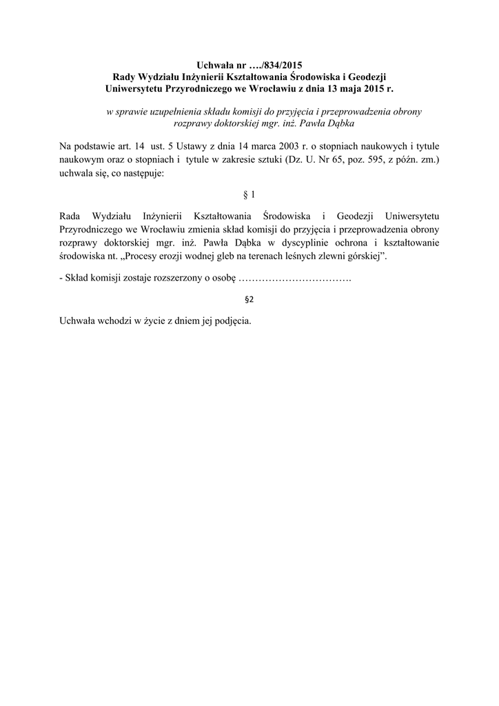Uchwała nr …./834/2015 Rady Wydziału Inżynierii Kształtowania Środowiska i Geodezji Uniwersytetu Przyrodniczego we Wrocławiu z dnia 13 maja 2015 r. w sprawie uzupełnienia składu komisji do przyjęcia i przeprowadzenia obrony rozprawy doktorskiej mgr. inż. Pawła Dąbka Na podstawie art. 14 ust. 5 Ustawy z dnia 14 marca 2003 r. o stopniach naukowych i tytule naukowym oraz o stopniach i tytule w zakresie sztuki (Dz. U. Nr 65, poz. 595, z późn. zm.) uchwala się, co następuje: §1 Rada Wydziału Inżynierii Kształtowania Środowiska i Geodezji Uniwersytetu Przyrodniczego we Wrocławiu zmienia skład komisji do przyjęcia i przeprowadzenia obrony rozprawy doktorskiej mgr. inż. Pawła Dąbka w dyscyplinie ochrona i kształtowanie środowiska nt. „Procesy erozji wodnej gleb na terenach leśnych zlewni górskiej”. - Skład komisji zostaje rozszerzony o osobę ……………………………. §2 Uchwała wchodzi w życie z dniem jej podjęcia. Uchwała nr …./834/2015 Rady Wydziału Inżynierii Kształtowania Środowiska i Geodezji Uniwersytetu Przyrodniczego we Wrocławiu z dnia 13 maja 2015 r. w sprawie powołania Rady Biznesu Wydziału Inżynierii Kształtowania Środowiska i Geodezji Uniwersytetu Przyrodniczego we Wrocławiu Na podstawie § 15 Statutu Uniwersytetu Przyrodniczego we Wrocławiu uchwala się, co następuje: §1 Rada Wydziału Inżynierii Kształtowania Środowiska i Geodezji Uniwersytetu Przyrodniczego we Wrocławiu powołuje Radę Biznesu Wydziału Inżynierii Kształtowania Środowiska i Geodezji Uniwersytetu Przyrodniczego we Wrocławiu w następującym składzie: 1. Maria Grzegorczyk - Urząd Marszałkowski Województwa Dolnośląskiego 2. Anna Krzyżanowska - Urząd Marszałkowski Województwa Dolnośląskiego 3. Jolanta Krupowicz - Urząd Województwa Dolnośląskiego we Wrocławiu 4. Alicja Bogusz - Urząd Miejski Wrocławia 5. dr Ryszard Kosierb - Instytut Meteorologii i Gospodarki Wodnej Oddział we Wrocławiu 6. Edward Nawirski - Regionalny Zarząd Gospodarki Wodnej 7. Joanna Gustowska - Dolnośląski Zarząd Melioracji i Urządzeń Wodnych 8. Witold Rzewuski - Dolnośląski Zarząd Melioracji i Urządzeń Wodnych 9. Piotr Peregudowski - Grupa Projektowa „GP OMEGA” Projektowanie Instalacji i Sieci Sanitarnych 10. Wiesław Pomian - „GEO –POMIAN-ZUG” Zespól Usług Geodezyjnych 11. Andrzej Kubica - „WROBIS” SA 12. Piotr Surma - Wrocławskie Przedsiębiorstwo Budowlane WPB 13. bryg. mgr inż. Jan Ciętak - Komenda Powiatowej Państwowej Straży Pożarnej 14. Danuta Stacherzak - PHHU „Zieleń dawne MPZ” sp. z. p. o 15. Janusz Szczepański - Dolnośląska Izba Inżynierów Budownictwa we Wrocławiu 16. Jerzy Ulanicki - Wrocławskie Biuro Urbanistyki s.c. 17. Alicja Meusz - Urząd Województwa Dolnośląskiego we Wrocławiu 18. Andrzej Pawłowski - Dolnośląska Izba Inżynierów Budownictwa we Wrocławiu 19. Jarosław Haliniak - Pełnomocnik Dziekana ds. Praktyk §2 Uchwała wchodzi w życie z dniem jej podjęcia. Uchwała nr …./834/2015 Rady Wydziału Inżynierii Kształtowania Środowiska i Geodezji Uniwersytetu Przyrodniczego we Wrocławiu z dnia 13 maja 2015 r. w sprawie zatwierdzenia Regulaminu Rady Biznesu Wydziału Inżynierii Kształtowania Środowiska i Geodezji Uniwersytetu Przyrodniczego we Wrocławiu Na podstawie § 15 ust. 3 Statutu Uniwersytetu Przyrodniczego we Wrocławiu uchwala się, co następuje: §1 Rada Wydziału Inżynierii Kształtowania Środowiska i Geodezji Uniwersytetu Przyrodniczego we Wrocławiu zatwierdza Regulamin Rady Biznesu Wydziału Inżynierii Kształtowania Środowiska i Geodezji Uniwersytetu Przyrodniczego we Wrocławiu stanowiący załącznik do niniejszej uchwały. § Uchwała wchodzi w życie z dniem jej podjęcia. Uchwała nr …./834/2015 Rady Wydziału Inżynierii Kształtowania Środowiska i Geodezji Uniwersytetu Przyrodniczego we Wrocławiu z dnia 13 maja 2015 r. w sprawie zatrudnienia na stanowisku adiunkta w Instytucie Geodezji i Geoinformatyki Na podstawie § 72 i § 77 Statutu Uniwersytetu Przyrodniczego we Wrocławiu uchwala się, co następuje: §1 Rada Wydziału Inżynierii Kształtowania Środowiska i Geodezji Uniwersytetu Przyrodniczego we Wrocławiu pozytywnie opiniuje wniosek o zatrudnienie …………………………………. na stanowisku adiunkta w Instytucie Geodezji i Geoinformatyki. §2 Uchwała wchodzi w życie z dniem jej podjęcia.