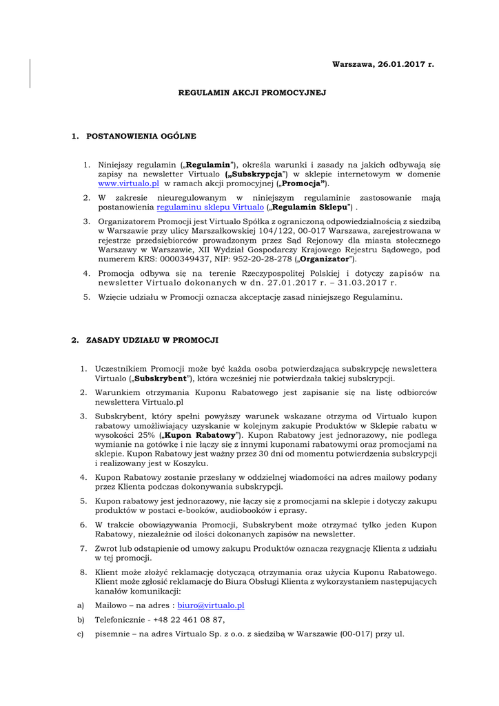 Warszawa, 26.01.2017 r. REGULAMIN AKCJI PROMOCYJNEJ 1. POSTANOWIENIA OGÓLNE 1. Niniejszy regulamin („Regulamin”), określa warunki i zasady na jakich odbywają się zapisy na newsletter Virtualo („Subskrypcja”) w sklepie internetowym w domenie www.virtualo.pl w ramach akcji promocyjnej („Promocja”). 2. W zakresie nieuregulowanym w niniejszym regulaminie zastosowanie postanowienia regulaminu sklepu Virtualo („Regulamin Sklepu”) . mają 3. Organizatorem Promocji jest Virtualo Spółka z ograniczoną odpowiedzialnością z siedzibą w Warszawie przy ulicy Marszałkowskiej 104/122, 00-017 Warszawa, zarejestrowana w rejestrze przedsiębiorców prowadzonym przez Sąd Rejonowy dla miasta stołecznego Warszawy w Warszawie, XII Wydział Gospodarczy Krajowego Rejestru Sądowego, pod numerem KRS: 0000349437, NIP: 952-20-28-278 („Organizator”). 4. Promocja odbywa się na terenie Rzeczypospolitej Polskiej i dotyczy zapisów na newsletter Virtualo dokonanych w dn. 27.01.2017 r. – 31.03.2017 r. 5. Wzięcie udziału w Promocji oznacza akceptację zasad niniejszego Regulaminu. 2. ZASADY UDZIAŁU W PROMOCJI 1. Uczestnikiem Promocji może być każda osoba potwierdzająca subskrypcję newslettera Virtualo („Subskrybent”), która wcześniej nie potwierdzała takiej subskrypcji. 2. Warunkiem otrzymania Kuponu Rabatowego jest zapisanie się na listę odbiorców newslettera Virtualo.pl 3. Subskrybent, który spełni powyższy warunek wskazane otrzyma od Virtualo kupon rabatowy umożliwiający uzyskanie w kolejnym zakupie Produktów w Sklepie rabatu w wysokości 25% („Kupon Rabatowy”). Kupon Rabatowy jest jednorazowy, nie podlega wymianie na gotówkę i nie łączy się z innymi kuponami rabatowymi oraz promocjami na sklepie. Kupon Rabatowy jest ważny przez 30 dni od momentu potwierdzenia subskrypcji i realizowany jest w Koszyku. 4. Kupon Rabatowy zostanie przesłany w oddzielnej wiadomości na adres mailowy podany przez Klienta podczas dokonywania subskrypcji. 5. Kupon rabatowy jest jednorazowy, nie łączy się z promocjami na sklepie i dotyczy zakupu produktów w postaci e-booków, audiobooków i eprasy. 6. W trakcie obowiązywania Promocji, Subskrybent może otrzymać tylko jeden Kupon Rabatowy, niezależnie od ilości dokonanych zapisów na newsletter. 7. Zwrot lub odstąpienie od umowy zakupu Produktów oznacza rezygnację Klienta z udziału w tej promocji. 8. Klient może złożyć reklamację dotyczącą otrzymania oraz użycia Kuponu Rabatowego. Klient może zgłosić reklamację do Biura Obsługi Klienta z wykorzystaniem następujących kanałów komunikacji: a) Mailowo – na adres : [email protected] b) Telefonicznie - +48 22 461 08 87, c) pisemnie – na adres Virtualo Sp. z o.o. z siedzibą w Warszawie (00-017) przy ul. Marszałkowskiej 104/122 9. Reklamacja powinna zawierać co najmniej imię, nazwisko oraz adres e-mail, jakim Subskrybent posłużył się do potwierdzenia subskrypcji newslettera Virtualo, określenie oraz opis zgłaszanych zastrzeżeń wraz z żądaniem Klienta związanym ze składaną reklamacją. Reklamacja składana pisemnie powinna zawierać ponadto adres korespondencyjny Klienta. W przypadku braku ww. danych Virtualo może zwrócić się do Klienta o uzupełnienie ww. danych. Virtualo ustosunkuje się do reklamacji w terminie 14 (czternaście) dni kalendarzowych. 3. POSTANOWIENIA KOŃCOWE 1. Regulamin Akcji www.virtualo.pl. Promocyjnej jest dostępny w na stronie internetowej