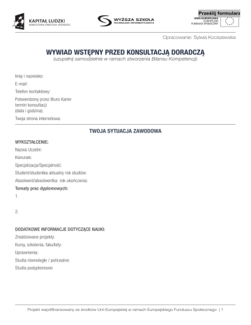 Prześlij formularz Opracowanie: Sylwia Kociszewska WYWIAD WSTĘPNY PRZED KONSULTACJĄ DORADCZĄ (uzupełnij samodzielnie w ramach stworzenia Bilansu Kompetencji) Imię i nazwisko: E-mail: Telefon kontaktowy: Potwierdzony przez Biuro Karier termin konsultacji (data i godzina): Twoja strona internetowa: TWOJA SYTUACJA ZAWODOWA WYKSZTAŁCENIE: Nazwa Uczelni: Kierunek: Specjalizacja/Specjalność: Student/studentka aktualny rok studiów: Absolwent/absolwentka rok ukończenia: Tematy prac dyplomowych: 1. 2. DODATKOWE INFORMACJE DOTYCZĄCE NAUKI: Zrealizowane projekty: Kursy, szkolenia, fakultety: Uprawnienia: Studia równoległe / policealne: Studia podyplomowe: Projekt współfinansowany ze środków Unii Europejskiej w ramach Europejskiego Funduszu Społecznego | 1 OSIĄGNIĘCIA UCZELNIANE Stypendia: Wyjazdy zagraniczne: Projekty badawcze: Publikacje naukowe: Działalność w kołach naukowych: Działalność w organizacjach studenckich: Konkursy: Inne: DOŚWIADCZENIE ZAWODOWE (nazwa stanowiska i pracodawcy, czas zatrudnienia, główne zadania) PRACA STAŁA: PRACE DORYWCZE: (w zawodzie, poza zawodem – istotne doświadczenia, poza zawodem – „czysto” zarobkowe) PRAKTYKI STUDENCKIE: WOLONTARIAT: DODATKOWA DZIAŁALNOŚĆ (np. działalność w stowarzyszeniach branżowych): ZAINTERESOWANIA ZAWODOWE: ZAINTERESOWANIA POZAZAWODOWE: Projekt współfinansowany ze środków Unii Europejskiej w ramach Europejskiego Funduszu Społecznego | 2 INDYWIDUALNY PLAN DZIAŁANIA I DALSZEGO ROZWOJU (wypełniane wraz z doradcą lub po spotkaniu) CEL ZAWODOWY: 1. Na ten moment: 2. W perspektywie 2-4 lat: PREFEROWANE OBSZARY PRACY (*załącznik: Przegląd wymagań na stanowiskach IT – ogłoszenia, IX.2013) IT - Administracja IT - ROZWÓJ OPROGRAMOWANIA • Administrowanie bazami danych i storage • Analiza biznesowa • Administrowanie sieciami • Architektura • Administrowanie systemami • Programowanie • Bezpieczeństwo / Audyt • Testowanie • Wdrożenia ERP • Zarządzanie projektem • Wsparcie techniczne / Helpdesk • Inne, jakie: • Zarządzanie usługami • Inne, jakie: Projekt współfinansowany ze środków Unii Europejskiej w ramach Europejskiego Funduszu Społecznego | 3 PREFEROWANA ROLA W PROJEKCIE INFORMATYCZNYM: • Menedżer projektu • Tester • Specjalista ds. Jakości Projektów • Analityk Biznesowy • Konsultant ds. Wdrożeń • Dokumentalista • Analityk Systemowy • Inżynier • Szkoleniowiec • Architekt Systemów • Administrator • Tłumacz • Programista • Administrator Projektu • Projektant • Specjalista ds. Help-desku ROZWAŻANE BRANŻE I OBSZARY BIZNESOWE • Administracja biurowa • Logistyka/Spedycja/Dystrybucja • Administracja Państwowa • Marketing/Reklama/Public Relations • Agencje doradztwa personalnego • Media/Sztuka/Rozrywka • Analiza • Nieokreślone • Architektura • Nieruchomości/Budownictwo • Badania i rozwój • Obsługa klienta/Call Center • Budownictwo/Geodezja • Organizacje pozarządowe/Wolontariat • Doradztwo/Konsulting • Pomoc w Domu i Opieka • Dział techniczny • Praca fizyczna • Edukacja • Pracownik ochrony • Farmaceutyka/Biotechnologia • Praktyki • Finanse/Ekonomia • Prawo • Geologia/Hydrologia/Tektonika • Produkcja • Grafika/Kreacja artystyczna/Fotografia • Projektowanie/Wdrażanie • Hotelarstwo/Turystyka/Katering • Rolnictwo/Ochrona środowiska • Human Resources • Służba zdrowia • Informatyka/Administracja • Sport/Rekreacja • Informatyka/Programowanie • Sprzedaż • Informatyka/Telekomunikacja • Staże • Instalacja/Utrzymanie/Serwis • Szkolenia/Edukacja • Internet/E-Commerce • Telekomunikacja • Inżynieria/Konstrukcje/Technologia • Tłumaczenia • Kadra zarządzająca • Ubezpieczenia • Kontrola jakości • Usługi Auto-Moto • Księgowość/Audyt/Podatki • Zakupy • Lekarz/Farmaceuta/Weterynarz Projekt współfinansowany ze środków Unii Europejskiej w ramach Europejskiego Funduszu Społecznego | 4 TWOJE PREFERENCJE ZAWODOWE 1.Nazwy stanowisk: 2. Nazwy firm: 3. Branże: 4. Forma zatrudnienia (umowa o pracę, umowa cywilno – prawna/kontrakt, własna działalność): 5. Wymiar czasowy zatrudnienia (pełny etat, ¾ etatu, ½ etatu, inny): 6. Lokalizacja (miejsce zamieszkania, możliwość relokacji w Polsce, możliwość relokacji za granicę): 7. Kluczowe kwalifikacje, które wymagają te stanowiska: TWOJE OCZEKIWANIA FORMALNE 1.Finansowe - minimalne: 2. Finansowe - optymalne: 3. Pozafinansowe: 4. merytoryczne - zadania, projekty, umiejętności, narzędzia, ludzie, środowisko, potencjalne osiągnięcia, etc. (opisz krótko swoje wyobrażenia o tym, jakie powinna być „Twoje idealne miejsce pracy”, czego chcesz się nauczyć, etc.) Projekt współfinansowany ze środków Unii Europejskiej w ramach Europejskiego Funduszu Społecznego | 5 SPOSÓB POSZUKIWANIA PRACY • kontakt z własnej inicjatywy z pracodawcą (aplikacja spontaniczna) • kontakt z agencją doradztwa personalnego (IT TELECOM) • kontakt z firmą outsourcingową IT (np. IT CONNECT) • własna działalność gospodarcza • wyszukanie osób decyzyjnych wewnątrz firmy ( np. branżowe serwisy społecznościowe) • monitorowanie ogłoszeń dostępnych na rynku pracy • monitorowanie ogłoszeń dostępnych poprzez Biuro Karier • rejestracja w serwisach rekrutacyjnych • targi pracy • inne: TWOJE NAJWIĘKSZE ATUTY NA RYNKU PRACY (*załącznik: Arkusz samooceny kompetencji branż BPO i ITO) (*załącznik: Kompetencje zawodowe) 1. 2. 3. 4. 5. 6. Projekt współfinansowany ze środków Unii Europejskiej w ramach Europejskiego Funduszu Społecznego | 6 DZIAŁANIA KTÓRE PODEJMĘ, OBSZARY DO ROZWOJU (co zrobię, do kiedy, po co – co ma mi to umożliwić?) 1. 2. 3. 4. 5. 6. Podpis studenta Podpis doradcy Projekt współfinansowany ze środków Unii Europejskiej w ramach Europejskiego Funduszu Społecznego | 7