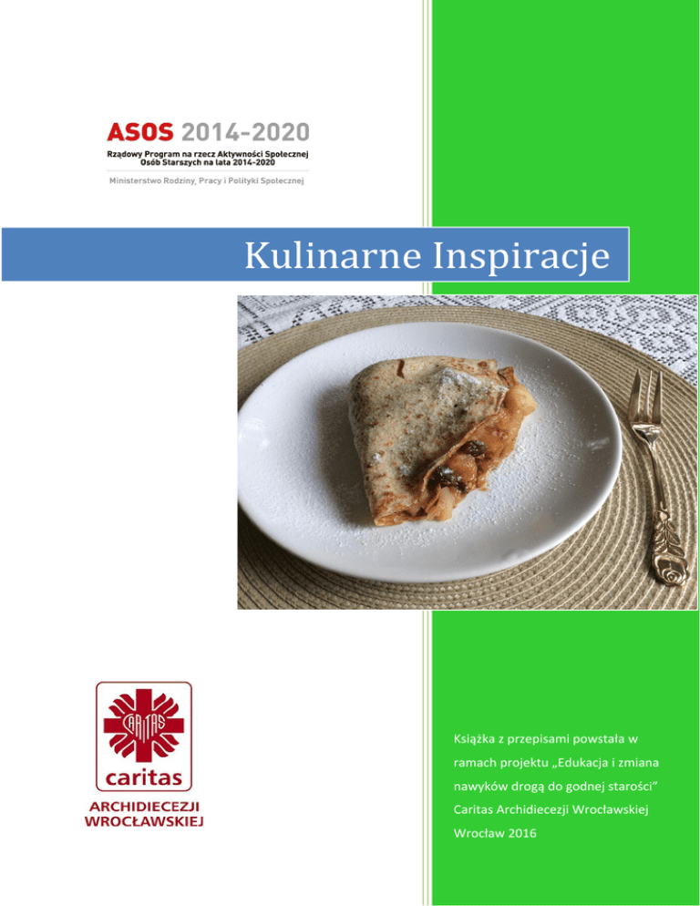 Kulinarne Inspiracje Książka z przepisami powstała w ramach projektu „Edukacja i zmiana nawyków drogą do godnej starości” Caritas Archidiecezji Wrocławskiej Wrocław 2016 Przepisy zebrał i opracował: Kazimierz Szepiela Zdjęcia: Kazimierz Szepiela Nadzór ekspercki w zakresie dietetycznym: Monika Świerbutowicz Koordynator projektu: Magdalena Olaczek Publikacja powstała w ramach projektu „Edukacja i zmiana nawyków drogą do godnej starości” współfinansowanego przez program Ministerstwa Rodziny, Pracy i Polityki Społecznej pod nazwą ASOS- Rządowy Program Aktywności Społecznej Osób Starszych na lata 2014-2020. Projekt współfinansowany i realizowany przez Caritas Archidiecezji Wrocławskiej. Egzemplarz bezpłatny, nie do sprzedaży. 2 Spis treści Wstęp s. 4 Śniadania s. 5 Przystawki s.12 Dania obiadowe s. 18 Desery i inne słodkości s. 28 3 Szanowni Państwo, publikacja, która trzymacie w ręku powstała na potrzeby projektu edukacyjnego skierowanego do osób starszych. Jego głównym celem jest dostarczenie wiedzy i umiejętności oraz zmiana nawyków w obszarach aktywności umysłowej, fizycznej oraz w zakresie żywienia. Trzy wymienione sfery są kluczowe dla profilaktyki chorób neurodegeneracyjnych takich jak choroba Alzhaimera, co roku dotykających coraz większą liczbę osób. Jesteśmy przekonani, że właściwe przygotowanie potraw, opartych głównie na warzywach, drobiu, rybach, orzechach oraz roślinach strączkowych pozytywnie wpłynie na stan zdrowia, samopoczucia, a także pomoże opóźnić lub zapobiec wystąpieniu niekorzystnych zmian o podłożu neurologicznym. Dlatego też zachęcamy do korzystania z bazy przepisów kulinarnych, które zostały starannie dobrane pod kątem właściwości odżywczych ale również dostępności składników niezależnie od pory roku, a także powszechności ich występowania. Życzymy smacznego! Zespół projektu 4 Śniadania Chleb na ziarnach 140 g ziaren słonecznika 90 g ziaren siemienia lnianego 60 g orzechów ziemnych 145 płatków owsianych 4 łyżki nasion babki płesznik 3 łyżki sezamu 1 łyżeczka soli 1 łyżka miodu 1 jajko 3 łyżki roztopionego oleju kokosowego 330 ml wody Wymieszać w jednej misce suche składniki, w drugiej wymieszać mokre, połączyć je ze sobą, przykryć miskę i odstawić na minimum 2 godziny. Masę przełożyć do krótkiej foremki wysmarowanej olejem i posypanej bułką tartą. Piec przez 20 minut w temperaturze 180 stopni, następnie delikatnie wyjąć i piec kolejne 30- 40 minut. Pozostawić do wystygnięcia. Pasta jajeczna 2 jajka 2 łyżki jogurtu naturalnego Pół cebuli Garść kiełków brokułu 3 łyżki słonecznika Sól, pieprz, Słonecznik uprażyć na suchej patelni, jajka ugotować na twardo, obrać i wystudzić. Cebulę pokroić w drobną kostkę. Posiekać jajko, dodać jogurt, ugnieść widelcem, dodać słonecznik, cebulkę, kiełki, doprawić solą i pieprzem, wymieszać. 5 Grzanki z rukolą, pomidorami i jajkami w koszulce 2 kromki chleba pełnoziarnistego musztarda 2 jajka Łyżeczka octu 2 plastry pomidorów, 2 garście rukoli Sól, świeżo zmielony pieprz Kromki włożyć do tostera lub na kilka minut do piekarnika nagrzanego do 180 stopni. W międzyczasie zagotować w niedużym garnku wodę, posolić i dodać ocet. Po zagotowaniu zmniejszyć ogień i delikatnie wbić do garnka jajko, delikatnie zamieszać. Gotować na miękko do 3 minut lub dłużej na twardo. Wyjąć jajka łyżką cedzakową i pozbyć się nadmiaru wody na papierowym ręczniku. Wyciągnąć grzanki z tostera, każdy posmarować musztardą i nakładać kolejno warstwami rukolę, pomidor, jako, doprawić z wierzchu solą i pieprzem. Jaglanka ze śliwkami i orzechami włoskimi 500 ml mleka 0,5 szklanki kaszy jaglanej 4 suszone śliwki 2 łyżki miodu 2 garście włoskich orzechów Szczypta cynamonu Wypłukać kaszę jaglaną i przelać ją wrzątkiem. Zagotować mleko, dodać kaszę i gotować mieszając 10- 15 minut, dodać miód, wyłączyć gaz i zostawić pod przykryciem na 10 minut. Posiekać śliwki i orzechy, kaszę nałożyć do miseczek dołożyć śliwki i orzechy, posypać cynamonem. 6 Chleb na ziarnach s. 5 Grzanki z rukolą pomidorami i jajkami w koszulce s.6 7 Pasta z makreli 150 g chudego twarogu 3 łyżki jogurtu 0% Skórka starta z połówki cytryny 3 łyżeczki chrzanu 4 łyżki posiekanego szczypiorku Połówka wędzonej makreli Sól, pieprz Ugnieść widelcem twaróg ze śmietaną, dodać chrzan, startą skórkę z cytryny, szczypiorek, sól i świeżo zmielony pieprz, wszystko wymieszać. Na wierzchu ułożyć kawałki wędzonej makreli Granola ( źródło: Nigela Lawson) 220 g płatków owsianych 60 g ziaren słonecznika 60 g ziaren sezamu Pół startego jabłka 1 łyżeczka cynamonu Pół łyżeczki proszku z imbiru 100 g płynnego miodu 130 g migdałów lub orzechów włoskich lub orzechów ziemnych 1/3 łyżeczki soli 1 łyżka oliwy 150 g rodzynek Wymieszać wszystkie składniki oprócz rodzynek. Rozłożyć na blasze, piec w temperaturze 170 stopni 30 minut, po upieczeniu dodać rodzynki i wymieszać. 8 Pasta z czerwonej soczewicy 1 marchewka Szklanka czerwonej soczewicy 1 duża cebula Pęczek natki pietruszki 1 łyżka oliwy 2 ząbki czosnku 1 łyżeczka soku z cytryny Sól pieprz Posiekać cebulę w kostkę, ugotować soczewicę do miękkości, ugotować marchew na pół twardo, po ugotowaniu zetrzeć na tarce o grubych oczkach, posiekać natkę pietruszki, wycisnąć ząbki czosnku. Na patelni usmażyć cebulę na złoto. Wszystkie składniki wymieszać, doprawić solą i pieprzem. 9 Serek Tzatziki 150 g chudego twarogu 4 łyżki jogurtu 0 % 50 g ogórka Ząbek czosnku 2 łyżki oliwy Sól i pieprz Zetrzeć ogórek na tarce z grubymi oczkami, odcisnąć z ogórków nadmiar płynu. Wycisnąć ząbek czosnku, zmiksować wszystkie składniki poza ogórkiem, domieszać do masy starty ogórek, doprawić solą i pieprzem Jaglanka Ala Bounty ( źró