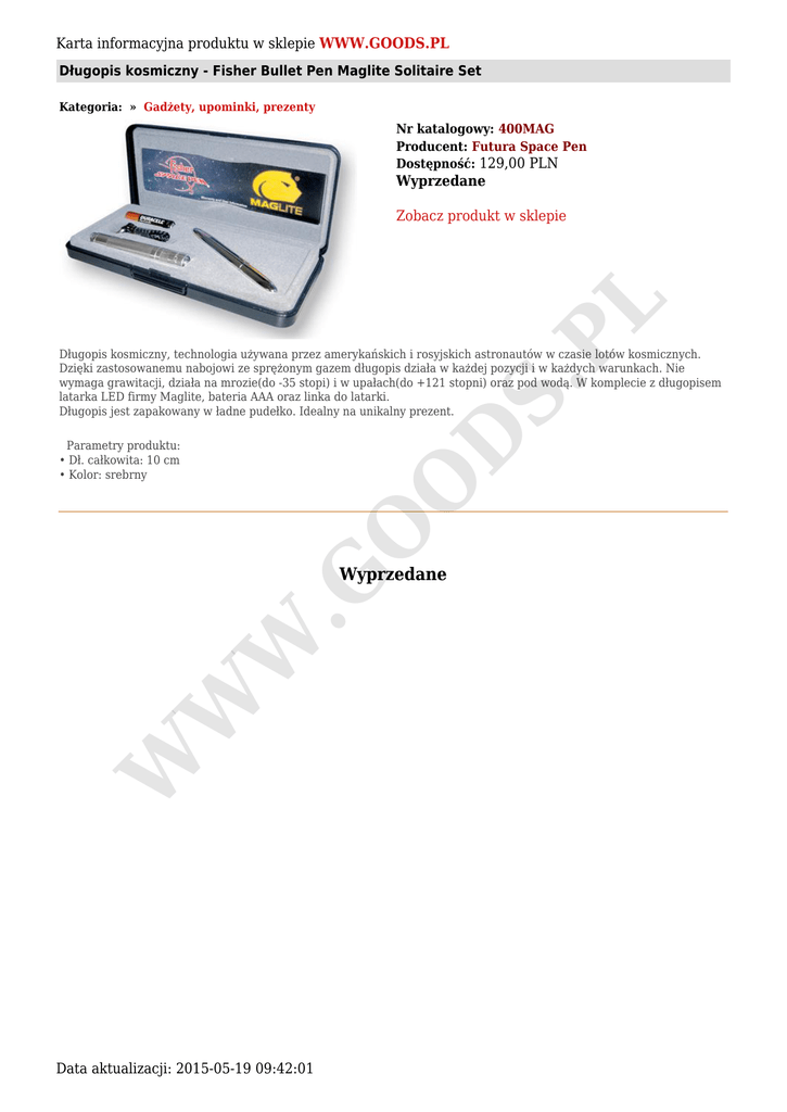 Karta informacyjna produktu w sklepie WWW.GOODS.PL Długopis kosmiczny - Fisher Bullet Pen Maglite Solitaire Set Kategoria: » Gadżety, upominki, prezenty Nr katalogowy: 400MAG Producent: Futura Space Pen Dostępność: 129,00 PLN Wyprzedane S. PL Zobacz produkt w sklepie O D Długopis kosmiczny, technologia używana przez amerykańskich i rosyjskich astronautów w czasie lotów kosmicznych. Dzięki zastosowanemu nabojowi ze sprężonym gazem długopis działa w każdej pozycji i w każdych warunkach. Nie wymaga grawitacji, działa na mrozie(do -35 stopi) i w upałach(do +121 stopni) oraz pod wodą. W komplecie z długopisem latarka LED firmy Maglite, bateria AAA oraz linka do latarki. Długopis jest zapakowany w ładne pudełko. Idealny na unikalny prezent. O Parametry produktu: • Dł. całkowita: 10 cm • Kolor: srebrny W W W .G Wyprzedane Data aktualizacji: 2015-05-19 09:42:01