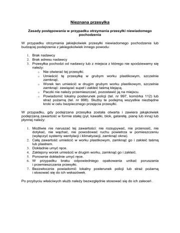 Nieznana przesyłka Zasady postępowania w przypadku otrzymania przesyłki niewiadomego pochodzenia W przypadku otrzymania jakiejkolwiek przesyłki niewiadomego pochodzenia lub budzącej podejrzenia z jakiegokolwiek innego powodu: 1. Brak nadawcy 2. Brak adresu nadawcy 3. Przesyłka pochodzi od nadawcy lub z miejsca z którego nie spodziewamy się należy: o Nie otwierać tej przesyłki. o Umieścić tę przesyłkę w grubym worku plastikowym, szczelnie zamknąć. o Worek ten umieścić w drugim grubym worku plastikowym, szczelnie zamknąć: zawiązać supeł i zakleić taśmą klejącą. o Paczki nie należy przemieszczać, pozostawić ją na miejscu. o Powiadomić lokalny posterunek policji (tel. nr 997, komórka 112) lub straż pożarną (tel. nr 998). Służby te podejmą wszystkie niezbędne kroki w celu bezpiecznego przejęcia przesyłki. W przypadku, gdy podejrzana przesyłka została otwarta i zawiera jakąkolwiek podejrzaną zawartość w formie stałej (pył, kawałki, blok, galaretę, pianę lub inną) lub płynnej należy: 1. Możliwie nie naruszać tej zawartości: nie rozsypywać, nie przenosić, nie dotykać, nie wąchać, nie powodować ruchu powietrza w pomieszczeniu (wyłączyć systemy wentylacji i klimatyzacji, zamknąć okna). 2. Całą zawartość umieścić w worku plastikowym, zamknąć go i zakleić taśmą lub plastrem. 3. Dokładnie umyć ręce. 4. Zaklejony worek umieścić w drugim worku, zamknąć go i zakleić. 5. Ponownie dokładnie umyć ręce. 6. W przypadku braku odpowiedniego opakowania unikać poruszania i przemieszczania przesyłki. 7. Bezzwłocznie powiadomić lokalny posterunek policji lub straż pożarną i stosować się do ich wskazówek. Po przybyciu właściwych służb należy bezwzględnie stosować się do ich zaleceń .