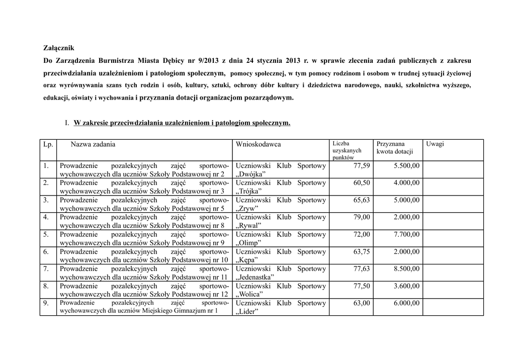 Załącznik Do Zarządzenia Burmistrza Miasta Dębicy nr 9/2013 z dnia 24 stycznia 2013 r. w sprawie zlecenia zadań publicznych z zakresu przeciwdziałania uzależnieniom i patologiom społecznym, pomocy społecznej, w tym pomocy rodzinom i osobom w trudnej sytuacji życiowej oraz wyrównywania szans tych rodzin i osób, kultury, sztuki, ochrony dóbr kultury i dziedzictwa narodowego, nauki, szkolnictwa wyższego, edukacji, oświaty i wychowania i przyznania dotacji organizacjom pozarządowym. I. W zakresie przeciwdziałania uzależnieniom i patologiom społecznym. Lp. 1. 2. 3. 4. 5. 6. 7. 8. 9. Nazwa zadania Prowadzenie pozalekcyjnych zajęć sportowowychowawczych dla uczniów Szkoły Podstawowej nr 2 Prowadzenie pozalekcyjnych zajęć sportowowychowawczych dla uczniów Szkoły Podstawowej nr 3 Prowadzenie pozalekcyjnych zajęć sportowowychowawczych dla uczniów Szkoły Podstawowej nr 5 Prowadzenie pozalekcyjnych zajęć sportowowychowawczych dla uczniów Szkoły Podstawowej nr 8 Prowadzenie pozalekcyjnych zajęć sportowowychowawczych dla uczniów Szkoły Podstawowej nr 9 Prowadzenie pozalekcyjnych zajęć sportowowychowawczych dla uczniów Szkoły Podstawowej nr 10 Prowadzenie pozalekcyjnych zajęć sportowowychowawczych dla uczniów Szkoły Podstawowej nr 11 Prowadzenie pozalekcyjnych zajęć sportowowychowawczych dla uczniów Szkoły Podstawowej nr 12 Wnioskodawca Uczniowski „Dwójka” Uczniowski „Trójka” Uczniowski „Zryw” Uczniowski „Rywal” Uczniowski „Olimp” Uczniowski „Kępa” Uczniowski „Jedenastka” Uczniowski „Wolica” Prowadzenie pozalekcyjnych zajęć sportowo- Uczniowski wychowawczych dla uczniów Miejskiego Gimnazjum nr 1 „Lider” Liczba uzyskanych punktów Przyznana kwota dotacji Klub Sportowy 77,59 5.500,00 Klub Sportowy 60,50 4.000,00 Klub Sportowy 65,63 5.000,00 Klub Sportowy 79,00 2.000,00 Klub Sportowy 72,00 7.700,00 Klub Sportowy 63,75 2.000,00 Klub Sportowy 77,63 8.500,00 Klub Sportowy 77,50 3.600,00 Klub Sportowy 63,00 6.000,00 Uwagi Lp. Nazwa zadania Liczba uzyskanych punktów Wnioskodawca Przyznana kwota dotacji 10. Prowadzenie pozalekcyjnych zajęć sportowo- Uczniowski Klub Sportowy wychowawczych dla uczniów Miejskiego Gimnazjum nr 2 „Szóstka” 59,63 5.700,00 11. Prowadzenie pozalekcyjnych zajęć sportowo- Uczniowski Klub Sportowy wychowawczych dla uczniów Miejskiego Gimnazjum nr 3 „Sokół” 59,50 4.000,00 12. Prowadzenie pozalekcyjnych zajęć sportowo- Uczniowski Klub Sportowy wychowawczych dla uczniów Miejskiego Gimnazjum nr 4 „Tim” 74,50 6.000,00 13. Prowadzenie pozalekcyjnych zajęć i organizacja imprez sportowych dla dzieci i młodzieży w zakresie jazdy rowerem - BRD -CYKLOTRIAL Prowadzenie pozalekcyjnych zajęć i organizacja imprez sportowych dla dzieci i młodzieży z zakresu tenisa stołowego Prowadzenie pozalekcyjnych zajęć i organizacja imprez sportowych dla dzieci i młodzieży w zakresie judo Sportowy Szkole 67,63 6.100,00 Sportowy Szkole 76,25 10.000,00 Sportowy Szkole 71,50 4.500,00 Sportowy Szkole 70,38 4.500,00 Sportowy Szkole 80,13 7.000,00 Sportowy Miejskim 69,01 6.000,00 14. 15. 16. Prowadzenie pozalekcyjnych zajęć i organizacja imprez sportowych dla dzieci i młodzieży w akrobatyce 17. Prowadzenie pozalekcyjnych zajęć i organizacja imprez sportowych dla dzieci i młodzieży w piłce siatkowej dziewcząt i chłopców – Dębicka Akademia Siatkówki Prowadzenie pozalekcyjnych zajęć sportowych w piłce nożnej dziewcząt i udział w Podkarpackiej Lidze Juniorek Starszych 18. Uczniowski Klub „Kępa” przy Podstawowej nr 10 Uczniowski Klub „Kępa” przy Podstawowej nr 10 Uczniowski Klub „Kępa” przy Podstawowej nr 10 Uczniowski Klub „Kępa” przy Podstawowej nr 10 Uczniowski Klub „Kępa” przy Podstawowej nr 10 Uczniowski Klub „Szóstka” przy Gimnazjum nr 2 Uwagi Lp. Nazwa zadania Wnioskodawca Liczba uzyskanych punktów Przyznana kwota dotacji 19. Prowadzenie pozalekcyjnych zajęć sportowych dla dzieci Uczniowski Klub Sportowy i młodzieży w piłce nożnej połączonych z wyjazdem na „Szóstka” przy Miejskim turniej piłkarski Gimnazjum nr 2 20. Prowadzenie pozalekcyjnych zajęć sportowych dla dzieci Dziecięca Akademia Piłkarska i młodzieży w piłce nożnej w wieku 5-10 lat 63,38 12.000,00 21 Zorganizowanie pozalekcyjnych zajęć sportowych dla dzieci w ramach rodzinnego turnieju piłki nożnej pn. „Tato podaj – mamo strzelaj” Dziewczyny rocznik 2000 i młodsze na boiska piłkarskie – prowadzenie zajęć z piłki nożnej Uczniowski Klub Sportowy „Olimp” przy Szkole Podstawowej nr 9 Uczniowski Klub Sportowy „Olimp” przy Szkole Podstawowej nr 9 Uczniowski Klub Sportowy „Olimp” przy Szkole Podstawowej nr 9 Uczniowski Klub Sportowy „Olimp” przy Szkole Podstawowej nr 9 Prowadzenie pozalekcyjnych zajęć sportowych dla dzieci i młodzieży w szachach wraz z udziałem uczestników w turniejach szachowych Uczniowski Klub Sportowy „Junak”. 67,75 3.000,00 60,00 3.000,00 72,88 3.000,00 64,50 4.000,00 68,51 3.300,00 72,15 2.100,00 69,50 28.000,00 22. 23. 24. Prowadzenie zajęć sportowych w piłce nożnej dla młodzików starszych i ich udział w rozgrywkach Ligii Podkarpackiej Zorganizowanie pozalekcyjnych zajęć sportowych dla dzieci w ramach olimpiady sportowej przedszkolaków 25. Miejski Klub Szachowy Gryf Dębica 26. Prowadzenie pozalekcyjnych zajęć sportowych w tenisie stołowym. 27. Prowadzenie pozalekcyjnych zajęć sportowych dla dzieci Uczniowski Klub Hokejowy i młodzieży w hokeju na lodzie. Dębica. Uwagi Oferta nie spełnia wymogów formalnych , w związku z czym została odrzucona Lp. Nazwa zadania Wnioskodawca Liczba uzyskanych punktów Przyznana kwota dotacji 28. Prowadzenie pozalekcyjnych zajęć sportowych dla dzieci Międzyszkolny Klub i młodzieży w pływaniu. Pływacki „Bobry”. 78,51 27.500,00 29. Prowadzenie pozalekcyjnych zajęć sportowych dla dzieci Uczniowski Klub Sportowy i młodzieży w boksie. „MO