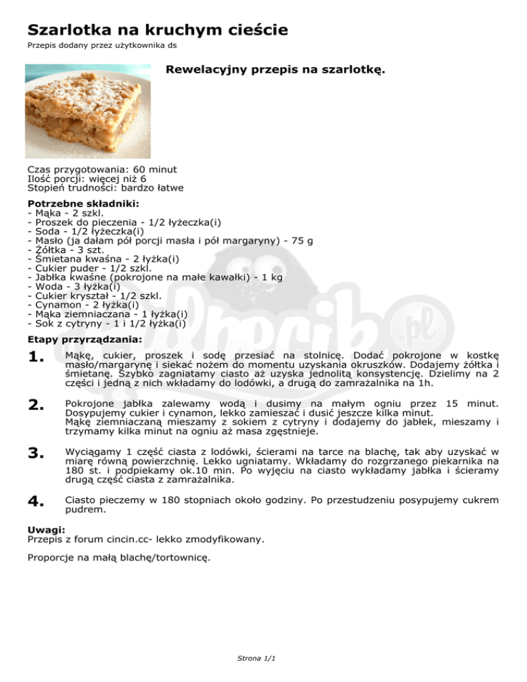 Szarlotka na kruchym cieście Przepis dodany przez użytkownika ds Rewelacyjny przepis na szarlotkę. Czas przygotowania: 60 minut Ilość porcji: więcej niż 6 Stopień trudności: bardzo łatwe Potrzebne składniki: - Mąka - 2 szkl. - Proszek do pieczenia - 1/2 łyżeczka(i) - Soda - 1/2 łyżeczka(i) - Masło (ja dałam pół porcji masła i pół margaryny) - 75 g - Żółtka - 3 szt. - Śmietana kwaśna - 2 łyżka(i) - Cukier puder - 1/2 szkl. - Jabłka kwaśne (pokrojone na małe kawałki) - 1 kg - Woda - 3 łyżka(i) - Cukier kryształ - 1/2 szkl. - Cynamon - 2 łyżka(i) - Mąka ziemniaczana - 1 łyżka(i) - Sok z cytryny - 1 i 1/2 łyżka(i) Etapy przyrządzania: 1. Mąkę, cukier, proszek i sodę przesiać na stolnicę. Dodać pokrojone w kostkę masło/margarynę i siekać nożem do momentu uzyskania okruszków. Dodajemy żółtka i śmietanę. Szybko zagniatamy ciasto aż uzyska jednolitą konsystencję. Dzielimy na 2 części i jedną z nich wkładamy do lodówki, a drugą do zamrażalnika na 1h. 2. Pokrojone jabłka zalewamy wodą i dusimy na małym ogniu przez 15 minut. Dosypujemy cukier i cynamon, lekko zamieszać i dusić jeszcze kilka minut. Mąkę ziemniaczaną mieszamy z sokiem z cytryny i dodajemy do jabłek, mieszamy i trzymamy kilka minut na ogniu aż masa zgęstnieje. 3. Wyciągamy 1 część ciasta z lodówki, ścierami na tarce na blachę, tak aby uzyskać w miarę równą powierzchnię. Lekko ugniatamy. Wkładamy do rozgrzanego piekarnika na 180 st. i podpiekamy ok.10 min. Po wyjęciu na ciasto wykładamy jabłka i ścieramy drugą część ciasta z zamrażalnika. 4. Ciasto pieczemy w 180 stopniach około godziny. Po przestudzeniu posypujemy cukrem pudrem. Uwagi: Przepis z forum cincin.cc- lekko zmodyfikowany. Proporcje na małą blachę/tortownicę. Strona 1/1