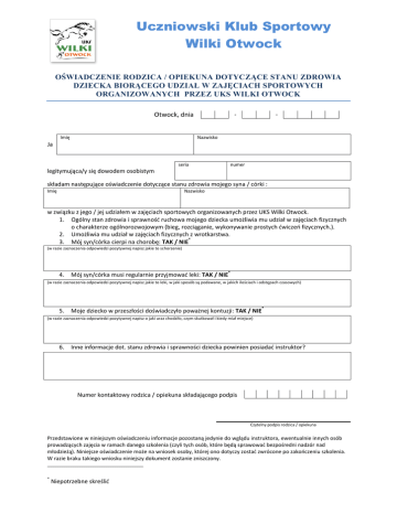 Uczniowski Klub Sportowy Wilki Otwock OŚWIADCZENIE RODZICA / OPIEKUNA DOTYCZĄCE STANU ZDROWIA DZIECKA BIORĄCEGO UDZIAŁ W ZAJĘCIACH SPORTOWYCH ORGANIZOWANYCH PRZEZ UKS WILKI OTWOCK Otwock, dnia Imię - - Nazwisko Ja seria numer legitymująca/y się dowodem osobistym składam następujące oświadczenie dotyczące stanu zdrowia mojego syna / córki : Imię Nazwisko w związku z jego / jej udziałem w zajęciach sportowych organizowanych przez UKS Wilki Otwock. 1. Ogólny stan zdrowia i sprawność ruchowa mojego dziecka umożliwia mu udział w zajęciach fizycznych o charakterze ogólnorozwojowym (bieg, rozciąganie, wykonywanie prostych ćwiczeń fizycznych.). 2. Umożliwia mu udział w zajęciach fizycznych z wrotkarstwa. * 3. Mój syn/córka cierpi na chorobę: TAK / NIE (w razie zaznaczenia odpowiedzi pozytywnej napisz jakie to schorzenie) 4. * Mój syn/córka musi regularnie przyjmować leki: TAK / NIE (w razie zaznaczenia odpowiedzi pozytywnej napisz jakie to leki, w jaki sposób są podawane, w jakich ilościach i odstępach czasowych) 5. * Moje dziecko w przeszłości doświadczyło poważnej kontuzji: TAK / NIE (w razie zaznaczenia odpowiedzi pozytywnej napisz o jaki uraz chodziło, czym skutkował i kiedy miał miejsce) 6. Inne informacje dot. stanu zdrowia i sprawności dziecka powinien posiadać instruktor? Numer kontaktowy rodzica / opiekuna składającego podpis Czytelny podpis rodzica / opiekuna Przedstawione w niniejszym oświadczeniu informacje pozostaną jedynie do wglądu instruktora, ewentualnie innych osób prowadzących zajęcia w ramach danego szkolenia (czyli tych osób, które będą sprawować bezpośredni nadzór nad młodzieżą). Niniejsze oświadczenie może na wniosek osoby, której ono dotyczy zostać zwrócone po zakończeniu szkolenia. W razie braku takiego wniosku niniejszy dokument zostanie zniszczony. * Niepotrzebne skreślić
