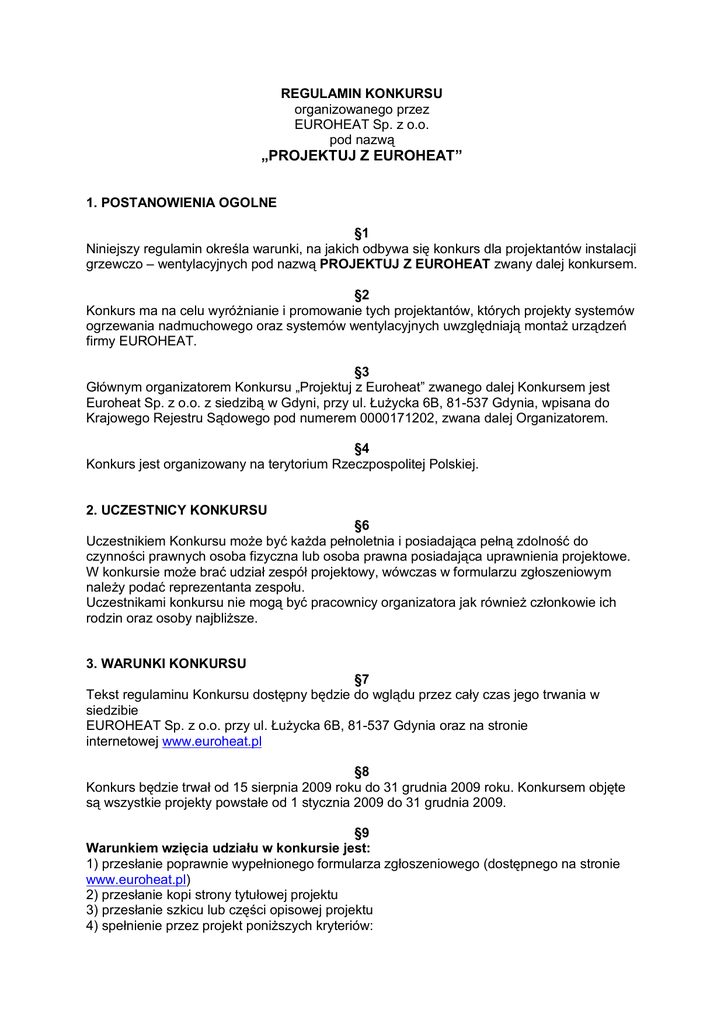 REGULAMIN KONKURSU organizowanego przez EUROHEAT Sp. z o.o. pod nazwą „PROJEKTUJ Z EUROHEAT” 1. POSTANOWIENIA OGOLNE §1 Niniejszy regulamin określa warunki, na jakich odbywa się konkurs dla projektantów instalacji grzewczo – wentylacyjnych pod nazwą PROJEKTUJ Z EUROHEAT zwany dalej konkursem. §2 Konkurs ma na celu wyróżnianie i promowanie tych projektantów, których projekty systemów ogrzewania nadmuchowego oraz systemów wentylacyjnych uwzględniają montaż urządzeń firmy EUROHEAT. §3 Głównym organizatorem Konkursu „Projektuj z Euroheat” zwanego dalej Konkursem jest Euroheat Sp. z o.o. z siedzibą w Gdyni, przy ul. Łużycka 6B, 81-537 Gdynia, wpisana do Krajowego Rejestru Sądowego pod numerem 0000171202, zwana dalej Organizatorem. §4 Konkurs jest organizowany na terytorium Rzeczpospolitej Polskiej. 2. UCZESTNICY KONKURSU §6 Uczestnikiem Konkursu może być każda pełnoletnia i posiadająca pełną zdolność do czynności prawnych osoba fizyczna lub osoba prawna posiadająca uprawnienia projektowe. W konkursie może brać udział zespół projektowy, wówczas w formularzu zgłoszeniowym należy podać reprezentanta zespołu. Uczestnikami konkursu nie mogą być pracownicy organizatora jak również członkowie ich rodzin oraz osoby najbliższe. 3. WARUNKI KONKURSU §7 Tekst regulaminu Konkursu dostępny będzie do wglądu przez cały czas jego trwania w siedzibie EUROHEAT Sp. z o.o. przy ul. Łużycka 6B, 81-537 Gdynia oraz na stronie internetowej www.euroheat.pl §8 Konkurs będzie trwał od 15 sierpnia 2009 roku do 31 grudnia 2009 roku. Konkursem objęte są wszystkie projekty powstałe od 1 stycznia 2009 do 31 grudnia 2009. §9 Warunkiem wzięcia udziału w konkursie jest: 1) przesłanie poprawnie wypełnionego formularza zgłoszeniowego (dostępnego na stronie www.euroheat.pl) 2) przesłanie kopi strony tytułowej projektu 3) przesłanie szkicu lub części opisowej projektu 4) spełnienie przez projekt poniższych kryteriów: - Projekt powinien zostać wykonany na zlecenie inwestora w terminie między 1 stycznia 2009 r. a 31 grudnia 2009 r. - Projekt powinien uwzględniać min. 1 urządzenie grzewczo – wentylacyjne lub kurtynę firmy EUROHEAT. Urządzenia mogą być elementem większego systemu grzewczo – wentylacyjnego. - Jeden projekt może dotyczyć tylko jednej inwestycji. §10 Wszystkie wymienione dokumenty w §9 powinny zostać przesłane pocztą (decyduje data stempla pocztowego), pocztą elektroniczną lub faksem do dnia 8 stycznia 2010 r. na adres: EUROHEAT Sp. z o.o. Dział Marketingu ul. Łużycka 6B 81-537 Gdynia lub fax +48 (58) 774 07 20 lub e-mail: [email protected] z dopiskiem „KONKURS PROJEKTUJ Z EUROHEAT” §11 Harmonogram konkursu: - konkurs trwa od 15 sierpnia 2009 do 31 grudnia 2009 (§8) - zgłoszenia na konkurs należy nadsyłać do 08 stycznia 2010 (§10) - wyłonienie zwycięzców konkursu nastąpi do 31 stycznia 2010 - poinformowanie zwycięzców i przyznanie nagród nastąpi do 10 lutego 2010. - przyznanie nagród nastąpi do 10 lutego 2010. §12 Uczestnik konkursu może przesłać nieograniczoną liczba zgłoszeń pod warunkiem spełnienia przez nie kryteriów wymienionych w §9. §13 Ze względów organizacyjnych zgłoszenia niepełne, lub przesłane po terminie nie będą rozpatrywane. 4. NAGRODY I ZASADY PRZYZNAWANIA NAGRÓD §14 Organizator nagrodzi 10 uczestników w każdym z 8 regionów, którzy uzyskali najlepsze wyniki liczone według zasad ujętych w §16. Wykaz regionów znajduje się w załączniku graficznym nr 1. Dla 10 uczestników, którzy osiągną najlepsze wyniki w konkursie organizator przewiduje 10 nagród podstawowych - zaproszenie do udziału w spotkaniu integracyjnym. Dodatkowo za zajęcie pierwszych trzech miejsc Organizator przewiduje nagrody: aparat telefoniczny IPhone 3G firmy Apple lub Monitor Flex Scan S2202W firmy Eizo. Uczestnik poinformuje Organizatora o wyborze nagrody w formie pisemnej. Zgłoszenie nagrody powinno zostać przesłane pocztą elektroniczną lub faksem w terminie do 5 dni roboczych od momentu, gdy zostanie poinformowany przez Organizatora o zwycięstwie w konkursie na adres: EUROHEAT Sp. z o.o. Dział Marketingu ul. Łużycka 6B 81-537 Gdynia lub fax +48 (58) 774 07 20 lub e-mail: [email protected] z dopiskiem „KONKURS PROJEKTUJ Z EUROHEAT” Nagrody za miejsca 1,2 i 3 zostaną wręczone podczas regionalnego spotkania integracyjnego. §15 Poza nagrodami głównymi Organizator przewiduje: - przyznanie nagrody niespodzianki o wartości min. 1000 pln netto w drodze quizu wiedzy przeprowadzonego wśród uczestników każdego regionalnego spotkania integracyjnego - przyznanie jednej głównej nagrody krajowej (MacBooka firmy Apple) w drodze quizu wiedzy wśród wszystkich uczestników wszystkich spotkań integracyjnych. §16 O przyznaniu nagród decyduje liczba zgłoszeń projektowych oraz liczba uwzględnionych urządzeń firmy Euroheat w zgłoszeniach, przy czym wynik uczestnika liczony jest według poniższej reguły: liczba zgłoszeń x 0,6 + liczba urządzeń x 0,4 W przypadku, gdy dwóch lub więcej uczestników w tym samym regionie uzyskają taki sam wynik w konkursie, o zajęciu wyższego miejsca w konkursie decyduje łączna liczba urządzeń w projektach danego uczestnika. §17 Konkursem objęte są urządzenia firmy Euroheat: a) Volcano VR1 b) Volcano VR2 c) Defender XW d) Defender XE §18 Osoby nagrodzone prowadzące działalność gospodarczą mają obowiązek wykazać wartość nagrody w przychodach z działalności gospodarczej. Jeżeli osobą nagrodzoną jest osoba fizyczna nie prowadząca działalności gospodarczej, Organizator powiększy wartość nagrody o taką kwotę pieniężną, która pokryje kwotę podatku dochodowego od osób fizycznych pobieraną przez organizatora jako płatnika tego podatku. Warunkiem odbioru nagrody przez osobę nagrodzoną będzie złożenie oświadczenia o prowadzeniu działalności gospodarczej lub podanie danych niezbęd