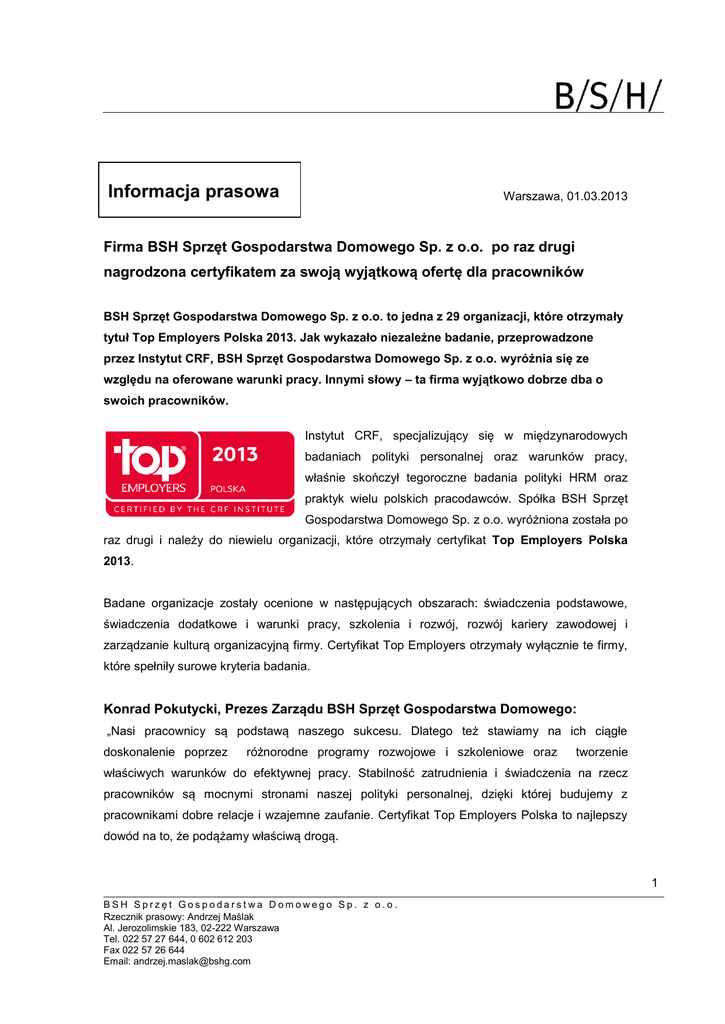 Informacja prasowa Warszawa, 01.03.2013 Firma BSH Sprzęt Gospodarstwa Domowego Sp. z o.o. po raz drugi nagrodzona certyfikatem za swoją wyjątkową ofertę dla pracowników BSH Sprzęt Gospodarstwa Domowego Sp. z o.o. to jedna z 29 organizacji, które otrzymały tytuł Top Employers Polska 2013. Jak wykazało niezależne badanie, przeprowadzone przez Instytut CRF, BSH Sprzęt Gospodarstwa Domowego Sp. z o.o. wyróżnia się ze względu na oferowane warunki pracy. Innymi słowy – ta firma wyjątkowo dobrze dba o swoich pracowników. Instytut CRF, specjalizujący się w międzynarodowych badaniach polityki personalnej oraz warunków pracy, właśnie skończył tegoroczne badania polityki HRM oraz praktyk wielu polskich pracodawców. Spółka BSH Sprzęt Gospodarstwa Domowego Sp. z o.o. wyróżniona została po raz drugi i należy do niewielu organizacji, które otrzymały certyfikat Top Employers Polska 2013. Badane organizacje zostały ocenione w następujących obszarach: świadczenia podstawowe, świadczenia dodatkowe i warunki pracy, szkolenia i rozwój, rozwój kariery zawodowej i zarządzanie kulturą organizacyjną firmy. Certyfikat Top Employers otrzymały wyłącznie te firmy, które spełniły surowe kryteria badania. Konrad Pokutycki, Prezes Zarządu BSH Sprzęt Gospodarstwa Domowego: „Nasi pracownicy są podstawą naszego sukcesu. Dlatego też stawiamy na ich ciągłe doskonalenie poprzez różnorodne programy rozwojowe i szkoleniowe oraz tworzenie właściwych warunków do efektywnej pracy. Stabilność zatrudnienia i świadczenia na rzecz pracowników są mocnymi stronami naszej polityki personalnej, dzięki której budujemy z pracownikami dobre relacje i wzajemne zaufanie. Certyfikat Top Employers Polska to najlepszy dowód na to, że podążamy właściwą drogą. 1 BSH Sprzęt Gospodarstwa Domowego Sp. z o.o. Rzecznik prasowy: Andrzej Maślak Al. Jerozolimskie 183, 02-222 Warszawa Tel. 022 57 27 644, 0 602 612 203 Fax 022 57 26 644 Email: [email protected] Magdalena Kusik, Country Manager CRF Polska: „Wyjątkowa oferta dla pracowników, zapewniana przez finalistów Top Employers Polska, pokazuje, że zarządzanie talentem jest dla nich priorytetem. Te firmy zapewniają swoim pracownikom nie tylko to, czego potrzebują oni w danej chwili, ale także to, co pomoże im w rozwoju kariery wewnątrz organizacji. Top Employers jasno pokazują, że cenią swoich pracowników i dbają o nich”. Więcej informacji o Instytucie CRF, badaniu i wynikach firmy BSH Sprzęt Gospodarstwa Domowego Sp. z o.o. w badaniu znajdą Państwo na www.topemployers.pl. www.bsh-group.pl Koncern BSH Lider polskiego i europejskiego rynku AGD firma BSH Sprzęt Gospodarstwa Domowego jest polską spółkącórką niemieckiego koncernu BSH Bosch und Siemens Hausgeräte GmbH z siedzibą w Monachium. Globalne roczne obroty wynoszą ponad 9,8 mld EUR (2012), co daje mu jedną z najsilniejszych pozycji na światowym rynku urządzeń gospodarstwa domowego. BSH GmbH został utworzony w 1967 roku, jako joint venture pomiędzy firmami Robert Bosch GmbH i Siemens AG. Koncern posiada dziś na świecie 41 zakłady produkcyjne i ponad 70 oddziałów w 50 krajach oraz zatrudnia ponad 46.000 pracowników. Polska spółkacórka BSH Sprzęt Gospodarstwa Domowego w swoich trzech łódzkich fabrykach produkuje pralki, zmywarki, suszarki do ubrań oraz dystrybuuje sprzęt AGD marek Bosch, Siemens i Gaggenau. Spółka w 2012 roku osiągnęła obroty około 3,6 mld zł, z czego ok. 70% stanowił eksport. BSH zatrudnia w Polsce ok. 2.000 osób. Łączna wartość polskich inwestycji na koniec 2012 roku przekroczyła 300 mln euro Instytut CRF Fundacja Corporate Research Foundation (CRF) powstała w 1991 r. jako wspólna inicjatywa środowiska naukowego, dziennikarzy ekonomicznych, stowarzyszeń handlowych, badaczy oraz międzynarodowych wydawców. Jej celem jest promowanie najlepszych praktyk z dziedziny zarządzania HR i ewaluacja zmieniających się trendów rynkowych. Siedziba główna Instytutu znajduje się w Holandii, a jego działalność obejmuje już 13 krajów na czterech kontynentach. 2 BSH Sprzęt Gospodarstwa Domowego Sp. z o.o. Rzecznik prasowy: Andrzej Maślak Al. Jerozolimskie 183, 02-222 Warszawa Tel. 022 57 27 644, 0 602 612 203 Fax 022 57 26 644 Email: [email protected]
