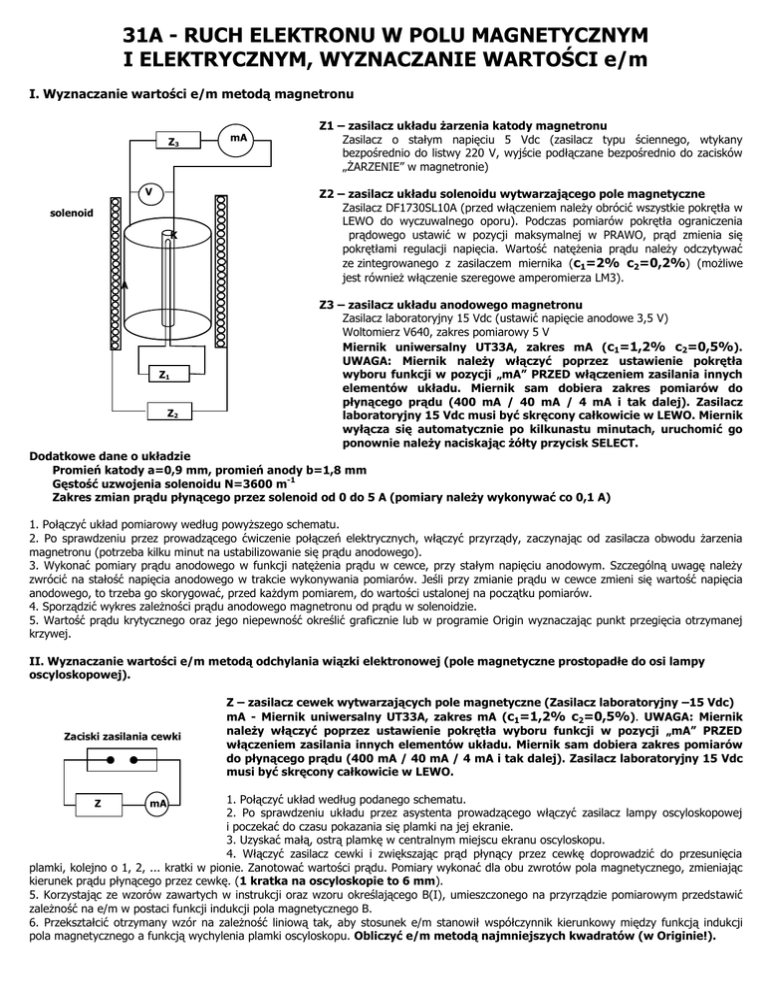 31A - RUCH ELEKTRONU W POLU MAGNETYCZNYM I ELEKTRYCZNYM, WYZNACZANIE WARTOŚCI e/m I. Wyznaczanie wartości e/m metodą magnetronu Z3 V solenoid K A Z1 Z2 mA Z1 – zasilacz układu żarzenia katody magnetronu Zasilacz o stałym napięciu 5 Vdc (zasilacz typu ściennego, wtykany bezpośrednio do listwy 220 V, wyjście podłączane bezpośrednio do zacisków „ŻARZENIE” w magnetronie) Z2 – zasilacz układu solenoidu wytwarzającego pole magnetyczne Zasilacz DF1730SL10A (przed włączeniem należy obrócić wszystkie pokrętła w LEWO do wyczuwalnego oporu). Podczas pomiarów pokrętła ograniczenia prądowego ustawić w pozycji maksymalnej w PRAWO, prąd zmienia się pokrętłami regulacji napięcia. Wartość natężenia prądu należy odczytywać ze zintegrowanego z zasilaczem miernika (c1=2% c2=0,2%) (możliwe jest również włączenie szeregowe amperomierza LM3). Z3 – zasilacz układu anodowego magnetronu Zasilacz laboratoryjny 15 Vdc (ustawić napięcie anodowe 3,5 V) Woltomierz V640, zakres pomiarowy 5 V Miernik uniwersalny UT33A, zakres mA (c1=1,2% c2=0,5%). UWAGA: Miernik należy włączyć poprzez ustawienie pokrętła wyboru funkcji w pozycji „mA” PRZED włączeniem zasilania innych elementów układu. Miernik sam dobiera zakres pomiarów do płynącego prądu (400 mA / 40 mA / 4 mA i tak dalej). Zasilacz laboratoryjny 15 Vdc musi być skręcony całkowicie w LEWO. Miernik wyłącza się automatycznie po kilkunastu minutach, uruchomić go ponownie należy naciskając żółty przycisk SELECT. Dodatkowe dane o układzie Promień katody a=0,9 mm, promień anody b=1,8 mm Gęstość uzwojenia solenoidu N=3600 m-1 Zakres zmian prądu płynącego przez solenoid od 0 do 5 A (pomiary należy wykonywać co 0,1 A) 1. Połączyć układ pomiarowy według powyższego schematu. 2. Po sprawdzeniu przez prowadzącego ćwiczenie połączeń elektrycznych, włączyć przyrządy, zaczynając od zasilacza obwodu żarzenia magnetronu (potrzeba kilku minut na ustabilizowanie się prądu anodowego). 3. Wykonać pomiary prądu anodowego w funkcji natężenia prądu w cewce, przy stałym napięciu anodowym. Szczególną uwagę należy zwrócić na stałość napięcia anodowego w trakcie wykonywania pomiarów. Jeśli przy zmianie prądu w cewce zmieni się wartość napięcia anodowego, to trzeba go skorygować, przed każdym pomiarem, do wartości ustalonej na początku pomiarów. 4. Sporządzić wykres zależności prądu anodowego magnetronu od prądu w solenoidzie. 5. Wartość prądu krytycznego oraz jego niepewność określić graficznie lub w programie Origin wyznaczając punkt przegięcia otrzymanej krzywej. II. Wyznaczanie wartości e/m metodą odchylania wiązki elektronowej (pole magnetyczne prostopadłe do osi lampy oscyloskopowej). Zaciski zasilania cewki Z – zasilacz cewek wytwarzających pole magnetyczne (Zasilacz laboratoryjny –15 Vdc) mA - Miernik uniwersalny UT33A, zakres mA (c1=1,2% c2=0,5%). UWAGA: Miernik należy włączyć poprzez ustawienie pokrętła wyboru funkcji w pozycji „mA” PRZED włączeniem zasilania innych elementów układu. Miernik sam dobiera zakres pomiarów do płynącego prądu (400 mA / 40 mA / 4 mA i tak dalej). Zasilacz laboratoryjny 15 Vdc musi być skręcony całkowicie w LEWO. 1. Połączyć układ według podanego schematu. 2. Po sprawdzeniu układu przez asystenta prowadzącego włączyć zasilacz lampy oscyloskopowej i poczekać do czasu pokazania się plamki na jej ekranie. 3. Uzyskać małą, ostrą plamkę w centralnym miejscu ekranu oscyloskopu. 4. Włączyć zasilacz cewki i zwiększając prąd płynący przez cewkę doprowadzić do przesunięcia plamki, kolejno o 1, 2, ... kratki w pionie. Zanotować wartości prądu. Pomiary wykonać dla obu zwrotów pola magnetycznego, zmieniając kierunek prądu płynącego przez cewkę. (1 kratka na oscyloskopie to 6 mm). 5. Korzystając ze wzorów zawartych w instrukcji oraz wzoru określającego B(I), umieszczonego na przyrządzie pomiarowym przedstawić zależność na e/m w postaci funkcji indukcji pola magnetycznego B. 6. Przekształcić otrzymany wzór na zależność liniową tak, aby stosunek e/m stanowił współczynnik kierunkowy między funkcją indukcji pola magnetycznego a funkcją wychylenia plamki oscyloskopu. Obliczyć e/m metodą najmniejszych kwadratów (w Originie!). Z mA