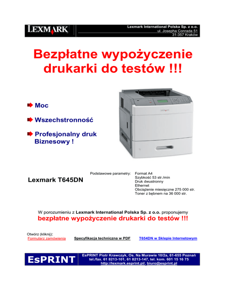 Lexmark International Polska Sp. z o.o. ul. Josepha Conrada 51 31-357 Kraków Bezpłatne wypożyczenie drukarki do testów !!! Moc Wszechstronność Profesjonalny druk Biznesowy ! Podstawowe parametry: Lexmark T645DN Format A4 Szybkość 53 str./min Druk dwustronny Ethernet Obciążenie miesięczne 275 000 str. Toner z bębnem na 36 000 str. W porozumieniu z Lexmark International Polska Sp. z o.o. proponujemy bezpłatne wypożyczenie drukarki do testów !!! Otwórz (kliknij): Formularz zamówienia Specyfikacja techniczna w PDF EsPRINT T654DN w Sklepie Internetowym EsPRINT Piotr Krawczyk, Os. Na Murawie 10/2a, 61-655 Poznań tel./fax. 61 8213-101, 61 8213-147, tel. kom. 601 15 16 75 http://lexmark.esprint.pl/, [email protected]