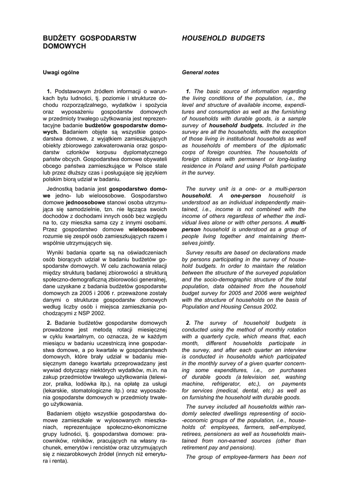 BUDŻETY GOSPODARSTW DOMOWYCH HOUSEHOLD BUDGETS Uwagi ogólne General notes 1. Podstawowym źródłem informacji o warunkach bytu ludności, tj. poziomie i strukturze dochodu rozporządzalnego, wydatków i spożycia oraz wyposażeniu gospodarstw domowych w przedmioty trwałego użytkowania jest reprezentacyjne badanie budżetów gospodarstw domowych. Badaniem objęte są wszystkie gospodarstwa domowe, z wyjątkiem zamieszkujących obiekty zbiorowego zakwaterowania oraz gospodarstw członków korpusu dyplomatycznego państw obcych. Gospodarstwa domowe obywateli obcego państwa zamieszkujące w Polsce stale lub przez dłuższy czas i posługujące się językiem polskim biorą udział w badaniu. 1. The basic source of information regarding the living conditions of the population, i.e., the level and structure of available income, expenditures and consumption as well as the furnishing of households with durable goods, is a sample survey of household budgets. Included in the survey are all the households, with the exception of those living in institutional households as well as households of members of the diplomatic corps of foreign countries. The households of foreign citizens with permanent or long-lasting residence in Poland and using Polish participate in the survey. Jednostką badania jest gospodarstwo domowe jedno- lub wieloosobowe. Gospodarstwo domowe jednoosobowe stanowi osoba utrzymująca się samodzielnie, tzn. nie łącząca swoich dochodów z dochodami innych osób bez względu na to, czy mieszka sama czy z innymi osobami. Przez gospodarstwo domowe wieloosobowe rozumie się zespół osób zamieszkujących razem i wspólnie utrzymujących się. The survey unit is a one- or a multi-person household. A one-person household is understood as an individual independently maintained, i.e., income is not combined with the income of others regardless of whether the individual lives alone or with other persons. A multiperson household is understood as a group of people living together and maintaining themselves jointly. Wyniki badania oparte są na oświadczeniach osób biorących udział w badaniu budżetów gospodarstw domowych. W celu zachowania relacji między strukturą badanej zbiorowości a strukturą społeczno-demograficzną zbiorowości generalnej, dane uzyskane z badania budżetów gospodarstw domowych za 2005 i 2006 r. przeważone zostały danymi o strukturze gospodarstw domowych według liczby osób i miejsca zamieszkania pochodzącymi z NSP 2002. Survey results are based on declarations made by persons participating in the survey of household budgets. In order to maintain the relation between the structure of the surveyed population and the socio-demographic structure of the total population, data obtained from the household budget survey for 2005 and 2006 were weighted with the structure of households on the basis of Population and Housing Census 2002. 2. Badanie budżetów gospodarstw domowych prowadzone jest metodą rotacji miesięcznej w cyklu kwartalnym, co oznacza, że w każdym miesiącu w badaniu uczestniczą inne gospodarstwa domowe, a po kwartale w gospodarstwach domowych, które brały udział w badaniu miesięcznym danego kwartału przeprowadzany jest wywiad dotyczący niektórych wydatków, m.in. na zakup przedmiotów trwałego użytkowania (telewizor, pralka, lodówka itp.), na opłatę za usługi (lekarskie, stomatologiczne itp.) oraz wyposażenia gospodarstw domowych w przedmioty trwałego użytkowania. 2. The survey of household budgets is conducted using the method of monthly rotation with a quarterly cycle, which means that, each month, different households participate in the survey, and after each quarter an interview is conducted in households which participated in the monthly survey of a given quarter concerning some expenditures, i.e., on purchases of durable goods (a television set, washing machine, refrigerator, etc.), on payments for services (medical, dental, etc.) as well as on furnishing the household with durable goods. Badaniem objęto wszystkie gospodarstwa domowe zamieszkałe w wylosowanych mieszkaniach, reprezentujące społeczno-ekonomiczne grupy ludności, tj. gospodarstwa domowe: pracowników, rolników, pracujących na własny rachunek, emerytów i rencistów oraz utrzymujących się z niezarobkowych źródeł (innych niż emerytura i renta). The survey included all households within randomly selected dwellings representing of socio-economic groups of the population, i.e., households of: employees, farmers, self-employed, retirees, pensioners as well as households maintained from non-earned sources (other than retirement pay and pensions). The group of employee-farmers has been not 172 BUDŻETY GOSPODARSTW DOMOWYCH Począwszy od 2005 r. nie wyodrębnia się grupy społeczno ekonomicznej pracowników użytkujących gospodarstwo rolne. distinguished as a social-economic group since 2005. 3. Kategorie osób występujących w gospodarstwach domowych (tabl. 1) ustalone zostały na podstawie ich głównego źródła utrzymania, czyli źródła przynoszącego największy dochód: 3. The categories of persons comprising households (table 1) were established on the basis of their primary source of maintenance, i.e., source deriving the greatest income: 1) do osób pracujących zalicza się: 1) employed persons include: a) pracujących najemnie, dla których głównym źródłem utrzymania jest dochód z pracy najemnej, niezależnie od rodzaju umowy zawartej z pracodawcą (umowa o pracę na czas nieokreślony lub określony, mianowanie, powołanie, praca sezonowa, praca dorywcza, umowa o wykonanie pracy nakładczej, umowa agencyjna, umowa-zlecenie, umowa ustna itd.); do tej grupy pracujących zaliczono również pracowników zatrudnionych w spółdzielniach produkcji rolniczej, a) hired employees, for whom the main source of maintenance is income from hired work, regardless of the type of contract concluded with the employer (a labour contract for 