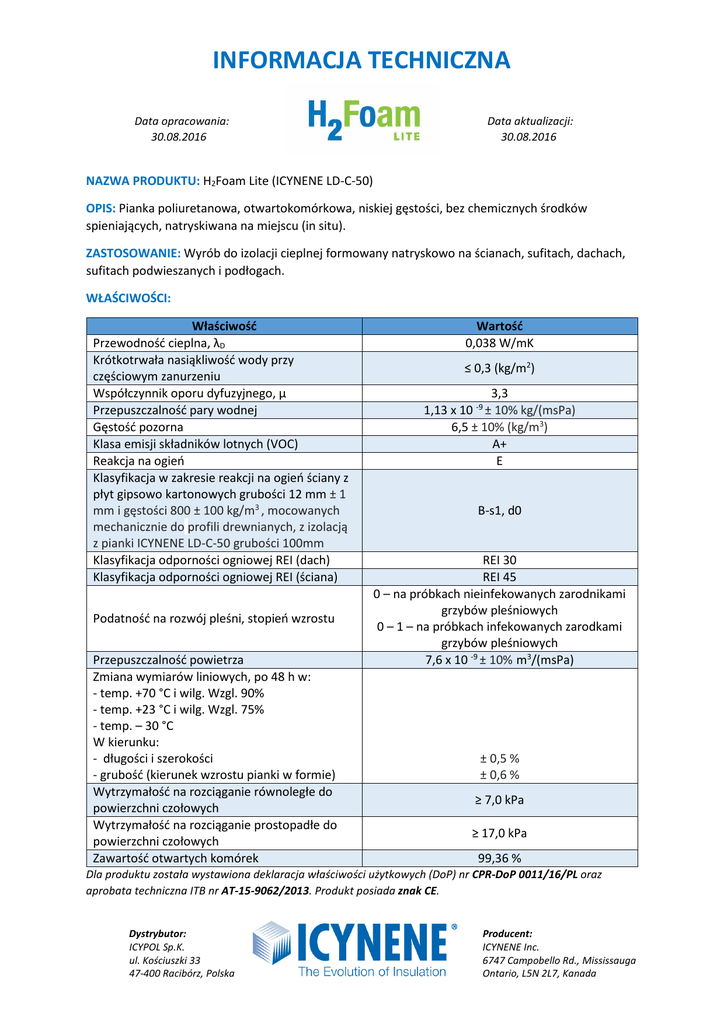 INFORMACJA TECHNICZNA Data opracowania: 30.08.2016 Data aktualizacji: 30.08.2016 NAZWA PRODUKTU: H2Foam Lite (ICYNENE LD-C-50) OPIS: Pianka poliuretanowa, otwartokomórkowa, niskiej gęstości, bez chemicznych środków spieniających, natryskiwana na miejscu (in situ). ZASTOSOWANIE: Wyrób do izolacji cieplnej formowany natryskowo na ścianach, sufitach, dachach, sufitach podwieszanych i podłogach. WŁAŚCIWOŚCI: Właściwość Przewodność cieplna, λD Krótkotrwała nasiąkliwość wody przy częściowym zanurzeniu Współczynnik oporu dyfuzyjnego, µ Przepuszczalność pary wodnej Gęstość pozorna Klasa emisji składników lotnych (VOC) Reakcja na ogień Klasyfikacja w zakresie reakcji na ogień ściany z płyt gipsowo kartonowych grubości 12 mm ± 1 mm i gęstości 800 ± 100 kg/m3 , mocowanych mechanicznie do profili drewnianych, z izolacją z pianki ICYNENE LD-C-50 grubości 100mm Klasyfikacja odporności ogniowej REI (dach) Klasyfikacja odporności ogniowej REI (ściana) Podatność na rozwój pleśni, stopień wzrostu Przepuszczalność powietrza Zmiana wymiarów liniowych, po 48 h w: - temp. +70 °C i wilg. Wzgl. 90% - temp. +23 °C i wilg. Wzgl. 75% - temp. – 30 °C W kierunku: - długości i szerokości - grubość (kierunek wzrostu pianki w formie) Wytrzymałość na rozciąganie równoległe do powierzchni czołowych Wytrzymałość na rozciąganie prostopadłe do powierzchni czołowych Zawartość otwartych komórek Wartość 0,038 W/mK ≤ 0,3 (kg/m2) 3,3 1,13 x 10 ± 10% kg/(msPa) 6,5 ± 10% (kg/m3) A+ E -9 B-s1, d0 REI 30 REI 45 0 – na próbkach nieinfekowanych zarodnikami grzybów pleśniowych 0 – 1 – na próbkach infekowanych zarodkami grzybów pleśniowych 7,6 x 10 -9 ± 10% m3/(msPa) ± 0,5 % ± 0,6 % ≥ 7,0 kPa ≥ 17,0 kPa 99,36 % Dla produktu została wystawiona deklaracja właściwości użytkowych (DoP) nr CPR-DoP 0011/16/PL oraz aprobata techniczna ITB nr AT-15-9062/2013. Produkt posiada znak CE. Dystrybutor: ICYPOL Sp.K. ul. Kościuszki 33 47-400 Racibórz, Polska Producent: ICYNENE Inc. 6747 Campobello Rd., Mississauga Ontario, L5N 2L7, Kanada