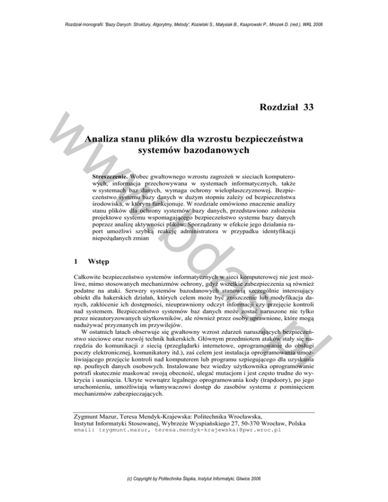 Rozdział monografii: 'Bazy Danych: Struktury, Algorytmy, Metody', Kozielski S., Małysiak B., Kasprowski P., Mrozek D. (red.), WKŁ 2006