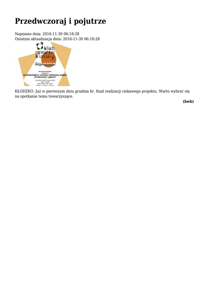Przedwczoraj i pojutrze Napisano dnia: 2016-11-30 06:18:28 Ostatnia aktualizacja dnia: 2016-11-30 06:18:28 KŁODZKO. Już w pierwszym dniu grudnia br. finał realizacji ciekawego projektu. Warto wybrać się na spotkanie temu towarzyszące. (bwb)